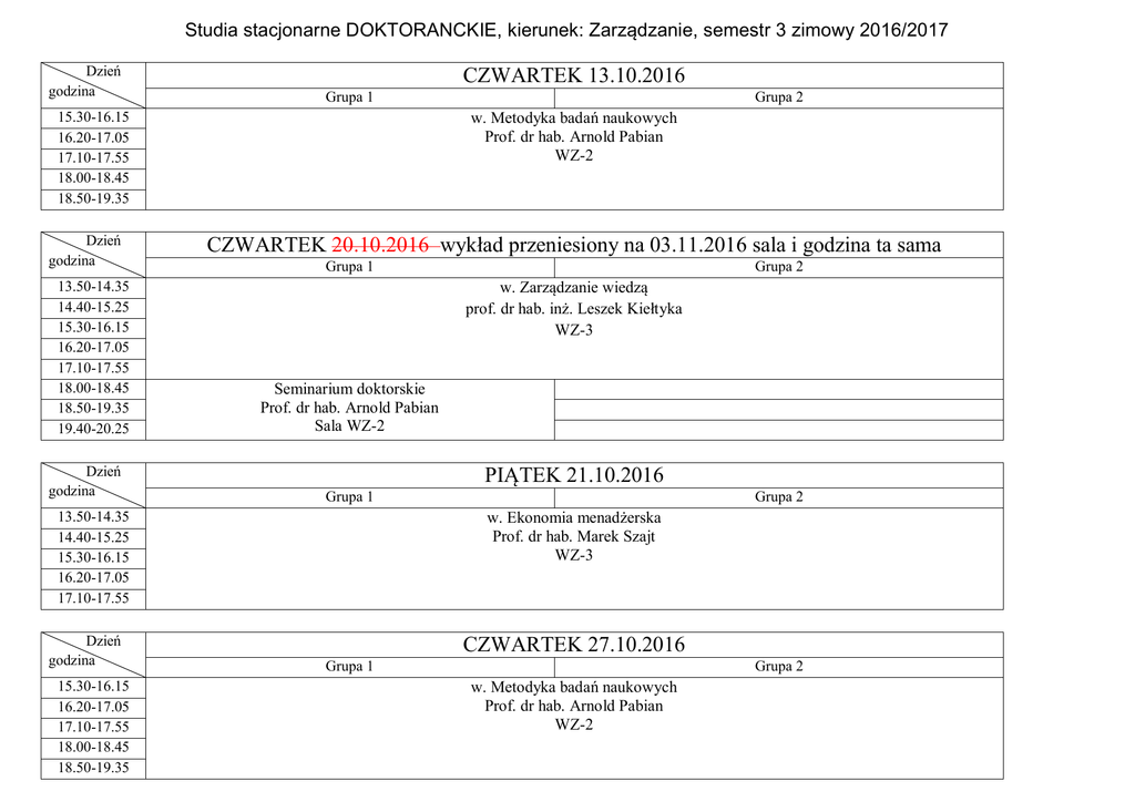 Studia stacjonarne DOKTORANCKIE, kierunek: Zarządzanie, semestr 3 zimowy 2016/2017 Dzień godzina CZWARTEK 13.10.2016 Grupa 1 15.30-16.15 16.20-17.05 17.10-17.55 18.00-18.45 18.50-19.35 Dzień godzina 13.50-14.35 14.40-15.25 15.30-16.15 16.20-17.05 17.10-17.55 18.00-18.45 18.50-19.35 19.40-20.25 Dzień godzina w. Metodyka badań naukowych Prof. dr hab. Arnold Pabian WZ-2 CZWARTEK 20.10.2016 wykład przeniesiony na 03.11.2016 sala i godzina ta sama Grupa 1 15.30-16.15 16.20-17.05 17.10-17.55 18.00-18.45 18.50-19.35 Grupa 2 w. Zarządzanie wiedzą prof. dr hab. inż. Leszek Kiełtyka WZ-3 Seminarium doktorskie Prof. dr hab. Arnold Pabian Sala WZ-2 PIĄTEK 21.10.2016 Grupa 1 13.50-14.35 14.40-15.25 15.30-16.15 16.20-17.05 17.10-17.55 Dzień godzina Grupa 2 Grupa 2 w. Ekonomia menadżerska Prof. dr hab. Marek Szajt WZ-3 CZWARTEK 27.10.2016 Grupa 1 Grupa 2 w. Metodyka badań naukowych Prof. dr hab. Arnold Pabian WZ-2 Dzień godzina PIĄTEK 28.10.2016 Grupa 1 Grupa 2 12.55-13.40 13.50-14.35 14.40-15.25 15.30-16.15 16.20-17.05 Dzień godzina Seminarium doktorskie Prof. dr hab. inż. Jerzy Szkutnik 204z CZWARTEK 10.11.2016 wykład przeniesiony na 15.12.2016, 14.40- 18.45 sala 011z Grupa 1 13.50-14.35 14.40-15.25 15.30-16.15 16.20-17.05 17.10-17.55 Dzień godzina w. Zarządzanie wiedzą prof. dr hab. inż. Leszek Kiełtyka WZ-3 PIĄTEK 18.11.2016 Grupa 1 12.55-13.40 13.50-14.35 14.40-15.25 15.30-16.15 16.20-17.05 Dzień godzina 12.55-13.40 13.50-14.35 14.40-15.25 15.30-16.15 16.20-17.05 Grupa 2 Grupa 2 Seminarium doktorskie Prof. dr hab. inż. Jerzy Szkutnik 204z Seminarium przeniesione na 09.12.2016 CZWARTEK 24.11.2016 Grupa 1 Grupa 2 w. Zarządzanie wiedzą prof. dr hab. inż. Leszek Kiełtyka WZ-3 Dzień godzina 11.05-11.50 12.00-12.45 12.55-13.40 13.50-14.35 14.40-15.25 15.30-16.15 16.20-17.05 Dzień godzina 12.55-13.40 13.50-14.35 14.40-15.25 15.30-16.15 16.20-17.05 Dzień godzina PIĄTEK 25.11.2016 Grupa 1 w. Nowoczesne metody i techniki prowadzenia zajęć dydaktycznych Prof. dr hab. Dorota Jelonek WZ-2 Seminarium doktorskie Seminarium doktorskie Prof. dr hab. Alfreda Zachorowska Prof. dr hab. inż. Jerzy Szkutnik 204z 205z 15.30-16.15 16.20-17.05 17.10-17.55 18.00-18.45 18.50-19.35 Seminarium przeniesione na 01.12.2016 Seminarium przeniesione na 15.12.2016 CZWARTEK 01.12.2016 Grupa 1 Grupa 2 Seminarium doktorskie Prof. dr hab. Arnold Pabian Sala WZ-2 Seminarium doktorskie Prof. dr hab. inż. Jerzy Szkutnik 511z PIĄTEK 02.12.2016 Grupa 1 12.55-13.40 13.50-14.35 14.40-15.25 15.30-16.15 16.20-17.05 Dzień godzina Grupa 2 Grupa 2 w. Ekonomia menadżerska Prof. dr hab. Marek Szajt WZ-3 CZWARTEK 08.12.2016 Grupa 1 Grupa 2 w. Metodyka badań naukowych Prof. dr hab. Arnold Pabian WZ-2 Dzień godzina 8.15 – 9.00 9.15-10.00 10.10-10.55 11.05-11.50 12.00-12.45 12.55-13.40 13.50-14.35 14.40-15.25 15.30-16.15 16.20-17.05 17.10-17.55 18.00-18.45 18.50-19.35 19.35-20.20 Dzień godzina 9.15-10.00 10.10-10.55 11.05-11.50 12.00-12.45 12.55-13.40 13.50-14.35 14.40-15.25 15.30-16.15 16.20-17.05 17.10-17.55 18.00-18.45 PIĄTEK 09.12.2016 Grupa 1 Grupa 2 Seminarium doktorskie Prof. dr hab. Alfreda Zachorowska 412z w. Ekonomia menadżerska Prof. dr hab. Marek Szajt 510z Seminarium doktorskie Prof. dr hab. inż. Jerzy Szkutnik 204z CZWARTEK 15.12.2016 Grupa 1 Grupa 2 Seminarium doktorskie Prof. dr hab. Alfreda Zachorowska 011z w. Zarządzanie wiedzą prof. dr hab. inż. Leszek Kiełtyka 011z Dzień godzina 12.00-12.45 12.55-13.40 13.50-14.35 PIĄTEK 13.01.2017 Grupa 1 Grupa 2 w. Nowoczesne metody i techniki prowadzenia zajęć dydaktycznych Prof. dr hab. Dorota Jelonek WZ-2