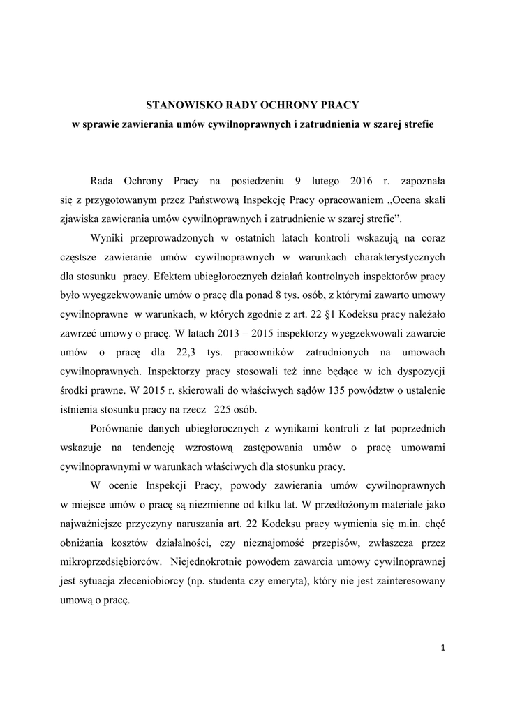 STANOWISKO RADY OCHRONY PRACY w sprawie zawierania umów cywilnoprawnych i zatrudnienia w szarej strefie Rada Ochrony Pracy na posiedzeniu 9 lutego 2016 r. zapoznała się z przygotowanym przez Państwową Inspekcję Pracy opracowaniem „Ocena skali zjawiska zawierania umów cywilnoprawnych i zatrudnienie w szarej strefie”. Wyniki przeprowadzonych w ostatnich latach kontroli wskazują na coraz częstsze zawieranie umów cywilnoprawnych w warunkach charakterystycznych dla stosunku pracy. Efektem ubiegłorocznych działań kontrolnych inspektorów pracy było wyegzekwowanie umów o pracę dla ponad 8 tys. osób, z którymi zawarto umowy cywilnoprawne w warunkach, w których zgodnie z art. 22 §1 Kodeksu pracy należało zawrzeć umowy o pracę. W latach 2013 – 2015 inspektorzy wyegzekwowali zawarcie umów o pracę dla 22,3 tys. pracowników zatrudnionych na umowach cywilnoprawnych. Inspektorzy pracy stosowali też inne będące w ich dyspozycji środki prawne. W 2015 r. skierowali do właściwych sądów 135 powództw o ustalenie istnienia stosunku pracy na rzecz 225 osób. Porównanie danych ubiegłorocznych z wynikami kontroli z lat poprzednich wskazuje na tendencję wzrostową zastępowania umów o pracę umowami cywilnoprawnymi w warunkach właściwych dla stosunku pracy. W ocenie Inspekcji Pracy, powody zawierania umów cywilnoprawnych w miejsce umów o pracę są niezmienne od kilku lat. W przedłożonym materiale jako najważniejsze przyczyny naruszania art. 22 Kodeksu pracy wymienia się m.in. chęć obniżania kosztów działalności, czy nieznajomość przepisów, zwłaszcza przez mikroprzedsiębiorców. Niejednokrotnie powodem zawarcia umowy cywilnoprawnej jest sytuacja zleceniobiorcy (np. studenta czy emeryta), który nie jest zainteresowany umową o pracę. 1 Inspekcja Pracy zaznacza, że wyeliminowanie tych przyczyn nie jest możliwe wyłącznie poprzez działania inspektorów, którzy poza prowadzeniem działań edukacyjnych i prewencyjnych nie są w stanie wpływać systemowo na zachowania pracodawców. W 2015 r. inspektorzy pracy przeprowadzili ogółem 23,2 tys. kontroli, podczas których badali legalność zatrudnienia obywateli polskich. Zweryfikowano legalność zatrudnienia 146,5 tys. osób. Kontrolą przestrzegania obowiązku opłacania składek na Fundusz Pracy objęto ponad 363 tys. osób. Powierzanie pracy bez potwierdzenia na piśmie umowy o pracę oraz niezgłoszeniu osoby zatrudnionej lub wykonującej inną pracę zarobkową do ubezpieczenia społecznego stwierdzono w około 8 tys. podmiotów tj. w 34% podmiotów objętych kontrolą. Nieprawidłowości te dotyczyły 14% osób objętych kontrolą tj. 20,5 tys. pracobiorców. W blisko 600 przypadkach wykazano równocześnie brak wstępnych badań lekarskich oraz wstępnego szkolenia w zakresie bhp. Zatrudnienie bez potwierdzenia umowy o pracę na piśmie lub niezgłoszenie do ubezpieczenia społecznego stwierdzano najczęściej w następujących sekcjach gospodarki: handel – 30% wszystkich przypadków, przetwórstwo przemysłowe – 17% oraz budownictwo – 13%. Inspektorzy pracy nadal stwierdzają naruszenia przepisów w zakresie zgłaszania osób wykonujących pracę do ubezpieczenia społecznego. Do ZUS nie zgłoszono blisko 2% sprawdzanych osób, nieterminowo zgłoszono ponad 12 % objętych kontrolą. W 2014 r. te nieprawidłowości dotyczyły 10,6%, a w 2013 r. – 9,8% objętych kontrolą. W ubiegłym roku spadła liczba ujawnionych przypadków podjęcia przez bezrobotnych zatrudnienia, innej pracy zarobkowej lub działalności bez powiadomienia o tym właściwego powiatowego urzędu pracy. Obowiązku powiadomienia nie dopełniło 8% osób. Według kontrolowanych przedsiębiorców, zasadniczym powodem powierzania przez nich pracy z naruszeniem obowiązujących przepisów prawa, są koszty pracy. PIP zwraca uwagę, że korzyści finansowe pracodawców zatrudniających nielegalnie są nieporównanie większe niż ewentualne kary za tego typu naruszenia, nakładane 2 zarówno przez organy kontroli, jak i sądy. Natomiast dla znacznej grupy pracobiorców oferta zatrudnienia nielegalnego jest jedyną, jaką mogą otrzymać. Odrębna kategoria osób świadczących pracę w szarej strefie to pracobiorcy zainteresowani wyłącznie tą formą zatrudnienia, praca legalna stanowi dla nich przeszkodę, np. w uzyskaniu określonych świadczeń z pomocy socjalnej albo pomaga uniknąć egzekwowania np. zobowiązań alimentacyjnych. PIP podkreśla, że wyniki jej kontroli nie oddają w pełni rzeczywistej skali nielegalnego zatrudnienia — zwłaszcza w budownictwie i rolnictwie. Zaznacza, że znaczna część rynku pracy nie jest objęta jej nadzorem. Zwraca uwagę, że sama Inspekcja Pracy poprzez swoją działalność nie jest w stanie w istotny sposób zmniejszyć skali zjawiska nielegalnego zatrudnienia, a tym samym usunąć jego przyczyn. Postuluje wyraźne określenie polityki państwa w zakresie ograniczania szarej strefy, w tym opracowanie kompleksowego programu walki z pracą nierejestrowaną. Konieczne jest podjęcie skutecznego działania w celu wyeliminowania zjawiska zastępowania umów o pracę umowami cywilnoprawnymi, nielegalnego zatrudnienia oraz tzw. samozatrudnienia. Te zjawiska mają negatywne konsekwencje zarówno dla pracowników, jak i pracodawców i budżetu państwa. Pracownicy pozbawieni są podstawowych praw, nie mają poczucia stabilności zatrudnienia. Dużo poważnych i dobrych firm, zatrudniających pracowników na umowę o pracę wskazuje, że stosowanie przez firmy np. nielegalnego zatrudnienia stanowi nieuczciwą konkurencję. Natomiast budżet traci należności z tytułu ubezpieczeń i podatków. Interesujące byłoby obliczenie kwoty, jaką budżet państwa traci rocznie w wyniku tych zjawisk. Rada zwraca uwagę na konieczność systemowych zmian na rynku pracy. Naruszanie prawa w zakresie form zatrudnienia musi przestać być opłacalne. W celu ograniczenia możliwości powierz