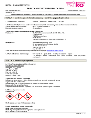 Lotnik KARTA CHARAKTERYSTYKI SPRAY CYNKOWY NAPRAWCZY 400ml Data wydania 15.11.2011 Wersja PL: 3.0 Data aktualizacji: 13.02.2015 Karta Charakterystyki jest zgodna z Rozporządzeniem WE 1907/2006 z 18.12.2006 – REACH oraz 453/2010 z 20.05.2010r. SEKCJA 1: Identyfikacja substancji/mieszaniny i identyfikacja przedsiębiorstwa 1.1 Identyfikator produktu: SPRAY CYNKOWY NAPRAWCZY 400ml 1.2 Istotne zidentyfikowane zastosowania substancji lub mieszaniny oraz zastosowania odradzane: Zastosowanie zidentyfikowane: spray cynkowy naprawczy Zastosowanie odradzane: nie określono 1.3 Dane dotyczące dostawcy karty charakterystyki: Producent: GLUETEC Industrieklebstoffe GmbH & Co. KG. Am Biotop 8a 97259 Greußenheim Deutschland Tel. 049 9369 9836 – 0, Fax. 049 9369 9836 – 10 Dystrybutor: WIKO Klebetechnik Sp. z o.o. Ul. Marszałka Rydza-Śmigłego 36/38 42-200 Częstochowa Tel. 034 372 58 58 Fax 034 371 11 14 Adres e-mail osoby odpowiedzialnej za kartę charakterystyki: [email protected] 1.4 Numer telefonu alarmowego: 034 372 58 58 – godz. 8.00 – 16.00 (poniedziałek – piątek) 112 (ogólny telefon alarmowy), 998 (straż pożarna), 999 (pogotowie medyczne); SEKCJA 2: Identyfikacja zagrożeń 2.1 Klasyfikacja substancji lub mieszaniny Klasyfikacja wg 1272/2008 Aerosol 1; H222; H229 Asp. Tox. 1; H304 Skin Irrit. 2; H315 Eye Irrit. 2; H319 STOT SE 3; H336 Aquatic Chronic 2; H41 Zagrożenie dla zdrowia człowieka Działa drażniąco na oczy i skórę. Może spowodować senność lub zawroty głowy Zagrożenie dla środowiska Działa toksycznie na organizmy wodne, powodując długotrwałe zmiany Zagrożenia fizyczne/chemiczne Skrajnie łatwopalny aerozol. Pojemnik pod ciśnieniem: ogrzanie grozi wybuchem 2.2 Elementy oznakowania: Piktogramy: Hasło ostrzegawcze: Niebezpieczeństwo Zwroty wskazujące rodzaj zagrożenia: H222 Skrajnie łatwopalny aerozol H229 Pojemnik pod ciśnieniem: ogrzanie grozi wybuchem H315 Działa drażniąco na skórę Strona 1 z 12 Lotnik KARTA CHARAKTERYSTYKI SPRAY CYNKOWY NAPRAWCZY 400ml Data wydania 15.11.2011 Wersja PL: 3.0 Data aktualizacji: 13.02.2015 Karta Charakterystyki jest zgodna z Rozporządzeniem WE 1907/2006 z 18.12.2006 – REACH oraz 453/2010 z 20.05.2010r. H319 Działa drażniąco na oczy. H336 Może spowodować senność lub zawroty głowy H411 Działa toksycznie na organizmy wodne, powodując długotrwałe zmiany EUH066 Powtarzające się narażenie może powodować wysuszanie lub pękanie skóry Zwroty określające środki bezpieczeństwa: P102 Chronić przed dziećmi. P210 Przechowywać z dala od źródeł ciepła, gorących powierzchni, źródeł iskrzenia, otwartego ognia i innych źródeł zapłonu. Nie palić. P211 Nie rozpylać nad otwartym ogniem lub innym źródłem zapłonu. P251 Nie przekłuwać ani nie spalać, nawet po zużyciu. P261 Unikać wdychania rozpylonej cieczy. P271 Stosować wyłącznie na zewnątrz lub w dobrze wentylowanym pomieszczeniu P280 Stosować rękawice ochronne/odzież ochronną/ochronę oczu/ochronę twarzy P308+P311 W przypadku narażenia lub styczności: skontaktować się z OŚRODKIEM ZATRUĆ/ lekarzem o o P410+P412 Chronić przed światłem słonecznym. Nie wystawiać na działanie temperatury przekraczającej 50 C/122 F P501 Zawartość / pojemnik usuwać na składowisko odpadów niebezpiecznych Zawiera: Aceton, ksylen (izomery), węglowodory C9, aromatyczne i węglowodory C7, n-alkany, izoalkany, cykliczne. Zawiera oksym butan-2-onu. Może powodować wystąpienie reakcji alergicznej 2.3 Inne zagrożenia: Podgrzewanie powyżej 50°C prowadzi do wzrostu ciśnienia wewnątrz pojemnika i jego rozerwanie. Przy braku właściwej wentylacji tworzyć się mogą mieszanki wybuchowe z powietrzem. Wdychanie może powodować podrażnienie błon śluzowych układu pokarmowego. W wyższych dawkach może mieć działanie narkotyczne. Ryzyko wystąpienia kwasicy metabolicznej. Brak informacji na temat spełnienia kryteriów PBT lub vPvB zgodnie z załącznikiem XIII rozporządzenia REACH. Odpowiednie badania nie były przeprowadzone. SEKCJA 3: Skład/informacja o składnikach 3.1 Substancje: Nie dotyczy. 3.2 Mieszaniny: Niebezpieczne składniki: Identyfikator produktu Zawartość % Aceton CAS: 67-64-1 WE: 200-662-2 Nr indeksowy: 606-001-00-8 Nr REACH: substancja podlega przepisom okresu przejściowego 20 – 25 Eter dimetylowy CAS: 115-10-6 WE: 204-065-8 Nr indeksowy: 603-019-00-8 Nr REACH: substancja podlega przepisom okresu przejściowego 10 - 20 Klasyfikacja CLP Flam. Liq. 2; H225 Eye Irrit. 2; H319 STOT SE 3; H336 Flam. Gas. 1; H220 Press. Gas; H280 Strona 2 z 12 Lotnik KARTA CHARAKTERYSTYKI SPRAY CYNKOWY NAPRAWCZY 400ml Data wydania 15.11.2011 Wersja PL: 3.0 Data aktualizacji: 13.02.2015 Karta Charakterystyki jest zgodna z Rozporządzeniem WE 1907/2006 z 18.12.2006 – REACH oraz 453/2010 z 20.05.2010r. Węglowodory C7, n-alkany, izoalkany, cykliczne CAS: WE: 927-510-4 Nr indeksowy: Nr REACH: 01-2119475515-33-XXXX Węglowodory C6-C7, n-alkany, izoalkany, cykliczne, <5% n-heksanu CAS: WE: 921-024-6 Nr indeksowy: Nr REACH: 01-2119475515-33-XXXX Węglowodory C9, aromatyczne CAS: WE: 918-668-5 Nr indeksowy: Nr REACH: 01-2119455851-35-xxxx Ksylen, mieszanina izomerów CAS: 1330-20-7 WE: 215-535-7 Nr indeksowy: 601-022-00-9 Nr REACH: 02-2119752448-30-xxxx 2,5 – 10 Flam. Liq. 2; H225 Asp. Tox. 1; H304 STOT SE 3; H336 Skin Irrit.2; H315 Aquatic Chronic 2;H411 2,5 – 10 Flam. Liq. 2; H225 Asp. Tox. 1; H304 STOT SE 3; H336 Skin Irrit.2; H315 Aquatic Chronic 2;H411 2,5 – 10 Flam. Liq. 3; H226 Asp. Tox. 1; H304 STOT SE 3; H335; H336 Aquatic Chronic 2;H411 10 – 20 Flam. Liq. 3; H226 Acute Tox. 4; H332; H312 Skin Irrit. 2; H315 Propan CAS: 74-98-6 WE: 200-827-9 Nr indeksowy: 601-003-00-5 Nr REACH: substancja podlega przepisom okresu przejściowego 2,5 - 10 n-Butan CAS: 106-97-8 WE: 203-448-7 Nr indeksowy: 601-004-00-0 Nr REACH: substancja podlega przepisom okresu przejściowego 2,5 - <10 Flam. Gas 1, H220 Press. Gas; H280 Izobutan 