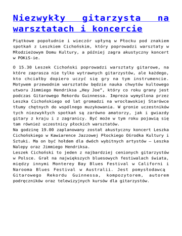 Niezwykły gitarzysta warsztatach i koncercie na Piątkowe popołudnie i wieczór upłyną w Płocku pod znakiem spotkań z Leszkiem Cichońskim, który poprowadzi warsztaty w Młodzieżowym Domu Kultury, a później zagra akustyczny koncert w POKiS-ie. O 15.30 Leszek Cichoński poprowadzi warsztaty gitarowe, na które zaprasza nie tylko wytrawnych gitarzystów, ale każdego, kto chciałby dopiero uczyć się gry na tym instrumencie. Motywem przewodnim warsztatów będzie nauka chwytów kultowego utworu Jimmiego Hendriksa „Hey Joe”, który co roku grany jest podczas Gitarowego Rekordu Guinnessa. Impreza wymyślona przez Leszka Cichońskiego od lat gromadzi na wrocławskiej Starówce tłumy chętnych do wspólnego muzykowania. W gronie uczestników tych niezwykłych spotkań są zarówno amatorzy, jak i gwiazdy gitary z kraju i z zagranicy. Być może w tym roku pojawią się tam również uczestnicy płockich warsztatów. Na godzinę 19.00 zaplanowany został akustyczny koncert Leszka Cichońskiego w Kawiarence Jazzowej Płockiego Ośrodka Kultury i Sztuki. Ma on być hołdem dla dwóch wybitnych artystów – Leszka Nalepy oraz Jimmiego Hendriksa. Leszek Cichoński to jeden z najbardziej cenionych gitarzystów w Polsce. Grał na największych bluesowych festiwalach świata, między innymi Monterey Bay Blues Festival w Californi i Narooma Blues Festival w Australii. Jest pomysłodawcą Gitarowego Rekordu Guinnessa, kompozytorem, autorem podręczników oraz telewizyjnych kursów dla gitarzystów.