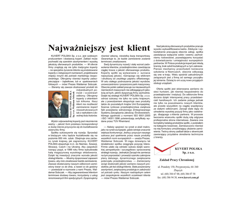 Najważniejszy jest klient Prezes KUVERT POLSKA Sp. z o.o. Waldemar Sobczak KUVERT POLSKA Sp. z o.o. jest czołowym producentem i dostawcą kopert. Zakład może pochwalić się szerokim asortymentem i wysoką jakością oferowanych produktów. — W ofercie firmy znajdują się nie tylko tradycyjne koperty – na specjalne życzenie klienta są produkowane koperty o nietypowych rozmiarach, projektowane między innymi dla potrzeb marketingu bezpośredniego. Oferujemy również koperty zabezpieczające – bąbelkowe, lub w opakowaniach foliowych — mówi Prezes Waldemar Sobczak. — Staramy się zawsze dostosować produkt do indywidualnych potrzeb i oczekiwań odbiorcy. Oferujemy koperty z okienkiem lub kilkoma. Nasz klient ma możliwość zamówienia kopert niezadrukowanych lub z nadrukiem o dowolnej ilości kolorów. Wybór odpowiedniej koperty jest niezmiernie ważny – jakość form przekazu korespondencji w dużej mierze przyczynia się do kształtowania wizerunku firmy. Spółka sukcesywnie się rozwija. Sprzedaż w bieżącym roku będzie kształtowała się na poziomie 850 mln. sztuk. Obejmuje ona zarówno rynek krajowy, jak zagraniczny. KUVERT POLSKA eksportuje m.in. do Niemiec, Szwecji, Słowacji, Czech i na Ukrainę. Aby zaspokoić rosnący popyt, w 1999 roku firma wybudowała halę magazynową wysokiego składowania. Dzięki tej inwestycji znacznie wzrosła jakość obsługi klienta. — Musimy dysponować zapasem towaru, aby móc zrealizować każde zamówienie. Zawsze dostarczamy naszym odbiorcom zamówiony towar co do dnia, a nawet co do godziny — powiedział w rozmowie z nami Prezes, Waldemar Sobczak. — Aby zagwarantować klientom terminowe dostawy towaru, korzystamy z usług renomowanych firm spedycyjnych. Dysponujemy również własną, niewielką bazą transportową. Gwarantuje to, że każde zamówienie zostanie terminowo zrealizowane. Swój dynamiczny rozwój i stały wzrost zadowolenia klientów, przedsiębiorstwo zawdzięcza ciągłej trosce o jakość oferowanego produktu. Koperty spółki są wytwarzane z surowca najwyższej jakości, różniącego się włóknem i strukturą od zwykłego papieru offsetowego. W celu stałego podnoszenia jakości wyrobów, unowocześniono i poszerzono park maszynowy. Obecnie polski zakład pracuje na niezawodnych niemieckich maszynach nie odbiegających jakością od tych, jakimi dysponują firmy zachodnie. Dzięki tej strategii KUVERT POLSKA Sp. z o.o. odnosi sukcesy nie tylko na rynku krajowym, ale z powodzeniem eksportuje swe produkty także do pozostałych krajów Unii Europejskiej. Szanse rynkowe przedsiębiorstwa zwiększa fakt posiadania wdrożonego Zintegrowanego Systemu Zarządzania Jakością i Środowiskiem, którego zgodność z normami ISO 9001:2000 i ISO 14001:1996 potwierdzają certyfikaty wydane przez TÜV Rheinland. — Należy spojrzeć na rynek w skali makro, jako na rynek europejski, gdzie istnieje znacznie większa konkurencja. Jedną z przyczyn naszego sukcesu jest spełnienie przez nasze produkty wszelkich norm europejskich — uważa Prezes, Waldemar Sobczak. W ciągu dziewięciu lat działalności spółka osiągnęła pozycję lidera. Firmie udało się odnieść sukces dzięki szerokiej perspektywie i szczegółowo opracowanej strategii rozwoju. Jednakże Zarząd nie zamierza na tym poprzestać i prowadzi szeroko zakrojone plany dalszego, dynamicznego zwiększania potencjału przedsiębiorstwa. — Zamierzamy wciąż doskonalić jakość zarówno naszych produktów, jak też obsługi klienta. Stale poszerzamy asortyment, zwiększamy produkcję w zależności od potrzeb rynku. Naszym nadrzędnym celem jest zaspokojenie wszelkich oczekiwań klienta — mówi Prezes Waldemar Sobczak. Nad jakością oferowanych produktów pracuje wysoko wykwalifikowana kadra. Zdobycie i wykształcenie pracującej obecnie załogi, spółka zawdzięcza wyłącznie sobie i swemu zachodniemu rodowodowi, pozwalającemu korzystać z doświadczenia i umiejętności europejskich partnerów. W Polsce produkcja kopert jest młodą branżą, brak szkół kształcących w tym zakresie. Pierwsi mechanicy przechodzili konieczne szkolenia w Niemczech, obecnie odbywają się one w kraju. Wielu spośród zatrudnionych związanych jest z firmą od samego początku jej istnienia. Dzisiaj to oni uczą nowo przyjętych obsługi urządzeń. Oferta spółki jest skierowana zarówno do sieci hurtowni, jak również bezpośrednio do przedsiębiorstw i instytucji. Do odbiorców firma dociera dzięki intensywnej pracy przedstawicieli handlowych. Ich zadanie polega jednak nie tylko na poszukiwaniu nowych klientów, ale przede wszystkim na ciągłej współpracy ze stałymi odbiorcami. Zarząd stale dąży do utrwalenia wysokiej pozycji firmy jako rzetelnego, dbającego o klienta partnera. W procesie tworzenia wizerunku spółki dużą rolę odgrywa profesjonalna strona internetowa. Zawiera ona kompletny katalog produktów spółki, z podziałem na kategorie towarowe. Zamieszczono również na niej formularz umożliwiający złożenie zamówienia. Twórcy strony zadbali także o słowniczek zawierający przydatne określenia techniczne z branży. KUVERT POLSKA Sp. z o.o. Zakład Pracy Chronionej ul. Prandoty 150, Przyprostynia, 64–360 Zbąszyń tel. (68) 384 67 00, (68) 386 07 58 fax: (68) 386 94 30, www.kuvert.com.pl