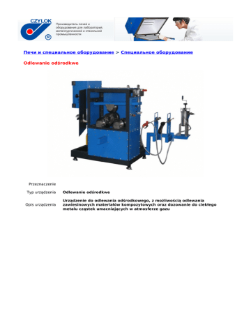 Печи и специальное оборудование > Специальное оборудование Odlewanie odśrodkwe Przeznaczenie Typ urządzenia Opis urządzenia Odlewanie odśrodkwe Urządzenie do odlewania odśrodkowego, z możliwością odlewania zawiesinowych materiałów kompozytowych oraz dozowanie do ciekłego metalu cząstek umacniających w atmosferze gazu Urządzenie do odlewania odśrodkowego z możliwością odlewania zawiesinowych materiałów kompozytowych. Koncepcję stanowiska opracowano w zespole Profesora J. Śleziony w Laboratorium Kompozytów Metalowych na Wydziale Inżynierii Materiałowej i Metalurgii, Politechniki Śląskiej. Budowę prototypowego urządzenia sfinansowano ze środków projektu: „Opracowanie technologii wytwarzania tłoków kompozytowych do sprężarek powietrza” realizowanego w ramach dofinansowania przez Narodowe Centrum Badań i Rozwoju w ramach VI konkursu na projekty rozwojowe, projekt N RO7 001106 (kontakt: [email protected], anna.dolata - [email protected]) Если у Вас возникли вопросы, пожалуйста, свяжитесь с нами: тел: +48 32 47 07 495 тел /факс +48 32 47 07 502 e-mail: [email protected]