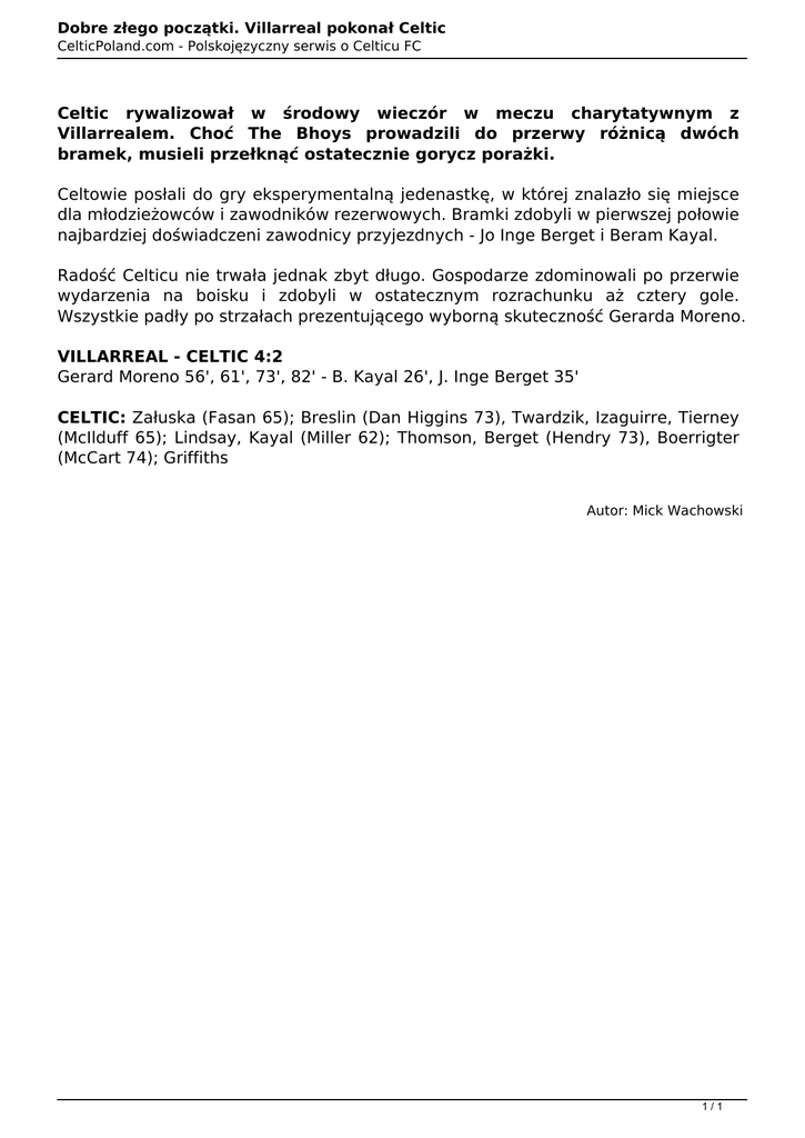 Dobre złego początki. Villarreal pokonał Celtic CelticPoland.com - Polskojęzyczny serwis o Celticu FC Celtic rywalizował w środowy wieczór w meczu charytatywnym z Villarrealem. Choć The Bhoys prowadzili do przerwy różnicą dwóch bramek, musieli przełknąć ostatecznie gorycz porażki. Celtowie posłali do gry eksperymentalną jedenastkę, w której znalazło się miejsce dla młodzieżowców i zawodników rezerwowych. Bramki zdobyli w pierwszej połowie najbardziej doświadczeni zawodnicy przyjezdnych - Jo Inge Berget i Beram Kayal. Radość Celticu nie trwała jednak zbyt długo. Gospodarze zdominowali po przerwie wydarzenia na boisku i zdobyli w ostatecznym rozrachunku aż cztery gole. Wszystkie padły po strzałach prezentującego wyborną skuteczność Gerarda Moreno. VILLARREAL - CELTIC 4:2 Gerard Moreno 56', 61', 73', 82' - B. Kayal 26', J. Inge Berget 35' CELTIC: Załuska (Fasan 65); Breslin (Dan Higgins 73), Twardzik, Izaguirre, Tierney (McIlduff 65); Lindsay, Kayal (Miller 62); Thomson, Berget (Hendry 73), Boerrigter (McCart 74); Griffiths Autor: Mick Wachowski 1/1 Powered by TCPDF (www.tcpdf.org)