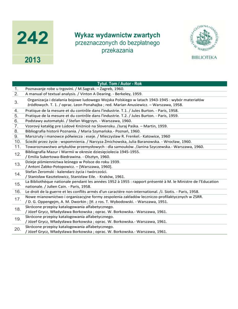 242 Wykaz wydawnictw zwartych przeznaczonych do bezpłatnego przekazania 2013 Tytuł. Tom / Autor - Rok 1. 2. 3. 4. 5. 6. 7. 8. 9. 10. 11. 12. 13. 14. 15. 16. 17. 18. 19. 20. Poznavanje robe u trgovini. / M.Sagrak. – Zagreb, 1960. A manual of textual analysis. / Vinton A Dearing. - Berkeley, 1959. Organizacja i działania bojowe ludowego Wojska Polskiego w latach 1943-1945 : wybór materiałów źródłowych. T. 1. / oprac. Leon Ponahajba ; red. Marian Anusiewicz. – Warszawa, 1958. Prati ue de la mesure et du contr le dans l industrie. T.1. / Jules Burton. - Paris, 1958. Prati ue de la mesure et du contr le dans l industrie. T.2. / Jules Burton. - Paris, 1959. Podstawy automatyki. / Stefan Węgrzyn. - Warszawa, 1960. zoro katalóg re do ni nic na Slo ensku. /Juraj Paśka. – Martin, 1959. Bibliografia historii Poznania. / Maria Szymaoska.- Poznao, 1960. Marszruty i manowce ółwiecza : eseje. / Mieczyslaw R. Frenkel.- Katowice, 1960 Ście ki rzez ycie : ws omnienia. / Narcyza Żmichowska, Julia Baranowska. - Wrocław, 1960. Towaroznawstwo artykułów rzemysłowych : dla samouków. /Janina Szyczewska.- Warszawa, 1960. Bibliografia Mazur i Warmii w okresie dziesięciolecia 1945-1955. / Emilia Sukertowa-Biedrawina. - Olsztyn, 1960. Dzieje iśmiennictwa leśnego w Polsce do roku 1939. / Antoni Żabko-Potopowicz. – [Warszawa, 1960]. Stefan Żeromski : kalendarz ycia i twórczości. / Stanisław asztelowicz, Stanisław Eile. - raków, 1961. a Biblioth ue nationale endant les ann es 1952 1955 : ra ort r sent M. le Ministre de l Education nationale. / Julien Cain. - Paris, 1958. e droit de la guerre et les conflits arm s d un caract re non-international. /J. Siotis. - Paris, 1958. Nowe mianownictwo i organizacyjne formy zes olenia zakładów leczniczo-profilaktycznych w ZSRR. / D. G. O engejm, A. M. Dworkin ; [tł. z ros. T. Wybodowski. - Warszawa, 1951. Skrócone rze isy katalogowania alfabetycznego. / Józef Grycz, Władysława Borkowska ; oprac. W. Borkowska.- Warszawa, 1961. Skrócone rze isy katalogowania alfabetycznego. / Józef Grycz, Władysława Borkowska ; o rac. W. Borkowska.- Warszawa, 1961. Skrócone rze isy katalogowania alfabetycznego. / Józef Grycz, Władysława Borkowska ; oprac. W. Borkowska.- Warszawa, 1961.