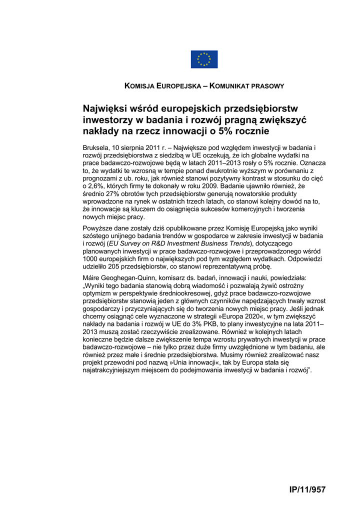 KOMISJA EUROPEJSKA – KOMUNIKAT PRASOWY Najwięksi wśród europejskich przedsiębiorstw inwestorzy w badania i rozwój pragną zwiększyć nakłady na rzecz innowacji o 5% rocznie Bruksela, 10 sierpnia 2011 r. – Największe pod względem inwestycji w badania i rozwój przedsiębiorstwa z siedzibą w UE oczekują, że ich globalne wydatki na prace badawczo-rozwojowe będą w latach 2011–2013 rosły o 5% rocznie. Oznacza to, że wydatki te wzrosną w tempie ponad dwukrotnie wyższym w porównaniu z prognozami z ub. roku, jak również stanowi pozytywny kontrast w stosunku do cięć o 2,6%, których firmy te dokonały w roku 2009. Badanie ujawniło również, że średnio 27% obrotów tych przedsiębiorstw generują nowatorskie produkty wprowadzone na rynek w ostatnich trzech latach, co stanowi kolejny dowód na to, że innowacje są kluczem do osiągnięcia sukcesów komercyjnych i tworzenia nowych miejsc pracy. Powyższe dane zostały dziś opublikowane przez Komisję Europejską jako wyniki szóstego unijnego badania trendów w gospodarce w zakresie inwestycji w badania i rozwój (EU Survey on R&D Investment Business Trends), dotyczącego planowanych inwestycji w prace badawczo-rozwojowe i przeprowadzonego wśród 1000 europejskich firm o największych pod tym względem wydatkach. Odpowiedzi udzieliło 205 przedsiębiorstw, co stanowi reprezentatywną próbę. Máire Geoghegan-Quinn, komisarz ds. badań, innowacji i nauki, powiedziała: „Wyniki tego badania stanowią dobrą wiadomość i pozwalają żywić ostrożny optymizm w perspektywie średniookresowej, gdyż prace badawczo-rozwojowe przedsiębiorstw stanowią jeden z głównych czynników napędzających trwały wzrost gospodarczy i przyczyniających się do tworzenia nowych miejsc pracy. Jeśli jednak chcemy osiągnąć cele wyznaczone w strategii »Europa 2020«, w tym zwiększyć nakłady na badania i rozwój w UE do 3% PKB, to plany inwestycyjne na lata 2011– 2013 muszą zostać rzeczywiście zrealizowane. Również w kolejnych latach konieczne będzie dalsze zwiększenie tempa wzrostu prywatnych inwestycji w prace badawczo-rozwojowe – nie tylko przez duże firmy uwzględnione w tym badaniu, ale również przez małe i średnie przedsiębiorstwa. Musimy również zrealizować nasz projekt przewodni pod nazwą »Unia innowacji«, tak by Europa stała się najatrakcyjniejszym miejscem do podejmowania inwestycji w badania i rozwój”. IP/11/957 Objęte badaniem przedsiębiorstwa oczekują, że dokonywane przez nie w UE inwestycje w badania i rozwój będą przez najbliższe trzy lata rosły o 3% rocznie. Wskaźnik ten jest wprawdzie niższy niż oczekiwane tempo wzrostu inwestycji tych przedsiębiorstw w badania i rozwój w pozostałych regionach świata, jednak nadal zakładają one, że 75% ich inwestycji przypadnie na UE. Największego procentowego wzrostu swoich nakładów na badania i rozwój firmy spodziewają się w Chinach (o 25%), Japonii (17%), pozostałych krajach europejskich (8%), Indiach (8%) oraz w Stanach Zjednoczonych i Kanadzie (5%). Na podstawie tego trendu – widocznego już w wynikach trzech spośród czterech ostatnich badań – można sądzić, że firmy z siedzibą w UE pragną skorzystać ze wzrostu gospodarczego w szybko rozwijających się gospodarkach, a jednocześnie utrzymać znaczne zaangażowanie w UE. Potwierdzają to dane przedsiębiorstw dotyczące nominalnej wysokości nakładów na badania i rozwój, które w ciągu najbliższych trzech lat mają wzrosnąć o 2,2 mld euro w UE i o 2,7 mld euro poza Unią. Wśród głównych czynników, które mają pozytywny wpływ na innowacje, wymieniano dostępność wykwalifikowanych pracowników oraz wsparcie publiczne w postaci dotacji i zachęt podatkowych. Za istotne uznano również możliwości współpracy z innymi podmiotami, np. instytucjami szkolnictwa wyższego. We wszystkich sektorach jako czynniki negatywne postrzegano koszty egzekwowania praw własności intelektualnej oraz nakład czasu niezbędny pierwotnie do uzyskania ochrony tych praw. Podkreśla to wagę wspierania sprzyjającego innowacjom systemu ochrony praw własności intelektualnej – proponowany jednolity patent unijny będzie stanowił w tym względzie istotny krok naprzód. W październiku 2011 r. Komisja Europejska opublikuje najnowsze unijne zestawienie danych dotyczących inwestycji w badania i rozwój w przemyśle, zawierające ranking 1000 największych pod tym względem przedsiębiorstw unijnych, jak również 1000 ich odpowiedników spoza UE, sporządzony na podstawie inwestycji faktycznie dokonanych w 2010 r. Kontekst Unijne badanie trendów w gospodarce w zakresie inwestycji w badania i rozwój Unijne badanie trendów w gospodarce w zakresie inwestycji w badania i rozwój (EU Survey on R&D Investment Business Trends) zostało przeprowadzone przez wewnętrzny instytut naukowy Komisji Europejskiej (Wspólne Centrum Badawcze) oraz Dyrekcję Generalną ds. Badań Naukowych i Innowacji. Wyniki badania są oparte na odpowiedziach udzielonych przez 205 – w większości dużych – przedsiębiorstw należących do grona 1000 firm z siedzibą w UE, które zostały uwzględnione w unijnym zestawieniu danych dotyczących inwestycji w badania i rozwój w przemyśle z roku 2010. Tych 205 przedsiębiorstw przeznacza łącznie niemal 40 mld euro na badania i rozwój, co stanowi około 30% łącznych środków wydawanych na ten cel przez 1000 firm uwzględnionych w unijnym zestawieniu wyników, a tym samym znaczny odsetek ogółu inwestycji europejskich przedsiębiorstw w badania i rozwój. Pełne sprawozdanie jest dostępne na stronie: http://iri.jrc.es/reports.htm Dodatkowe informacje nt. unijnego zestawienia danych dotyczących inwestycji w badania i rozwój w przemyśle: IP/10/1379 2 Kontakt: Mark English (+32 22962410) Monika Wcislo (+32 22986595) 3