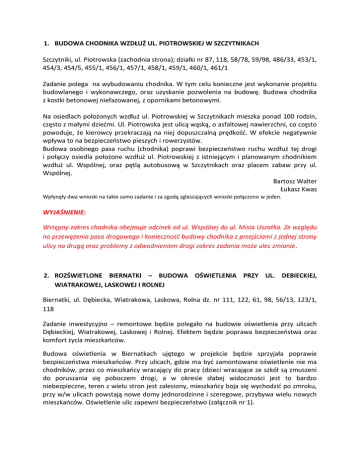 1. BUDOWA CHODNIKA WZDŁUŻ UL. PIOTROWSKIEJ W SZCZYTNIKACH Szczytniki, ul. Piotrowska (zachodnia strona); działki nr 87, 118, 58/78, 59/98, 486/33, 453/1, 454/3, 454/5, 455/1, 456/1, 457/1, 458/1, 459/1, 460/1, 461/1 Zadanie polega na wybudowaniu chodnika. W tym celu konieczne jest wykonanie projektu budowlanego i wykonawczego, oraz uzyskanie pozwolenia na budowę. Budowa chodnika z kostki betonowej niefazowanej, z opornikami betonowymi. Na osiedlach położonych wzdłuż ul. Piotrowskiej w Szczytnikach mieszka ponad 100 rodzin, często z małymi dziećmi. Ul. Piotrowska jest ulicą wąską, o asfaltowej nawierzchni, co często powoduje, że kierowcy przekraczają na niej dopuszczalną prędkość. W efekcie negatywnie wpływa to na bezpieczeństwo pieszych i rowerzystów. Budowa osobnego pasa ruchu (chodnika) poprawi bezpieczeństwo ruchu wzdłuż tej drogi i połączy osiedla położone wzdłuż ul. Piotrowskiej z istniejącym i planowanym chodnikiem wzdłuż ul. Wspólnej, oraz pętlą autobusową w Szczytnikach oraz placem zabaw przy ul. Wspólnej. Bartosz Walter Łukasz Kwas Wpłynęły dwa wnioski na takie samo zadanie i za zgodą zgłaszających wnioski połączono w jeden. WYJAŚNIENIE: Wstępny zakres chodnika obejmuje odcinek od ul. Wspólnej do ul. Misia Uszatka. Ze względu na przewężenia pasa drogowego i konieczność budowy chodnika z przejściami z jednej strony ulicy na drugą oraz problemy z odwodnieniem drogi zakres zadania może ulec zmianie. 2. ROZŚWIETLONE BIERNATKI – BUDOWA OŚWIETLENIA PRZY UL. DEBIECKIEJ, WIATRAKOWEJ, LASKOWEJ I ROLNEJ Biernatki, ul. Dębiecka, Wiatrakowa, Laskowa, Rolna dz. nr 111, 122, 61, 98, 56/13, 123/1, 118 Zadanie inwestycyjno – remontowe będzie polegało na budowie oświetlenia przy ulicach Dębieckiej, Wiatrakowej, Laskowej i Rolnej. Efektem będzie poprawa bezpieczeństwa oraz komfort życia mieszkańców. Budowa oświetlenia w Biernatkach ujętego w projekcie będzie sprzyjała poprawie bezpieczeństwa mieszkańców. Przy ulicach, gdzie ma być zamontowane oświetlenie nie ma chodników, przez co mieszkańcy wracający do pracy (dzieci wracające ze szkół są zmuszeni do poruszania się poboczem drogi, a w okresie słabej widoczności jest to bardzo niebezpieczne, teren z wielu stron jest zalesiony, mieszkańcy boja się wychodzić po zmroku, przy w/w ulicach powstają nowe domy jednorodzinne i szeregowe, przybywa wielu nowych mieszkańców. Oświetlenie ulic zapewni bezpieczeństwo (załącznik nr 1). Budowa oświetlenia w Biernatkach ujętego w projekcie będzie sprzyjała poprawie bezpieczeństwa mieszkańców. Przy ulicach gdzie ma być zamontowane oświetlenie nie ma chodników, przez co mieszkańcy wracający z pracy i dzieci wracające ze szkół są zmuszeni do poruszania się poboczem drogi, a w okresie słabej widoczności jest to bardzo niebezpieczne. Na Alei Flensa oraz ul. Dębieckiej został wylany nowy asfalt oraz został wyznaczony przystanek autobusowy. Dzieci będą wracać ze szkoły lub innych zajęć popołudniowych. W okresie jesienno – zimowym, kiedy bardzo szybko robi się ciemno, rodzice musieli odbierać dzieci, ponieważ bały się wracać samodzielnie do domu. Teren z wielu stron jest zalesiony, mieszkańcy boją się wychodzić po zmroku, a spacerując z psami muszą zabierać ze sobą latarki. Na tym osiedlu powstają nowe domy jednorodzinne i domy szeregowe, przybywa wielu nowych mieszkańców, oświetlenie ulic zapewni bezpieczne powroty do domów oraz atut dla nowo przybywających. Stanisław Dubiel 3. PUCHNĄ CI NOGI LUB RĘCE? JEST NA TO SPOSÓB – KOMPLEKSOWA TERAPIA PRTZECIWOBRZĘKOWA Teren całej gminy. Projekt skierowany do osób cierpiących z powodu obrzęku limfatycznego kończyn górnych i dolnych. Polegać ma na wykonywaniu Kompleksowej Terapii Przeciwobrzękowej, na którą składa się: manualny drenaż limfatyczny, bandażowanie, terapia ruchowa (ćwiczenia) oraz pielęgnacja skóry. Terapia odbywać się będzie w ramach wizyty w domu pacjenta. Projekt zakłada 10 wizyt, podczas których nastąpić ma redukcja obrzęku. Usługi w całości wykonywane będą przez wykwalifikowanych fizjoterapeutów. W ramach projektu pacjent zostanie zaopatrzony w komplet bandaży niezbędnych do przeprowadzenia terapii oraz otrzyma produkty do pielęgnacji skóry. W celu utrzymania odpowiednich efektów terapii pacjent dodatkowo, na koniec terapii zaopatrzony zostanie w odzież uciskową (podkolanówki lub pończochy, lub rękaw, bądź inny wyrób w zależności od indywidualnego stanu pacjenta). Zgłaszanie osób chętnych (po wcześniejszej akcji promocyjnej w Zakładach Opieki Zdrowotnej, aptekach, poprzez informacje zamieszczane w uczęszczanych punktach poszczególnych miejscowości) odbywać się będzie telefonicznie, przez samych zainteresowanych, a kwalifikacji dokonają fizjoterapeuci podczas wizyt patronażowych, którzy to ocenią stan każdej z osób. Do terapii będą mogły przystąpić osoby, u których stwierdzony zostanie minimum drugi stopień obrzęku limfatycznego, według skali 4-stopniowej (chyba, że liczba osób chętnych będzie na tyle mała, że pozwoli na zakwalifikowanie osób z mniejszym stopniem obrzęku). Dla wykluczenia wszelkich przeciwwskazań, zakwalifikowani podczas wizyt patronażowych pacjenci zobligowani będą do odbycia wizyty lekarskiej u lekarza Podstawowej Opieki Zdrowotnej we własnym zakresie, przed rozpoczęciem terapii. Grupę docelową projektu stanowią mieszkańcy gminy Kórnik borykający się z problemem obrzęku limfatycznego oraz jego odmian. Według ogólnokrajowych danych statystycznych co roku z powodu chorób onkologicznych na chorobę tę zapadać może około 13660 osób, co w przeliczeniu na liczbę mieszkańców gminy daje liczbę 8 nowych zachorowań rocznie. Dane statystyczne dotyczące zachorowań z pozostałych przyczyn, takich jak m.in. operacje, stany zapalne, wypadki komunikacyjne, schorzenia żył, nie są prowadzone. 