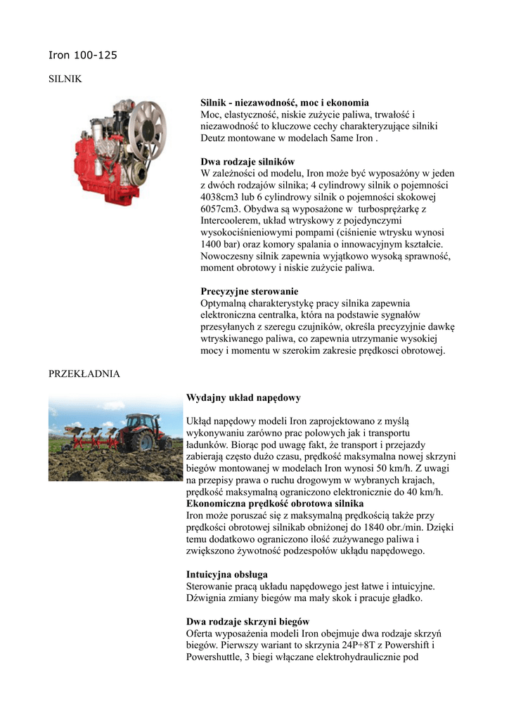 Iron 100-125 SILNIK Silnik - niezawodność, moc i ekonomia Moc, elastyczność, niskie zużycie paliwa, trwałość i niezawodność to kluczowe cechy charakteryzujące silniki Deutz montowane w modelach Same Iron . Dwa rodzaje silników W zależności od modelu, Iron może być wyposażóny w jeden z dwóch rodzajów silnika; 4 cylindrowy silnik o pojemności 4038cm3 lub 6 cylindrowy silnik o pojemności skokowej 6057cm3. Obydwa są wyposażone w turbosprężarkę z Intercoolerem, układ wtryskowy z pojedynczymi wysokociśnieniowymi pompami (ciśnienie wtrysku wynosi 1400 bar) oraz komory spalania o innowacyjnym kształcie. Nowoczesny silnik zapewnia wyjątkowo wysoką sprawność, moment obrotowy i niskie zużycie paliwa. Precyzyjne sterowanie Optymalną charakterystykę pracy silnika zapewnia elektroniczna centralka, która na podstawie sygnałów przesyłanych z szeregu czujników, określa precyzyjnie dawkę wtryskiwanego paliwa, co zapewnia utrzymanie wysokiej mocy i momentu w szerokim zakresie prędkosci obrotowej. PRZEKŁADNIA Wydajny układ napędowy Ukłąd napędowy modeli Iron zaprojektowano z myślą wykonywaniu zarówno prac polowych jak i transportu ładunków. Biorąc pod uwagę fakt, że transport i przejazdy zabierają często dużo czasu, prędkość maksymalna nowej skrzyni biegów montowanej w modelach Iron wynosi 50 km/h. Z uwagi na przepisy prawa o ruchu drogowym w wybranych krajach, prędkość maksymalną ograniczono elektronicznie do 40 km/h. Ekonomiczna prędkość obrotowa silnika Iron może poruszać się z maksymalną prędkością także przy prędkości obrotowej silnikab obniżonej do 1840 obr./min. Dzięki temu dodatkowo ograniczono ilość zużywanego paliwa i zwiększono żywotność podzespołów ukłądu napędowego. Intuicyjna obsługa Sterowanie pracą układu napędowego jest łatwe i intuicyjne. Dźwignia zmiany biegów ma mały skok i pracuje gładko. Dwa rodzaje skrzyni biegów Oferta wyposażenia modeli Iron obejmuje dwa rodzaje skrzyń biegów. Pierwszy wariant to skrzynia 24P+8T z Powershift i Powershuttle, 3 biegi włączane elektrohydraulicznie pod obciążeniem po naciśnięciu przycisku. Minimalna prękość jazdy wynosi 1,67km/h. Drugi wariant to skrzynia 36P+12T z Powershift i Powershuttle, 3 biegami włączanymi elektrohydraulicznie pod obciążeniem po naciśnięciu przycisku i super-reduktor, dzięki któremu prędkość minimalna wynosi 0,33km/h. Automatic Powershift Aby zwiększyć dodatkowo komfort użytkowania, w wersji “HiLine”, dostępna jest funkcja “Automatic Powershift”, czyli automatyczna zmiana przełożeń w Powershift, dla dowolnego wybranego biegu, zależnie od mocy i obciążenia. Ponadto, dzięki specjalnemu potencjometrowi umieszczonemu w podłokietniku, można wybrać tryb “Power”, aby automatyczna zmiana odbywała się “energicznie”, albo tryb “Eco”, zwiększający oszczędność ilości zużywanego oleju napędowego. WOM WOM tylny Modele Iron wyposażono w WOM tylny z 4 prędkościami: 540 540ECO - 1000 - 1000ECO. Napęd na wałek przekazywany jest poprzez wielotarczowe sprzęgło w kąpieli olejowej. Operator steruje pracą WOM elektrohydraulicznie poprzez włączenie przycisku umieszczonego w kabinie. Dodatkowo, możliwe jest sterowanie pracą WOM za pomocą przycisków umieszczonych na obu tylnych błotnikach. Ciągnik współpracuje ze wszystkimi rodzajami osprzętu z maksymalną wydajnością, nawet przy największych obciążeniach. WOM przedni Modele Iron mogą być wyposażone w przedni WOM obracający się z prędkością 1000obr./min. Napęd jest uruchamiany elektrohydraulicznie poprzez naciśnięcie przycisku umieszczonego we wnętrzu kabiny. Do napędu zastosowano sprzęgło wielotarczowe w kąpieli olejowej. HYDRAULIKA I PODNOŚNIK Moc i wydajność Modele Iron mogą być wyposażone w dwa rodzaje układów hydraulicznych. Pierwszy z nich to układ "otwarty" z pompą o wydajności 61 l/min, 3 rozdzielaczami podwójnego działania oraz regulacją natężenia przepływu. W wersjach “HiLine” montowany jest ukłąd “zamknięty" z pompą o zmiennym natężeniu i wydajności 83 l/min.. W tym przypadku wszystkie rozdzielacze są sterowane elektrohydraulicznie, posiadają regulator natężenia przepływu (dwa z nich z regulatorem czasowym) i oddzielny zbiornik oleju o pojemności 35 litrów. Bezpieczna obsługa solidnego podnośnika Podnośnik elektroniczny o udźwigu 6200kg wyposażono w system zabezpieczający przed zrzuceniem zamontowanego osprzętu “Antidumping”. System tłumi drgania w trakcie przejazdów z osprzętem zamontowanym na podnośniku. Dedykowana elektroniczna centralka sterująca jest połączona z radarem, kontroluje funkcje podnośnika: siłę, położenie, szybkie opuszczanie, mix i poślizg, blokadę narzędzia na czas transportu, ograniczenie wysokości podnoszenia, regulację prędkości opuszczania oraz zabezpieczenie przed zrzuceniem (antidumping). Komfort obsługi podnośnika - wersja Hi-Line Dla zwiększenia komfortu obsługi, wersja “Hi-Line” jest wyposażona w przyciski obsługi podnośnika wbudowane w Joystick wielofunkcyjny. Dla zwiększenia wydajności i trwałości podzespołów układu hydraulicznego; obwody układu kierowniczego i podnośnika z rozdzielaczami pomocniczymi posiadają oddzielny zbiornik oleju. Podnośnik przedni w opcji Kompletując wyposażenie modelu Iron, użytkownik może wyposażyć ciągnik w podnośnik przedni o udźwigu 3200kg. Ciągnik może być wyposażóny w przedni obciążnik o wadze 600kg. KABINA Maksymalny komfort i wygoda Kabina modelu Iron to komfortowe miejsce pracy operatora. O odpowiednią temperaturę wnętrza dba wydajny ukłąd klimatyzacji z 17 regulowanymi otworami nawiewów, pozwalających równomiernie rozprowadzać schłodzone powietrze. Zwarta bryła, przestronne wnętrze Bryła kabiny jest zwarta smukła, wysokość max. to 260cm (z oponami 34”). Wnętrze oferuje dużą przestrzeń dla operat
