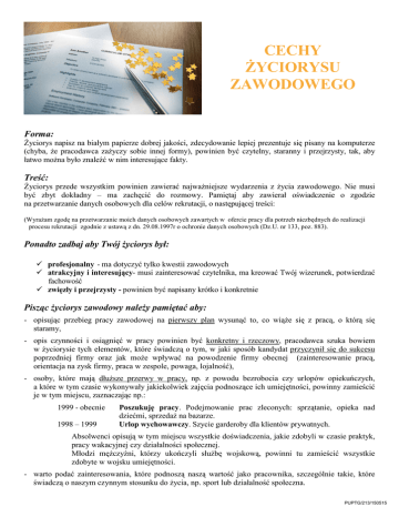 CECHY ŻYCIORYSU ZAWODOWEGO Forma: Życiorys napisz na białym papierze dobrej jakości, zdecydowanie lepiej prezentuje się pisany na komputerze (chyba, że pracodawca zażyczy sobie innej formy), powinien być czytelny, staranny i przejrzysty, tak, aby łatwo można było znaleźć w nim interesujące fakty. Treść: Życiorys przede wszystkim powinien zawierać najważniejsze wydarzenia z życia zawodowego. Nie musi być zbyt dokładny – ma zachęcić do rozmowy. Pamiętaj aby zawierał oświadczenie o zgodzie na przetwarzanie danych osobowych dla celów rekrutacji, o następującej treści: (Wyrażam zgodę na przetwarzanie moich danych osobowych zawartych w ofercie pracy dla potrzeb niezbędnych do realizacji procesu rekrutacji zgodnie z ustawą z dn. 29.08.1997r o ochronie danych osobowych (Dz.U. nr 133, poz. 883). Ponadto zadbaj aby Twój życiorys był: profesjonalny - ma dotyczyć tylko kwestii zawodowych atrakcyjny i interesujący- musi zainteresować czytelnika, ma kreować Twój wizerunek, potwierdzać fachowość zwięzły i przejrzysty - powinien być napisany krótko i konkretnie Pisząc życiorys zawodowy należy pamiętać aby: - opisując przebieg pracy zawodowej na pierwszy plan wysunąć to, co wiąże się z pracą, o którą się staramy, - opis czynności i osiągnięć w pracy powinien być konkretny i rzeczowy, pracodawca szuka bowiem w życiorysie tych elementów, które świadczą o tym, w jaki sposób kandydat przyczynił się do sukcesu poprzedniej firmy oraz jak może wpływać na powodzenie firmy obecnej (zainteresowanie pracą, orientacja na zysk firmy, praca w zespole, powaga, lojalność), - osoby, które mają dłuższe przerwy w pracy, np. z powodu bezrobocia czy urlopów opiekuńczych, a które w tym czasie wykonywały jakiekolwiek zajęcia podnoszące ich umiejętności, powinny zamieścić je w tym miejscu, zaznaczając np.: 1999 - obecnie 1998 – 1999 Poszukuję pracy. Podejmowanie prac zleconych: sprzątanie, opieka nad dziećmi, sprzedaż na bazarze. Urlop wychowawczy. Szycie garderoby dla klientów prywatnych. Absolwenci opisują w tym miejscu wszystkie doświadczenia, jakie zdobyli w czasie praktyk, pracy wakacyjnej czy działalności społecznej. Młodzi mężczyźni, którzy ukończyli służbę wojskową, powinni tu zamieścić wszystkie zdobyte w wojsku umiejętności. - warto podać zainteresowania, które podnoszą naszą wartość jako pracownika, szczególnie takie, które świadczą o naszym czynnym stosunku do życia, np. sport lub działalność społeczna. PUPTG/213/150515 - Poproś kogoś o sprawdzenie zrozumiałości, poprawności stylistycznej i ortografii. Najczęściej popełniane błędy podczas pisania CV to: • treść (pomijanie dat, brak chronologii, zbyt wiele detali, bezpodstawne opisywanie własnych umiejętności) • osiągnięcia (brak konkretów) • wizualne (kolorowy papier, rysunki lub grafika, brak przejrzystości graficznej) • gramatyka i technika (zbyt wyszukane słownictwo, błędy ortograficzne i graficzne) • organizacji (zbyt długi: optymalnie 1-2 strony; brak kierunku i celu - daj odczuć pracodawcy, że zależy ci na tej pracy) Tworząc życiorys trzeba przestrzegać zasad wymaganych przy tego rodzaju dokumencie. Jeśli nie mamy zbyt dużo doświadczenia warto poprosić kogoś o pomoc przy ocenie tego, co napisaliśmy: czy wszystko jest jasne, nie budzi wątpliwości i czy będzie jednoznacznie zrozumiane. W stworzeniu profesjonalnego życiorysu zawodowego pomoże Ci również DORADCA ZAWODOWY zatrudniony w tut. Urzędzie Pracy. Opracowanie: Ewa Kamińska – doradca zawodowy II stopnia PUPTG/213/150515