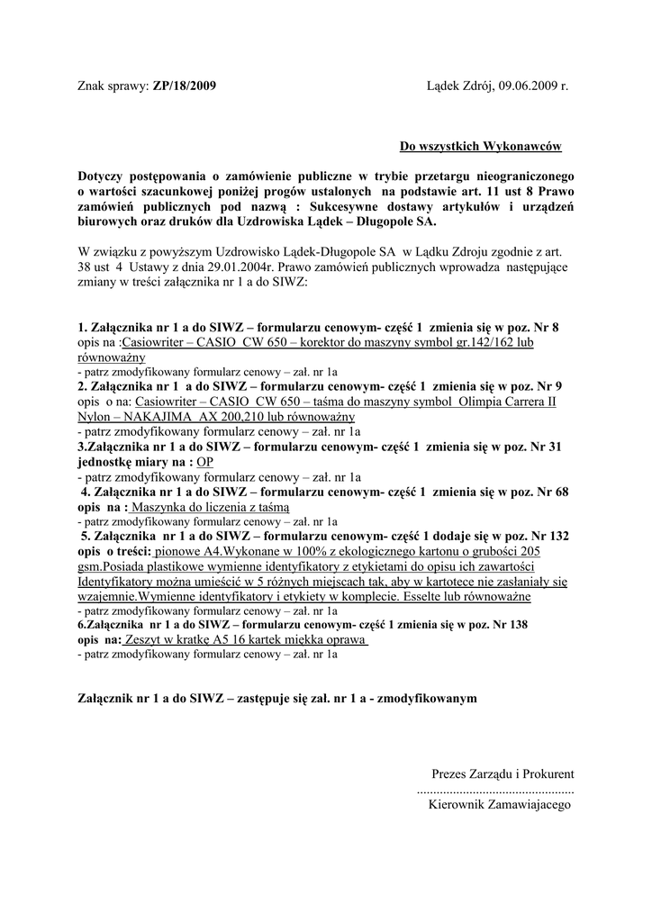 Znak sprawy: ZP/18/2009 Lądek Zdrój, 09.06.2009 r. Do wszystkich Wykonawców Dotyczy postępowania o zamówienie publiczne w trybie przetargu nieograniczonego o wartości szacunkowej poniŜej progów ustalonych na podstawie art. 11 ust 8 Prawo zamówień publicznych pod nazwą : Sukcesywne dostawy artykułów i urządzeń biurowych oraz druków dla Uzdrowiska Lądek – Długopole SA. W związku z powyŜszym Uzdrowisko Lądek-Długopole SA w Lądku Zdroju zgodnie z art. 38 ust 4 Ustawy z dnia 29.01.2004r. Prawo zamówień publicznych wprowadza następujące zmiany w treści załącznika nr 1 a do SIWZ: 1. Załącznika nr 1 a do SIWZ – formularzu cenowym- część 1 zmienia się w poz. Nr 8 opis na :Casiowriter – CASIO CW 650 – korektor do maszyny symbol gr.142/162 lub równowaŜny - patrz zmodyfikowany formularz cenowy – zał. nr 1a 2. Załącznika nr 1 a do SIWZ – formularzu cenowym- część 1 zmienia się w poz. Nr 9 opis o na: Casiowriter – CASIO CW 650 – taśma do maszyny symbol Olimpia Carrera II Nylon – NAKAJIMA AX 200,210 lub równowaŜny - patrz zmodyfikowany formularz cenowy – zał. nr 1a 3.Załącznika nr 1 a do SIWZ – formularzu cenowym- część 1 zmienia się w poz. Nr 31 jednostkę miary na : OP - patrz zmodyfikowany formularz cenowy – zał. nr 1a 4. Załącznika nr 1 a do SIWZ – formularzu cenowym- część 1 zmienia się w poz. Nr 68 opis na : Maszynka do liczenia z taśmą - patrz zmodyfikowany formularz cenowy – zał. nr 1a 5. Załącznika nr 1 a do SIWZ – formularzu cenowym- część 1 dodaje się w poz. Nr 132 opis o treści: pionowe A4.Wykonane w 100% z ekologicznego kartonu o grubości 205 gsm.Posiada plastikowe wymienne identyfikatory z etykietami do opisu ich zawartości Identyfikatory moŜna umieścić w 5 róŜnych miejscach tak, aby w kartotece nie zasłaniały się wzajemnie.Wymienne identyfikatory i etykiety w komplecie. Esselte lub równowaŜne - patrz zmodyfikowany formularz cenowy – zał. nr 1a 6.Załącznika nr 1 a do SIWZ – formularzu cenowym- część 1 zmienia się w poz. Nr 138 opis na: Zeszyt w kratkę A5 16 kartek miękka oprawa - patrz zmodyfikowany formularz cenowy – zał. nr 1a Załącznik nr 1 a do SIWZ – zastępuje się zał. nr 1 a - zmodyfikowanym Prezes Zarządu i Prokurent ................................................ Kierownik Zamawiajacego