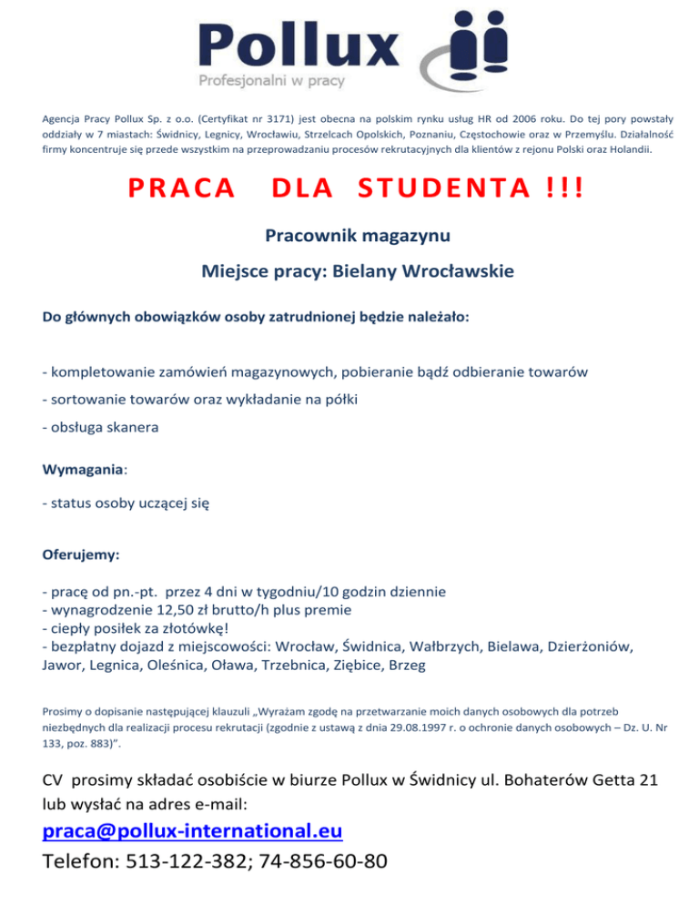 Agencja Pracy Pollux Sp. z o.o. (Certyfikat nr 3171) jest obecna na polskim rynku usług HR od 2006 roku. Do tej pory powstały oddziały w 7 miastach: Świdnicy, Legnicy, Wrocławiu, Strzelcach Opolskich, Poznaniu, Częstochowie oraz w Przemyślu. Działalność firmy koncentruje się przede wszystkim na przeprowadzaniu procesów rekrutacyjnych dla klientów z rejonu Polski oraz Holandii. PRACA DLA STUDENTA !!! Pracownik magazynu Miejsce pracy: Bielany Wrocławskie Do głównych obowiązków osoby zatrudnionej będzie należało: - kompletowanie zamówień magazynowych, pobieranie bądź odbieranie towarów - sortowanie towarów oraz wykładanie na półki - obsługa skanera Wymagania: - status osoby uczącej się Oferujemy: - pracę od pn.-pt. przez 4 dni w tygodniu/10 godzin dziennie - wynagrodzenie 12,50 zł brutto/h plus premie - ciepły posiłek za złotówkę! - bezpłatny dojazd z miejscowości: Wrocław, Świdnica, Wałbrzych, Bielawa, Dzierżoniów, Jawor, Legnica, Oleśnica, Oława, Trzebnica, Ziębice, Brzeg Prosimy o dopisanie następującej klauzuli „Wyrażam zgodę na przetwarzanie moich danych osobowych dla potrzeb niezbędnych dla realizacji procesu rekrutacji (zgodnie z ustawą z dnia 29.08.1997 r. o ochronie danych osobowych – Dz. U. Nr 133, poz. 883)”. CV prosimy składać osobiście w biurze Pollux w Świdnicy ul. Bohaterów Getta 21 lub wysłać na adres e-mail: [email protected] Telefon: 513-122-382; 74-856-60-80