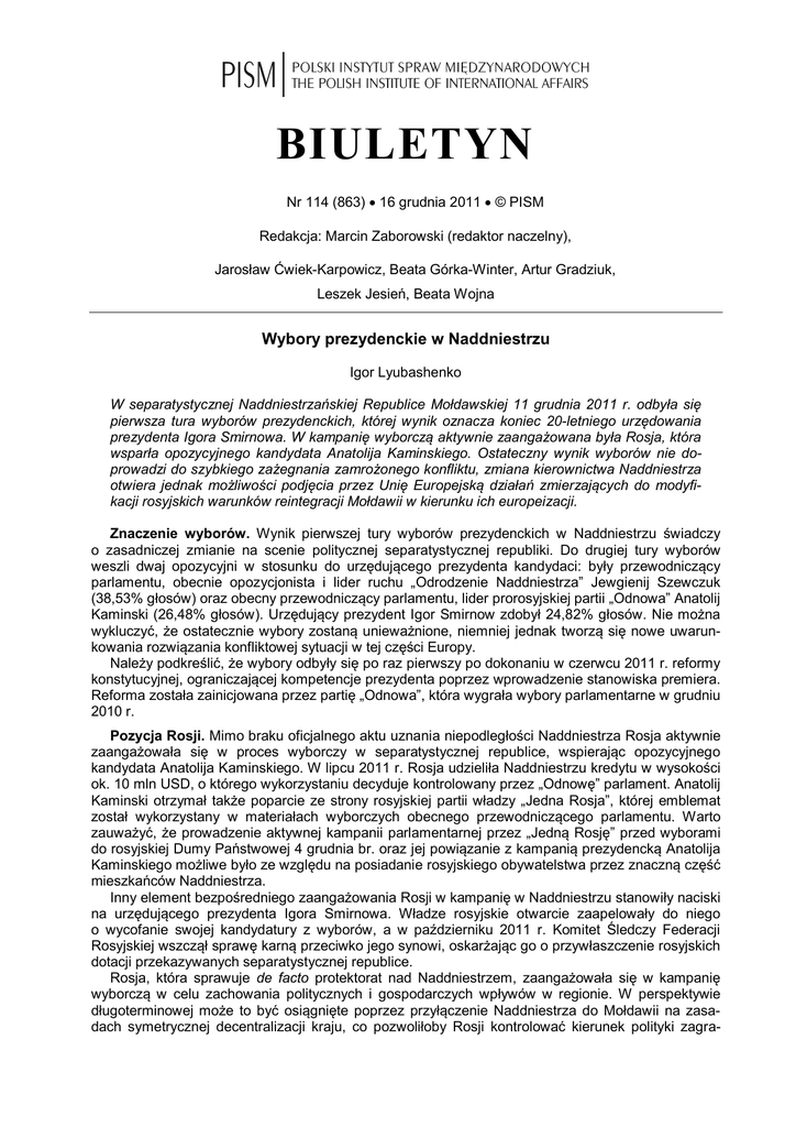 BIULETYN Nr 114 (863) 16 grudnia 2011 © PISM Redakcja: Marcin Zaborowski (redaktor naczelny), Jarosław Ćwiek-Karpowicz, Beata Górka-Winter, Artur Gradziuk, Leszek Jesień, Beata Wojna Wybory prezydenckie w Naddniestrzu Igor Lyubashenko W separatystycznej Naddniestrzańskiej Republice Mołdawskiej 11 grudnia 2011 r. odbyła się pierwsza tura wyborów prezydenckich, której wynik oznacza koniec 20-letniego urzędowania prezydenta Igora Smirnowa. W kampanię wyborczą aktywnie zaangażowana była Rosja, która wsparła opozycyjnego kandydata Anatolija Kaminskiego. Ostateczny wynik wyborów nie doprowadzi do szybkiego zażegnania zamrożonego konfliktu, zmiana kierownictwa Naddniestrza otwiera jednak możliwości podjęcia przez Unię Europejską działań zmierzających do modyfikacji rosyjskich warunków reintegracji Mołdawii w kierunku ich europeizacji. Znaczenie wyborów. Wynik pierwszej tury wyborów prezydenckich w Naddniestrzu świadczy o zasadniczej zmianie na scenie politycznej separatystycznej republiki. Do drugiej tury wyborów weszli dwaj opozycyjni w stosunku do urzędującego prezydenta kandydaci: były przewodniczący parlamentu, obecnie opozycjonista i lider ruchu „Odrodzenie Naddniestrza” Jewgienij Szewczuk (38,53% głosów) oraz obecny przewodniczący parlamentu, lider prorosyjskiej partii „Odnowa” Anatolij Kaminski (26,48% głosów). Urzędujący prezydent Igor Smirnow zdobył 24,82% głosów. Nie można wykluczyć, że ostatecznie wybory zostaną unieważnione, niemniej jednak tworzą się nowe uwarunkowania rozwiązania konfliktowej sytuacji w tej części Europy. Należy podkreślić, że wybory odbyły się po raz pierwszy po dokonaniu w czerwcu 2011 r. reformy konstytucyjnej, ograniczającej kompetencje prezydenta poprzez wprowadzenie stanowiska premiera. Reforma została zainicjowana przez partię „Odnowa”, która wygrała wybory parlamentarne w grudniu 2010 r. Pozycja Rosji. Mimo braku oficjalnego aktu uznania niepodległości Naddniestrza Rosja aktywnie zaangażowała się w proces wyborczy w separatystycznej republice, wspierając opozycyjnego kandydata Anatolija Kaminskiego. W lipcu 2011 r. Rosja udzieliła Naddniestrzu kredytu w wysokości ok. 10 mln USD, o którego wykorzystaniu decyduje kontrolowany przez „Odnowę” parlament. Anatolij Kaminski otrzymał także poparcie ze strony rosyjskiej partii władzy „Jedna Rosja”, której emblemat został wykorzystany w materiałach wyborczych obecnego przewodniczącego parlamentu. Warto zauważyć, że prowadzenie aktywnej kampanii parlamentarnej przez „Jedną Rosję” przed wyborami do rosyjskiej Dumy Państwowej 4 grudnia br. oraz jej powiązanie z kampanią prezydencką Anatolija Kaminskiego możliwe było ze względu na posiadanie rosyjskiego obywatelstwa przez znaczną część mieszkańców Naddniestrza. Inny element bezpośredniego zaangażowania Rosji w kampanię w Naddniestrzu stanowiły naciski na urzędującego prezydenta Igora Smirnowa. Władze rosyjskie otwarcie zaapelowały do niego o wycofanie swojej kandydatury z wyborów, a w październiku 2011 r. Komitet Śledczy Federacji Rosyjskiej wszczął sprawę karną przeciwko jego synowi, oskarżając go o przywłaszczenie rosyjskich dotacji przekazywanych separatystycznej republice. Rosja, która sprawuje de facto protektorat nad Naddniestrzem, zaangażowała się w kampanię wyborczą w celu zachowania politycznych i gospodarczych wpływów w regionie. W perspektywie długoterminowej może to być osiągnięte poprzez przyłączenie Naddniestrza do Mołdawii na zasadach symetrycznej decentralizacji kraju, co pozwoliłoby Rosji kontrolować kierunek polityki zagra- 2573 Polski Instytut Spraw Międzynarodowych nicznej zjednoczonej Mołdawii. W perspektywie krótkoterminowej zaś Rosja jest zainteresowana utrzymaniem status quo. Aktywne wsparcie opozycyjnego w stosunku do Smironowa i wyraźnie prorosyjskiego kandydata świadczy o dążeniu Rosji do pogłębienia kontroli nad polityką prowadzoną przez kierownictwo separatystycznej republiki. Pozycja Mołdawii. Oficjalne stanowisko Kiszyniowa polega na nieuznawaniu każdych wyborów odbywających się w Naddniestrzu, w związku z czym władze mołdawskie nie ingerowały w przebieg niedawnej kampanii. Niemniej jednak podjęły próbę wykorzystania osłabionej przez rosyjskie naciski pozycji Igora Smirnowa do podjęcia konstruktywnego dialogu z Tyraspolem. 21 listopada 2011 r. doszło do spotkania premiera Mołdawii Vlada Filata z prezydentem Smirnowem, w wyniku którego podpisano wspólne oświadczenie przewidujące współpracę między stronami, unikanie działań mogących destabilizować sytuację w Naddniestrzu, kontynuację prac na rzecz wznowienia komunikacji kolejowej oraz rozwiązania problemów komunikacji telefonicznej, współpracę ekspercką w dziedzinie gospodarczej oraz współpracę w zwalczaniu przestępczości. Podstawowym interesem Mołdawii jest reintegracja kraju na warunkach wykluczających zapewnienie Naddniestrzu prawa weta wobec głównych kierunków polityki państwa, a zatem kontrolę ze strony Rosji. Warto zauważyć, że niska aktywność Kiszyniowa w związku z wyborami w separatystycznej republice jest w dużej mierze uwarunkowana przedłużającym się w Mołdawii kryzysem politycznym. Ze względu na niezdolność koalicji rządzącej do wybrania głowy państwa, jak również narastające spory międzypartyjne problem Naddniestrza znajduje się obecnie poza listą priorytetów zarówno elit politycznych, jak i opinii publicznej Mołdawii. Pozycja Ukrainy. Na początku listopada 2011 r. Igor Smirnow ogłosił, iż nie wyklucza przyłączenia Naddniestrza do Ukrainy. Oświadczenie to można interpretować jako próbę wciągnięcia Ukrainy w procesy wewnątrzpolityczne w separatystycznej republice oraz uzyskania sojusznika w obliczu presji ze strony Moskwy. Władze ukraińskie konsekwentnie odrzucają podobne koncepcje. Nie podjęto żadnej próby akty
