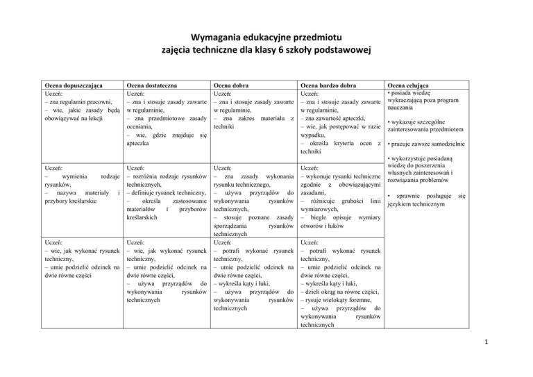 Wymagania edukacyjne przedmiotu zajęcia techniczne dla klasy 6 szkoły podstawowej Ocena dopuszczająca Uczeń: ‒ zna regulamin pracowni, ‒ wie, jakie zasady będą obowiązywać na lekcji Ocena dostateczna Uczeń: ‒ zna i stosuje zasady zawarte w regulaminie, ‒ zna przedmiotowe zasady oceniania, ‒ wie, gdzie znajduje się apteczka Uczeń: ‒ wymienia rodzaje rysunków, ‒ nazywa materiały i przybory kreślarskie Uczeń: ‒ rozróżnia rodzaje rysunków technicznych, ‒ definiuje rysunek techniczny, ‒ określa zastosowanie materiałów i przyborów kreślarskich Uczeń: ‒ wie, jak wykonać rysunek techniczny, ‒ umie podzielić odcinek na dwie równe części Uczeń: ‒ wie, jak wykonać rysunek techniczny, ‒ umie podzielić odcinek na dwie równe części, ‒ używa przyrządów do wykonywania rysunków technicznych Ocena dobra Uczeń: ‒ zna i stosuje zasady zawarte w regulaminie, ‒ zna zakres materiału z techniki Uczeń: ‒ zna zasady wykonania rysunku technicznego, ‒ używa przyrządów do wykonywania rysunków technicznych, ‒ stosuje poznane zasady sporządzania rysunków technicznych Uczeń: ‒ potrafi wykonać rysunek techniczny, ‒ umie podzielić odcinek na dwie równe części, ‒ wykreśla kąty i łuki, ‒ używa przyrządów do wykonywania rysunków technicznych Ocena bardzo dobra Uczeń: ‒ zna i stosuje zasady zawarte w regulaminie, ‒ zna zawartość apteczki, ‒ wie, jak postępować w razie wypadku, ‒ określa kryteria ocen z techniki Uczeń: ‒ wykonuje rysunki techniczne zgodnie z obowiązującymi zasadami, ‒ różnicuje grubości linii wymiarowych, ‒ biegle opisuje wymiary otworów i łuków Ocena celująca • posiada wiedzę wykraczającą poza program nauczania • wykazuje szczególne zainteresowania przedmiotem • pracuje zawsze samodzielnie • wykorzystuje posiadaną wiedzę do poszerzenia własnych zainteresowań i rozwiązania problemów • sprawnie posługuje językiem technicznym się Uczeń: ‒ potrafi wykonać rysunek techniczny, ‒ umie podzielić odcinek na dwie równe części, ‒ wykreśla kąty i łuki, ‒ dzieli okrąg na równe części, ‒ rysuje wielokąty foremne, ‒ używa przyrządów do wykonywania rysunków technicznych 1 Uczeń: –‒zna pojęcie pisma technicznego, ‒ rozumie zasady dotyczące opisywania rysunków pismem technicznym, ‒ zna niektóre proporcje liter lub cyfr ‒ odwzorowuje kształty liter i cyfr Uczeń: ‒ nazywa linie wymiarowe, ‒ zna pojęcia: „linia konturowa”, „linia wymiarowa”, „linia pomocnicza”, „kontur”, ‒ rozpoznaje znaki wymiarowe – liczbę wymiarową, promień, średnicę Uczeń: ‒ rozpoznaje rodzaje rzutów, ‒ podaje zasady rzutowania Uczeń: ‒ zna proporcje liter technicznych i stara się je stosować do opisywania rysunków technicznych Uczeń: ‒ zna proporcje liter technicznych dotyczące szerokości i wysokości liter ‒ opisuje rysunki, zachowując właściwe proporcje liter Uczeń: ‒ zna i przestrzega zasad proporcji liter i cyfr dotyczących wysokości, szerokości i odstępów pomiędzy wierszami i literami, ‒ opisuje rysunki pismem technicznym Uczeń: ‒ podaje wymiary arkuszy w rysunku technicznym, ‒ nazywa linie i znaki wymiarowe, ‒ zna pojęcia: „wymiarowanie”, „podziałka rysunkowa” Uczeń: ‒ wyjaśnia normalizacji, ‒ wymienia znormalizowanych znaków Uczeń: ‒ wyjaśnia cel stosowania podziałek rysunkowych, ‒ omawia ogólne zasady wykonania rysunku technicznego Uczeń: ‒ analizuje poszczególne rzuty, ‒ rysuje przedmiot w rzucie prostokątnym Uczeń: ‒ rozpoznaje i wskazuje rodzaje rzutów, ‒ podaje zasady rzutowania Uczeń: ‒ analizuje poszczególne rzuty, ‒ rysuje przedmiot w rzucie prostokątnym, ‒ rozpoznaje prawidłowo narysowane rzuty Uczeń: ‒ zna pojęcia: „rzut prostokątny”, „rzutnia”, „płaszczyzna główna”, ‒ rysuje przedmiot w rzucie prostokątnym Uczeń: ‒ zna pojęcie „rzut aksonometryczny”, ‒ analizuje poszczególne rzuty, ‒ rysuje przedmioty w rzutach aksonometrycznych za pomocą przyrządów geometrycznych definicję rodzaje linii i Uczeń: ‒ omawia etapy i zasady rzutowania, stosuje je w praktyce, ‒ biegle rysuje przedmioty w rzutach prostokątnych Uczeń: ‒ omawia etapy i zasady rzutowania, stosuje je w praktyce, ‒ zna zasady i etapy rzutowania, ‒korzysta z przyrządów geometrycznych do sporządzania rysunków aksonometrycznych 2 Uczeń: ‒ wyjaśnia pojęcie piktogramu Uczeń: ‒ wskazuje tabliczkę na urządzeniu Uczeń: ‒ określa pojęcie dokumentacji technologicznej, ‒ omawia znaczenie planowania pracy Uczeń: ‒ wymienia rodzaje drzew, ‒ odróżnia drewno od drzewa, ‒ opisuje budowę drzewa, ‒ określa wiek drewna, ‒ wymienia zagrożenia lasów Uczeń: ‒ omawia proces otrzymywania drewna, ‒ wymienia przedmioty wykonane z drewna, ‒ zna wady i zalety materiałów wykonanych z drewna, ‒ zna rodzaje materiałów drewnopochodnych Uczeń: ‒ wymienia i charakteryzuje Uczeń: ‒ objaśnia rolę instrukcji obsługi urządzeń Uczeń: ‒ wyjaśnia rolę tabliczki znamionowej Uczeń: ‒ wyjaśnia pojęcia „proces technologiczny”, „operacja technologiczna”, ‒ wyjaśnia pojęcia „praca zespołowa” i „praca indywidualna”, ‒ umie dobrać odpowiedni materiał do rodzaju wykonywanej pracy Uczeń: ‒ nazywa elementy drewna, ‒ określa historię drewna na podstawie słojów, ‒ omawia zagrożenia lasów Uczeń: ‒ posługuje się instrukcją obsługi Uczeń: ‒ wymienia dane z tabliczki znamionowej Uczeń: ‒ rozpoznaje i nazywa operacje technologiczne, ‒ podaje przykłady pracy zespołowej i pracy indywidualnej Uczeń: ‒ określa wskazówki eksploatacyjne Uczeń: ‒ dokonuje porównania danych z tabliczek znamionowych Uczeń: ‒ sporządza prawidłowo dokumentację technologiczną, ‒ wykonuje pracę zgodnie z dokumentacją Uczeń: ‒ określa gatunek drewna, 