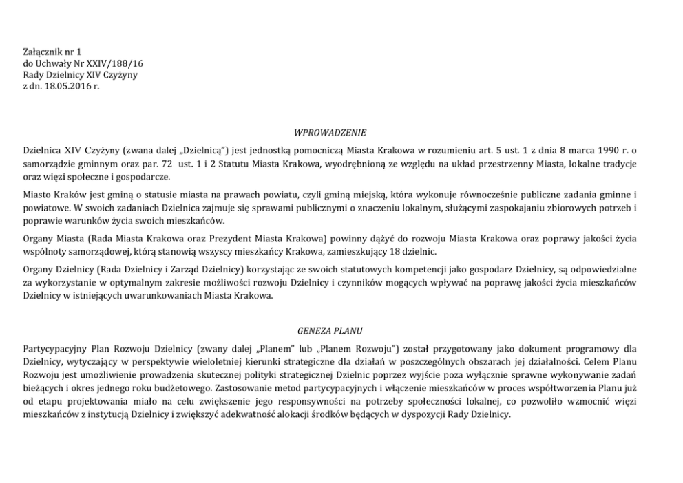 Załącznik nr 1 do Uchwały Nr XXIV/188/16 Rady Dzielnicy XIV Czyżyny z dn. 18.05.2016 r. WPROWADZENIE Dzielnica XIV Czyżyny (zwana dalej „Dzielnicą”) jest jednostką pomocniczą Miasta Krakowa w rozumieniu art. 5 ust. 1 z dnia 8 marca 1990 r. o samorządzie gminnym oraz par. 72 ust. 1 i 2 Statutu Miasta Krakowa, wyodrębnioną ze względu na układ przestrzenny Miasta, lokalne tradycje oraz więzi społeczne i gospodarcze. Miasto Kraków jest gminą o statusie miasta na prawach powiatu, czyli gminą miejską, która wykonuje równocześnie publiczne zadania gminne i powiatowe. W swoich zadaniach Dzielnica zajmuje się sprawami publicznymi o znaczeniu lokalnym, służącymi zaspokajaniu zbiorowych potrzeb i poprawie warunków życia swoich mieszkańców. Organy Miasta (Rada Miasta Krakowa oraz Prezydent Miasta Krakowa) powinny dążyć do rozwoju Miasta Krakowa oraz poprawy jakości życia wspólnoty samorządowej, którą stanowią wszyscy mieszkańcy Krakowa, zamieszkujący 18 dzielnic. Organy Dzielnicy (Rada Dzielnicy i Zarząd Dzielnicy) korzystając ze swoich statutowych kompetencji jako gospodarz Dzielnicy, są odpowiedzialne za wykorzystanie w optymalnym zakresie możliwości rozwoju Dzielnicy i czynników mogących wpływać na poprawę jakości życia mieszkańców Dzielnicy w istniejących uwarunkowaniach Miasta Krakowa. GENEZA PLANU Partycypacyjny Plan Rozwoju Dzielnicy (zwany dalej „Planem” lub „Planem Rozwoju”) został przygotowany jako dokument programowy dla Dzielnicy, wytyczający w perspektywie wieloletniej kierunki strategiczne dla działań w poszczególnych obszarach jej działalności. Celem Planu Rozwoju jest umożliwienie prowadzenia skutecznej polityki strategicznej Dzielnic poprzez wyjście poza wyłącznie sprawne wykonywanie zadań bieżących i okres jednego roku budżetowego. Zastosowanie metod partycypacyjnych i włączenie mieszkańców w proces współtworzenia Planu już od etapu projektowania miało na celu zwiększenie jego responsywności na potrzeby społeczności lokalnej, co pozwoliło wzmocnić więzi mieszkańców z instytucją Dzielnicy i zwiększyć adekwatność alokacji środków będących w dyspozycji Rady Dzielnicy. Współpraca z Wydziałem Rozwoju Miasta Urzędu Miasta Krakowa w sprawie opracowania strategicznego Planu Rozwoju Dzielnicy gwarantuje jego spójność ze Strategią Rozwoju Krakowa 2030. Plan Rozwoju Dzielnicy nie jest deklaracją zobowiązań samorządu, ale wyborem konkretnych, wyselekcjonowanych działań, które mają szczególne znaczenie rozwojowe. Zakres Planu odnosi się przede wszystkim do działań, które są możliwe do realizacji w ramach kompetencji Dzielnicy, ale również tych, które wymagają udziału władz miejskich – Prezydenta i Rady Miasta. Dla efektywnej realizacji Planu Rozwoju Dzielnicy nieodzownym będzie zwiększenie kompetencji Rad Dzielnic oraz zwiększenie środków finansowych przekazywanych przez Gminę Miejska Kraków do dyspozycji Rad Dzielnic. OPIS METODY PLANISTYCZNEJ ORAZ PROCESU POWSTAWANIA DOKUMENTU Wstępem do opracowania Planu były badania przeprowadzone za pomocą analizy danych zastanych oraz metod jakościowych (częściowo skategoryzowane wywiady oparte na kwestionariuszach). Badania diagnozowały potrzeby i oczekiwania mieszkańców Dzielnicy. Badania zaprojektowano wspólnie z naukowcami Uniwersytetu Jagiellońskiego, którzy następnie odpowiadali również za ich przeprowadzenie (zespół badawczy: dr hab. Agnieszka Hess, dr hab. Ewa Bogacz-Wojtanowska, Małgorzata Lendzion, Krzysztof Nowak, Sylwia Wrona). Następnie przystąpiono do sporządzania założeń Planu Rozwoju Dzielnicy. Założenia te opracowywała Grupa Robocza – Obywatelski Panel Dzielnicowy (zwany dalej Panelem), którą wyłonił Realizator Projektu – Stowarzyszenie Pracownia Obywatelska, przy doradczym udziale radnych dzielnicowych. Obywatelski Panel Dzielnicowy składał się z reprezentantów instytucji działających na terenie Dzielnicy – takich jak Rada Dzielnicy, placówki kulturalne i społeczne, wspólnoty mieszkaniowe, szkoły, czy organizacje pozarządowe – oraz z niezrzeszonych w żadnych strukturach mieszkańców, liderów lokalnych, działających nieformalnie. Spotkania Obywatelskiego Panelu Dzielnicowego odbywały się w formie spotkań warsztatowych, prowadzonych przez profesjonalnych moderatorów metodami adekwatnymi do poszczególnych etapów procesu. Prace Obywatelskiego Panelu Dzielnicowego podzielić można na trzy etapy: a) diagnostyka i planowanie, b) pogłębianie zagadnień obszarowych, c) doprecyzowanie i konsultacja zadań. Podczas etapu (b) Panel pracował w podziale na tematyczne podgrupy robocze. Podgrupy skupiły się na pracy nad konkretnymi zagadnieniami obszarowymi. Po sprecyzowaniu zadań w konkretnych obszarach w Dzielnicy odbyły się otwarte spotkania konsultacyjne. Następnie Panel odnosił się do uwag zebranych podczas konsultacji społecznych, wprowadzając ostateczne zmiany do treści Planu. DIAGNOZA SYTUACJI SPOŁECZNO-GOSPODARCZEJ Diagnoza została zawarta w raporcie z badań diagnozujących potrzeby i oczekiwania mieszkańców Dzielnicy XIV Czyżyny. Badania stanowiły istotny element projektu, w ramach którego powstał Plan Rozwoju Dzielnicy. WIZJA DZIELNICY Czyżyny – dzielnica spójnie zaplanowana przestrzennie, o rozwiniętej ofercie edukacyjnej, wzmacniająca tożsamość lokalną i postawy obywatelskie wśród swoich mieszkańców. Plan Rozwoju Dzielnicy podzielony został na trzy obszary (Transport i przestrzeń, Sport i rekreacja, Integracja/Kapitał społeczny), w których wskazane zostały najistotniejsze priorytety rozwoju Dzielnicy. Struktura Planu określa działania i cele, co zostało przedstawione w poniższym zestawieniu tabelarycznym. TRANSPORT I PRZESTRZEŃ CEL 1. Rozwój zrównoważonego systemu transportu w Dzielnicy 1.1. Działania na rzecz poprawy funkcjonowania komunikacji miejskiej 1. Zwiększenie częstotliwo