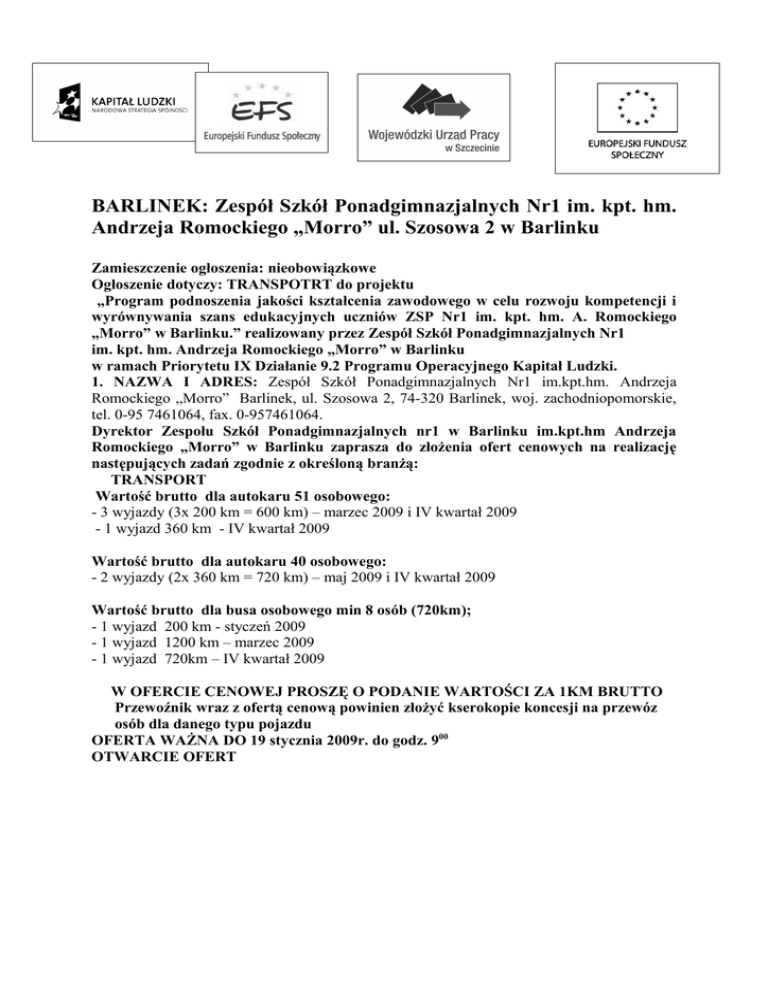 BARLINEK: Zespół Szkół Ponadgimnazjalnych Nr1 im. kpt. hm. Andrzeja Romockiego „Morro” ul. Szosowa 2 w Barlinku Zamieszczenie ogłoszenia: nieobowiązkowe Ogłoszenie dotyczy: TRANSPOTRT do projektu „Program podnoszenia jakości kształcenia zawodowego w celu rozwoju kompetencji i wyrównywania szans edukacyjnych uczniów ZSP Nr1 im. kpt. hm. A. Romockiego „Morro” w Barlinku.” realizowany przez Zespół Szkół Ponadgimnazjalnych Nr1 im. kpt. hm. Andrzeja Romockiego „Morro” w Barlinku w ramach Priorytetu IX Działanie 9.2 Programu Operacyjnego Kapitał Ludzki. 1. NAZWA I ADRES: Zespół Szkół Ponadgimnazjalnych Nr1 im.kpt.hm. Andrzeja Romockiego „Morro” Barlinek, ul. Szosowa 2, 74-320 Barlinek, woj. zachodniopomorskie, tel. 0-95 7461064, fax. 0-957461064. Dyrektor Zespołu Szkół Ponadgimnazjalnych nr1 w Barlinku im.kpt.hm Andrzeja Romockiego „Morro” w Barlinku zaprasza do złożenia ofert cenowych na realizację następujących zadań zgodnie z określoną branżą: TRANSPORT Wartość brutto dla autokaru 51 osobowego: - 3 wyjazdy (3x 200 km = 600 km) – marzec 2009 i IV kwartał 2009 - 1 wyjazd 360 km - IV kwartał 2009 Wartość brutto dla autokaru 40 osobowego: - 2 wyjazdy (2x 360 km = 720 km) – maj 2009 i IV kwartał 2009 Wartość brutto dla busa osobowego min 8 osób (720km); - 1 wyjazd 200 km - styczeń 2009 - 1 wyjazd 1200 km – marzec 2009 - 1 wyjazd 720km – IV kwartał 2009 W OFERCIE CENOWEJ PROSZĘ O PODANIE WARTOŚCI ZA 1KM BRUTTO Przewoźnik wraz z ofertą cenową powinien złożyć kserokopie koncesji na przewóz osób dla danego typu pojazdu OFERTA WAŻNA DO 19 stycznia 2009r. do godz. 900 OTWARCIE OFERT