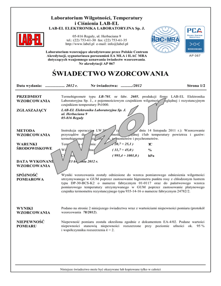 Laboratorium Wilgotności, Temperatury i Ciśnienia LAB-EL LAB-EL ELEKTRONIKA LABORATORYJNA Sp. J. 05-816 Reguły, ul. Herbaciana 9 tel.: (22) 753-61-30 fax: (22) 753-61-35 http://www.label.pl e-mail: [email protected] Laboratorium wzorcujące akredytowane przez Polskie Centrum Akredytacji, sygnatariusza porozumień EA MLA i ILAC MRA dotyczących wzajemnego uznawania świadectw wzorcowania. Nr akredytacji AP 067 ŚWIADECTWO WZORCOWANIA Data wydania: ................... 2012 r. Nr świadectwa: .........../2012 Strona 1/2 PRZEDMIOT WZORCOWANIA Termohigrometr typu LB-701, nr fabr. 2605, produkcji firmy LAB-EL Elektronika Laboratoryjna Sp. J., z pojemnościowym czujnikiem wilgotności względnej i rezystancyjnym czujnikiem temperatury Pt1000. ZGŁASZAJĄCY LAB-EL Elektronika Laboratoryjna Sp. J. ul. Herbaciana 9 05-816 Reguły METODA WZORCOWANIA Instrukcja operacyjna LW.SOP-14 (edycja 17, z dnia 14 listopada 2011 r.): Wzorcowanie przyrządów do pomiaru wilgotności względnej i/lub temperatury powietrza i gazów: termohigrometrów, higrometrów, termometrów i psychrometrów. WARUNKI ŚRODOWISKOWE Temperatura otoczenia: ( 20,7 ÷ 25,1 ) °C Wilgotność względna: ( 31,7 ÷ 45,0 ) % Ciśnienie: ( 995,4 ÷ 1001,0 ) hPa DATA WYKONANIA WZORCOWANIA 12 ÷ 13 kwietnia 2012 r. SPÓJNOŚĆ POMIAROWA Wyniki wzorcowania zostały odniesione do wzorca pomiarowego odniesienia wilgotności utrzymywanego w GUM poprzez zastosowanie higrometru punktu rosy z chłodzonym lustrem typu DP-30-BCS-K2 o numerze fabrycznym 01-0117 oraz do państwowego wzorca pomiarowego temperatury utrzymywanego w GUM poprzez zastosowanie platynowego czujnika termometru rezystancyjnego typu 935-14-16 o numerze fabrycznym 24782/2. WYNIKI WZORCOWANIA Podano na stronie 2 niniejszego świadectwa wraz z wartościami niepewności pomiaru (protokół wzorcowania 78/2012). NIEPEWNOŚĆ POMIARU Niepewność pomiaru została określona zgodnie z dokumentem EA-4/02. Podane wartości niepewności stanowią niepewności rozszerzone przy poziomie ufności ok. 95 % i współczynniku rozszerzenia k = 2. Niniejsze świadectwo może być okazywane lub kopiowane tylko w całości ŚWIADECTWO WZORCOWANIA wydane przez LABORATORIUM AKREDYTOWANE Nr AP 067 Data wydania: ................... 2012 r. WYNIKI WZORCOWANIA Nr świadectwa: .........../2012 Strona 2/2 Wyniki przeprowadzonego wzorcowania przedstawiono poniżej: Oznaczenia: RHw – wartość wilgotności względnej odniesienia [%], tw - wartość temperatury odniesienia [ºC], RHm - wskazanie wilgotności względnej wzorcowanego przyrządu [%], tm - wskazanie temperatury wzorcowanego przyrządu [ºC], ∆RH – błąd pomiaru wilgotności względnej wzorcowanego przyrządu [%], ∆RH = RHm - RHw ∆t – błąd pomiaru temperatury wzorcowanego przyrządu [ºC], ∆t = tm - tw URH - niepewność pomiaru wilgotności względnej [%], Ut - niepewność pomiaru temperatury [ºC]. Wyniki wzorcowania przed adiustacją: RHw tw RHm tm ∆RH URH ∆t Ut % ºC % ºC % % ºC ºC 57,0 22,13 56,4 22,06 -0,6 0,6 -0,07 0,12 Wyniki wzorcowania po adiustacji: RHw tw RHm tm ∆RH URH ∆t Ut % ºC % ºC % % ºC ºC 57,2 5,01 57,1 5,00 -0,1 1,3 -0,01 0,12 28,8 22,07 28,9 22,10 0,1 0,5 0,03 0,12 57,2 21,92 57,5 21,92 0,3 0,5 0,00 0,12 83,7 21,87 83,6 21,88 -0,1 0,7 0,01 0,12 57,0 42,02 57,2 42,01 0,2 0,5 -0,01 0,12 Podane wartości temperatury odnoszą się do Międzynarodowej Skali Temperatury z 1990 r. (MST-90). Autoryzował: