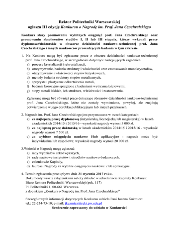 Rektor Politechniki Warszawskiej ogłasza III edycję Konkursu o Nagrodę im. Prof. Jana Czochralskiego Konkurs służy promowaniu wybitnych osiągnięć prof. Jana Czochralskiego oraz promowaniu absolwentów studiów I, II lub III stopnia, którzy wykonali prace dyplomowe/doktorskie w obszarze działalności naukowo-technicznej prof. Jana Czochralskiego i innych naukowców prowadzących badania w tym zakresie. 1. Na Konkurs mogą być zgłaszane prace z obszaru działalności naukowo-technicznej prof. Jana Czochralskiego, w szczególności dotyczące następujących zagadnień: a) procesy krystalizacji i rekrystalizacji, b) otrzymywanie, badania struktury i właściwości oraz zastosowania monokryształów, c) otrzymywanie i właściwości stopów łożyskowych, d) metody badania struktury stopów metalicznych, e) sprężyste i plastyczne odkształcenia metali, f) badania korozyjne sprzężone z badaniami wytrzymałościowymi, g) stopy metali lekkich, ich struktura, właściwości i zastosowania. Zgłaszane mogą być również prace dotyczące obszarów działalności naukowo-technicznej prof. Jana Czochralskiego, które nie zostały wymienione, powyżej, ale znajdują potwierdzenie w jego dorobku publikacyjnym lub innych przekazach. 2. Nagroda im. Prof. Jana Czochralskiego jest przyznawana w trzech kategoriach: a) za najlepszą pracę dyplomową (inżynierską, licencjacką lub magisterską) w latach akademickich 2014/15 i 2015/16 - wysokość nagrody wynosi 5 000 zł. b) za najlepszą pracę doktorską w latach akademickim 2014/15 i 2015/16 - wysokość nagrody wynosi 7 500 zł. c) za wybitne osiągnięcia naukowe i/lub aplikacyjne - nagroda może być indywidualna lub zespołowa; wysokość nagrody wynosi 20 000 zł. 3.Wnioski o Nagrodę mogą zgłaszać: a) rady wydziałów szkół wyższych, b) rady naukowe instytutów i ośrodków naukowo-badawczych, c) członkowie Kapituły, d) laureaci Nagrody za wybitne osiągnięcia naukowe i/lub aplikacyjne. 4. Termin zgłoszenia prac upływa dnia 31 stycznia 2017 roku. Dokumenty wraz z załącznikami należy składać w sekretariacie Kapituły Konkursu: Biuro Rektora Politechniki Warszawskiej (pok. 117) Pl. Politechniki 1, 00-661 Warszawa z dopiskiem „Konkurs o Nagrodę im. Prof. Jana Czochralskiego” Szczegółowych informacji dotyczących Konkursu udziela Pani Joanna Kuźmicz: tel.: 22-234-75-10; e-mail: [email protected] Serdecznie zapraszamy do udziału w Konkursie!