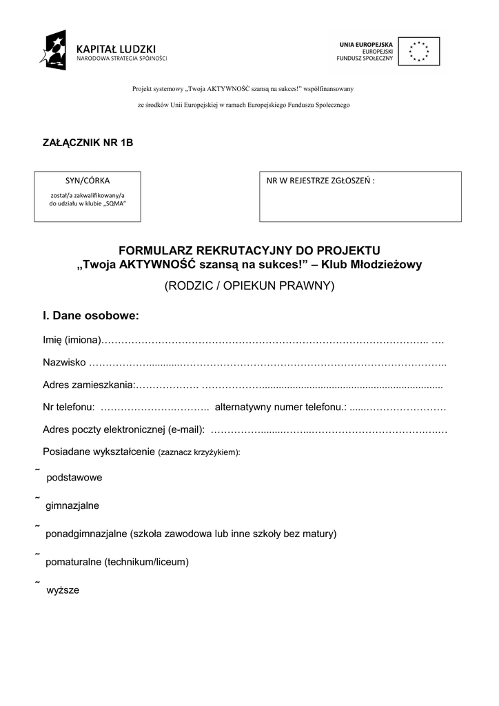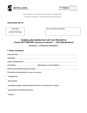 Projekt systemowy „Twoja AKTYWNOŚĆ szansą na sukces!” współfinansowany ze środków Unii Europejskiej w ramach Europejskiego Funduszu Społecznego ZAŁĄCZNIK NR 1B SYN/CÓRKA NR W REJESTRZE ZGŁOSZEŃ : został/a zakwalifikowany/a do udziału w klubie „SQMA” FORMULARZ REKRUTACYJNY DO PROJEKTU „Twoja AKTYWNOŚĆ szansą na sukces!” – Klub Młodzieżowy (RODZIC / OPIEKUN PRAWNY) I. Dane osobowe: Imię (imiona)…………………………………………………………………………………….. …. Nazwisko ………………...........…………………………………………………………………….. Adres zamieszkania:………………. ………………................................................................. Nr telefonu: ………………….……….. alternatywny numer telefonu.: ......…………………… Adres poczty elektronicznej (e-mail): ……………........……...…………………………….….… Posiadane wykształcenie (zaznacz krzyżykiem): podstawowe gimnazjalne ponadgimnazjalne (szkoła zawodowa lub inne szkoły bez matury) pomaturalne (technikum/liceum) wyższe II. Kryteria uczestnictwa w Projekcie Spełniam kryteria uczestnictwa w Projekcie (zaznacz krzyżykiem): • zamieszkuję na terenie Nowego Sącza, tak nie • jestem osobą nieaktywną zawodowo tak nie tak • osobą bezrobotną lub, lub, nie tak nie • zatrudnioną • ja lub osoby przebywające ze mną we wspólnym gospodarstwie tak nie domowym (w tym rodzina) korzystam z pomocy społecznej (na podstawie art.ustawy o pom. społecznej z dn. 12 marca 2004 roku(Dz.U z 2004r Nr 69,poz. 593 z późn. zm). • jestem rodzicem /opiekunem prawnym . ………………………………………, który/a złożył/a formularz zgłoszeniowy do Klubu „SQMA” do grupy młodzieży tak nie III. Informacje dodatkowe: 1. W jaki sposób Pan/Pani dowiedział/a się o Klubie Młodzieżowym? ………………………………………………………………………………………………….. ………………………………………………………………………………………………….. 2. Które z propozycji Klubu są dla Pani/Pana interesujące? …………………………………………………………………………………………………… ……………………………………………………………………………………………………. 3. Oczekiwania względem Projektu: ……………………………………………………………………………………………………… ……………………………………………………………………………………………………… 4. Czy posiada Pan/Pani orzeczenie o niepełnosprawności? nie tak: w stopniu lekkim w stopniu umiarkowanym w stopniu znacznym IV. Oświadczenia 1. Zapoznałam/em się z Regulaminem rekrutacji i uczestnictwa w Klubie „SQMA”. 2. Powyższe dane są prawdziwe. 3. Wyrażam zgodę na przetwarzanie moich danych osobowych zawartych w formularzu zgłoszenia dla potrzeb niezbędnych w procesie rekrutacji, zgodnie z ustawą z dnia 29.08.1997 roku o ochronie danych osobowych (Dz.U, Nr. 133 poz.883 z późn.zm). Nowy Sącz, dn. ……………..……………. ………..………..…………………….………… Czytelny Podpis Potencjalnego Uczestnika (wypełnia specjalista ds rekrutacji): …………………………………………………………………………………………………………… …………………………………………………………………………………………………………… …………………………………………………………………………………………………………… …………………………………………………………………………………………………………… …………………………………………………………………………………………………………… …………………………………………………………………………………………………………… …………………………………………………………………………………………………………… …………………………………………………………………………………………………………… …………………………………………………………………………………………………………… …………………………………………………………………………………………………………… …………………………………………………………………………………………………………… …………………………………………………………………………………………………………… …………………………………………………………………………………………………………… …………………………………………………………………………………………………………… …………………………………………………………………………………………………………… …………………………………………………………………………………………………………… …………………………………………………………………………………………………………… ………………………………………………………………………………………………….............. ................................................................................................................................................... Kryteria uczestnictwa: ……………………………………………………………………………………………………. ……………………