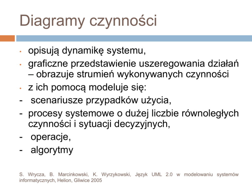 Diagramy czynności • • • - opisują dynamikę systemu, graficzne przedstawienie uszeregowania działań – obrazuje strumień wykonywanych czynności z ich pomocą modeluje się: scenariusze przypadków użycia, procesy systemowe o dużej liczbie równoległych czynności i sytuacji decyzyjnych, operacje, algorytmy S. Wrycza, B. Marcinkowski, K. Wyrzykowski, Język UML 2.0 w modelowaniu systemów informatycznych, Helion, Gliwice 2005 Podstawowe pojęcia • • • czynność - określone zachowanie złożone z logicznie uporządkowanych ciągów podczynności, przepływ sterowania – relacja między dwoma czynnościami, wskazująca, że po wykonaniu źródłowej sterowanie zostaje przekazane do docelowej, początek – punkt rozpoczęcia przepływu sterowania i danych inicjujący funkcjonowanie diagramu czynności, S. Wrycza, B. Marcinkowski, K. Wyrzykowski, Język UML 2.0 w modelowaniu systemów informatycznych, Helion, Gliwice 2005 Podstawowe pojęcia koniec – punkt zatrzymania przepływów sterowania na diagramie czynności zakończenie przepływu – punkt zatrzymania wybranego przepływu sterowania, pokazuje zatrzymanie sekwencji czynności przed jej całkowitym, zaplanowanym zrealizowaniem S. Wrycza, B. Marcinkowski, K. Wyrzykowski, Język UML 2.0 w modelowaniu systemów informatycznych, Helion, Gliwice 2005 Przepływy decyzyjne rzadko czynności uporządkowane są w sposób sekwencyjny, wiele przepływów alternatywnych, uzależnionych od spełnienia warunków czy wykonania iteracji, bloki decyzyjne mające charakter decyzji lub złączenia lub integracji decyzji i złączenia S. Wrycza, B. Marcinkowski, K. Wyrzykowski, Język UML 2.0 w modelowaniu systemów informatycznych, Helion, Gliwice 2005 Decyzja wyjście stanowią dwa lub więcej przepływów sterowania, z których tylko jeden może zostać zrealizowany. wybór jednego z przepływów determinowany jest przez wynik warunku, umieszczonego w nawiasie kwadratowym; warunki muszą się wzajemnie wykluczać. jeden z przepływów można oznaczyć „else”; przepływ ten zostanie zrealizowany tylko w przypadku gdy warunki dla wszystkich innych przepływów dotyczących danej decyzji nie zostaną spełnione. S. Wrycza, B. Marcinkowski, K. Wyrzykowski, Język UML 2.0 w modelowaniu systemów informatycznych, Helion, Gliwice 2005 Złączenie • • • zawiera szereg przepływów wejściowych i jeden wyjściowy, nie ma charakteru synchronizacyjnego – każdy przepływ będący wejściem do złączenia pociąga za sobą wykonanie wyjściowego przepływu sterowania, można specyfikować decyzję i złączenie alternatywnych przepływów w ramach jednego bloku decyzyjnego. S. Wrycza, B. Marcinkowski, K. Wyrzykowski, Język UML 2.0 w modelowaniu systemów informatycznych, Helion, Gliwice 2005 Przepływy współbieżne przybierają postać rozwidlenia lub scalenia, rozwidlenie – jeden wejściowy przepływ oraz co najmniej dwa wyjściowe, scalenie – przekazanie sterowania z wielu przepływów wejściowych do jednego wyjściowego, w punkcie scalenia równoległe procesy ulegają synchronizacji. S. Wrycza, B. Marcinkowski, K. Wyrzykowski, Język UML 2.0 w modelowaniu systemów informatycznych, Helion, Gliwice 2005 Partycje/Tory istnieje możliwość uwzględnienia miejsca realizacji czynności czy wskazanie instancji klasyfikatora odpowiedzialnej za jej funkcjonowanie . zmiana układu graficznego – wprowadzenie torów, tor – mechanizm grupowania elementów diagramu czynności powiązanych przepływami sterowania i przepływami danych, pełniących określoną, wspólną rolę na diagramie, wyznaczany w postaci pionowego lub poziomego toru, w którym pomiędzy dwoma liniami występują poszczególne elementy. Każdy tor jest jednoznacznie identyfikowany przez swoją nazwę. S. Wrycza, B. Marcinkowski, K. Wyrzykowski, Język UML 2.0 w modelowaniu systemów informatycznych, Helion, Gliwice 2005 Obszar przerwania • • • • grupa czynności, w obrębie której w wyniku działania przepływu przerwania realizacja wszystkich czynności jest bezzwłocznie przerwana, początek przepływu przerwania zaczyna się w obrębie obszaru a koniec poza nim, graficzna postać - czynność z krawędziami w postaci linii przerywanych, przepływ przerwania – błyskawica S. Wrycza, B. Marcinkowski, K. Wyrzykowski, Język UML 2.0 w modelowaniu systemów informatycznych, Helion, Gliwice 2005 Obszar przerwania Activity6 Activity3 Activity4 SignalAcceptState2 Activity5 Activity7 Sygnał asynchroniczny bodziec inicjujący czynność lub akcję; w ciągu czynności może zdarzyć się wysłanie sygnału, przyjęcie sygnału powoduje wykonanie czynności, symbolem wysyłania jest pięciokąt wypukły a otrzymania pięciokąt wklęsły. S. Wrycza, B. Marcinkowski, K. Wyrzykowski, Język UML 2.0 w modelowaniu systemów informatycznych, Helion, Gliwice 2005 Sygnał Symbolem wysyłania jest pięciokąt wypukły, a otrzymania pięciokąt wklęsły. SignalSendState1 SignalAcceptState1 Przepływ danych niektóre czynności są wykonywane z udziałem obiektów, • można to pokazać wprowadzając przepływ danych pomiędzy danym obiektem a czynnościami mającymi wpływ na ten obiekt. Kiedy to robimy? Gdy: • wskazujemy odpowiedzialność obiektu, • zmieniany jest stan obiektu, • obrazowany jest przepływ obiektu • S. Wrycza, B. Marcinkowski, K. Wyrzykowski, Język UML 2.0 w modelowaniu systemów informatycznych, Helion, Gliwice 2005 Przepływ danych Activity1 [ObjectFlowState1] Activity2 Diagramy czynności rozbudowane schematy blokowe pozwalają stosować procesy współbieżne, dobre narzędzie do modelowania przepływu zadań i programowania wielowątkowego, obrazują kolejne kroki operacji i procesów biznesowych, nie pokazują związków między obiektami a czynnościami -> diagramy interakcji S. Wrycza, B. Marcinkowski, K. Wyrzykowski, Język UML 2.0 w modelowaniu systemów informatycznych, Helion, Gliwice 2005