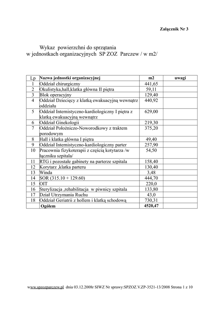 Załącznik Nr 3 Wykaz powierzchni do sprzątania w jednostkach organizacyjnych SP ZOZ Parczew / w m2/ Lp 1 2 3 4 5 6 7 8 9 10 11 12 13 14 15 16 17 18 Nazwa jednostki organizacyjnej m2 Oddział chirurgiczny Okulistyka,hall,klatka główna II piętra Blok operacyjny Oddział Dziecięcy z klatką ewakuacyjną wewnątrz oddziału Oddział Internistyczno-kardiologiczny I piętra z klatką ewakuacyjną wewnątrz Oddział Ginekologii Oddział Położniczo-Noworodkowy z traktem porodowym Hall i klatka główna I piętra Oddział Internistyczno-kardiologiczny parter Pracownia fizykoterapii z częścią kotytarza /w łączniku szpitala/ RTG i pozostałe gabinety na parterze szpitala Korytarz ,klatka parteru Winda SOR (315.10 + 129.60) OIT Sterylizacja ,rehabilitacja w piwnicy szpitala Dział Utrzymania Ruchu Oddział Geriatrii z hollem i klatką schodową 441,65 59,11 129,40 440,92 Ogółem 4520,47 uwagi 629,00 219,30 375,20 49,40 257,90 54,50 158,40 130,40 3,48 444,70 220,0 133,80 43,0 730,31 www.spzozparczew.pl dnia 03.12.2008r SIWZ Nr sprawy:SPZOZ.V.ZP-3521-13/2008 Strona 1 z 10 Oddział: Chirurgiczny aktualny na dzień 03.11.2008 rok Lp. 1. 2. 3. 4. 5. 6. 7. 8. 9. 10. 11. 12. 13. 14. 15. 16. 17. 18. 19. Pomieszczenie Kuchenka oddziałowa Sala 1 Sala 2 Sala 3 Sala 4 Sala 5 Gab. lekarski Gab. Rektoskopowy Łazienka męska+WC (8,5+8,2+3,7) Socjalny pielęgniarek Dyżurka pielęgniarek. Gab. zabiegowy Sala aseptyczna Sala 6 Magazynek sprzętu medycznego(wył.) Łazienka damska WC damskie Gab. Oddziałowej Korytarz wew. Razem Metraż [m2] 14,20 35,30 34,40 34,10 34,60 35,0 33,50 19,40 20,40 9,80 10,80 10,01 20,50 11,0 9,70 9,90 10,10 10,00 88,64 441,65 Lp. 1. 2. 3. Pomieszczenie Magazynek (wynajem okulistyki) Holl Klatka schodowa główna Razem (bez magazynku) Metraż [m2] 9,90 37,06 22,05 59,11 Oddział: Blok Operacyjny aktualny na dzień 03.11.2008 rok Lp. 1. 2. 3. 4. 5. 6. 7. 8. 9. 10. Pomieszczenie Korytarz wew. WC Pomieszczenie magazynowe Pomieszczenie magazynowe Natrysk Magazynek Sala operacyjna lewa Pomieszczenie dezynfekcji Sala operacyjna prawa Pomieszczenie socjalne Razem Metraż [m2] 36,20 2,50 4,4 3,3 2,2 3,2 25,40 7,90 26,10 18,20 129,40 www.spzozparczew.pl dnia 03.12.2008r SIWZ Nr sprawy:SPZOZ.V.ZP-3521-13/2008 Strona 2 z 10 Oddział: Dziecięcy aktualny na dzień 03.11.2008 rok Lp. 1. 2. 3. 4. 5. 6. 7. 8. 9. 10. 11. 12. 13. 14. 15. 16. 17. 18. 19. 20. 21. 22. 23. 24. 25. 26. 27. 28. 29. 30. 31. 32. Pomieszczenie Gab. ordynatora chirurgii Gab. ordynatora położnictwa Magazynek ginekologii (wyłączony) Korytarz przy w/w pomieszczeniach Izba Przyjęć Pokój zabaw Sala nr1 Sala nr 2 Sala nr 3 Dyżurka pielęgniarek Gab. zabiegowy Sala nr 4 Sala 5 Sala 6 Sala 7 Sala 8 Gabinet ordynatora Lekarski Łazienka Brudownik Izolatka II Gabinet oddziałowej Kuchnia mleczna Mag. bielizny Zabiegowy WC dzieci + prysznic WC personelu WC rodziców + prysznic Kuchenka Izolatka I Szatnia personelu Korytarz wew. Oddziału dziecięcego Razem 33. Klatka ewakuacyjna Ogółem Metraż [m2] 12,40 12,70 13,00 25,47 12,50 12,50 12,80 12,80 12,80 12,40 13,20 13,20 12,20 12,10 13,20 12,60 12,10 19,50 5,40 4,80 10,40 9,80 10,40 7,60 9,70 8,60 3,0 9,50 9,70 10,40 9,50 82,65 425,92 15,00 440,92 www.spzozparczew.pl dnia 03.12.2008r SIWZ Nr sprawy:SPZOZ.V.ZP-3521-13/2008 Strona 3 z 10 Oddział: Internistyczno – Kardiologiczny I-sze piętro aktualny na dzień 03.11.2008 rok Lp. 1. 2. 3. 4. 5. 6. 7. 8. 9. 10. 11. 12. 13. 14. 15. 16. 17. 18. 19. 20. 21. 22. 23. 24. 25. 26. 27. 28. Pomieszczenie Szatnia Pokój dziennego pobytu Sala 1 Sala 2 Sala 3 Sala 4 Sala 5 Sala R Sala 8 Gabinet z-cy ordynatora Gab. oddziałowej Gab. ordynatora Gab. lekarski Mag. oddziałowej Sala 10 WC damskie Łazienka damska Sala holtera ? Pkt pielęgniarski +gabinet zabiegowy Magazynek bielizny czystej Łazienka męska Brudownik + basenownia(wyłączony) WC męskie Kuchenka Socjalny pielęgniarek Izolatka Korytarz oddziału Klatka ewakuacyjna Razem(bez brudownika) Metraż [m2] 16,20 17,00 34,80 33,30 36,80 34,90 33,30 51,70 16,20 15,0 17,10 19,40 22,00 9,20 9,60 9,70 10,30 9,60 25,50 1,90 8,50 4,80 7,60 9,50 10,30 9,50 145,20 14,90 629,00 Oddział: Ginekologiczny aktualny na dzień 03.11.2008 roku Lp. 1. 2. 3. 4. 5. 6. 7. 8. 9. 10. Pomieszczenie Gabinet usg Łazienka Sala 1 Sala 2 Gab. zabiegowy WC Gab. oddz. Gab. lekarski Sala chorych Sala (położ.) Metraż [m2] 9,20 10,10 20,70 10,60 18,20 2,10 9,50 11,30 35,10 34,50 www.spzozparczew.pl dnia 03.12.2008r SIWZ Nr sprawy:SPZOZ.V.ZP-3521-13/2008 Strona 4 z 10 11. Korytarz wew. Razem 58,00 219,30 Oddział: Położniczo-Noworodkowy aktualny na dzień 03.11.2008 rok Lp. 1. 2. 3. 4. 5. 6. 7. 8. 9. 10. 11. 12. 13. 14. 15. 16. 17. 18. 19. 20. 21. 22. Pomieszczenie Sala WC Brudownik Łazienka Sala Sala Sala Dyżurka pielęgniarek Gabinet zabiegowy Gab. oddz. Sala O Gabinet zabiegowy Korytarz wew. Razem Gabinet socjalny położnych Sala cięć Pomieszczenie dezynfekcji Sala porodowa Brudownik WC personelu Natrysk WC położnic Korytarz wewnętrzny traktu Razem trakt porodowy Ogółem Metraż [m2] 19,40 7,80 4,4 8,3 9,50 21,20 20,80 10,20 32,00 10,30 9,90 9,30 102,70 265,80 9,90 21,00 6,80 34,50 2,2 1,90 1,90 1,70 29,50 109,40 375,20 Oddział: Inter.-Kardiol.+Oddział Ginek. -Położ. aktualny na dzień 03.11.2008 roku. Lp. Pomieszczenie 1. Holl 2. Klatka schodowa główna Razem Metraż [m2] 28,10 21,30 49,40 www.spzozparczew.pl dnia 03.12.2008r SIWZ Nr sprawy:SPZOZ.V.ZP-3521-13/2008 Strona 5 z 10 Oddział: Internistyczno-Kardiologiczny parter aktualny na dzień 03.11.2008 rok Lp. 1. 2. 3. 4. 5. 6. 7. 8. 9. 10. 11. 12. 13. 14. 15. 16. 17. Pomieszczenie Sala 2 Gab. zabiegowy sala. sala Sala Łazienka D Klatka schodowa sala Sala Gab. pielegniarek wc Sala terapii zajęciowej Sala jednołóżkowa Kuchenka Łazienka Brudownik. Korytarz wewnętrzny Razem Metraż [m2] 16,90 16,50 16,30 18,00 16,30 14,50 14,90 15,00 15,90 19,40 1,10 5,20 7,00 9,70 9,80 7,40 54,00 257,90 Oddział: Fizykoterapia Lp. Pomieszczenie 
