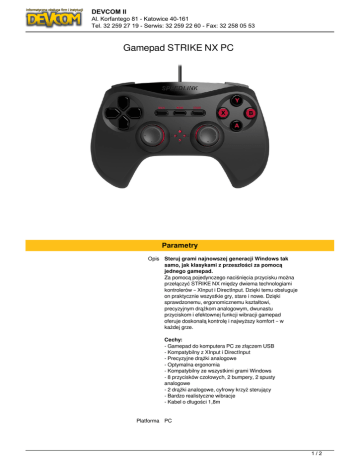 DEVCOM II Al. Korfantego 81 - Katowice 40-161 Tel. 32 259 27 19 - Serwis: 32 259 22 60 - Fax: 32 258 05 53 Gamepad STRIKE NX PC Parametry Opis Steruj grami najnowszej generacji Windows tak samo, jak klasykami z przeszłości za pomocą jednego gamepad. Za pomocą pojedynczego naciśnięcia przycisku można przełączyć STRIKE NX między dwiema technologiami kontrolerów – XInput i DirectInput. Dzięki temu obsługuje on praktycznie wszystkie gry, stare i nowe. Dzięki sprawdzonemu, ergonomicznemu kształtowi, precyzyjnym drążkom analogowym, dwunastu przyciskom i efektownej funkcji wibracji gamepad oferuje doskonałą kontrolę i najwyższy komfort – w każdej grze. Cechy: - Gamepad do komputera PC ze złączem USB - Kompatybilny z XInput i DirectInput - Precyzyjne drążki analogowe - Optymalna ergonomia - Kompatybilny ze wszystkimi grami Windows - 8 przycisków czołowych, 2 bumpery, 2 spusty analogowe - 2 drążki analogowe, cyfrowy krzyż sterujący - Bardzo realistyczne wibracje - Kabel o długości 1,8m Platforma PC 1/2 DEVCOM II Al. Korfantego 81 - Katowice 40-161 Tel. 32 259 27 19 - Serwis: 32 259 22 60 - Fax: 32 258 05 53 Połączenie Przewodowe Długość przewodu 1.8 Interfejs USB Liczba przycisków 12 Liczba gałek analogowych 2 D-pad Tak Wibracje Tak Force feedback Tak USB 5V Kolor Czarny 2/2 Powered by TCPDF (www.tcpdf.org)