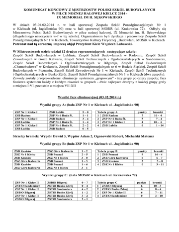 KOMUNIKAT KOŃCOWY Z MISTRZOSTW POLSKI SZKÓŁ BUDOWLANYCH W PIŁCE NOŻNEJ HALOWEJ KIELCE 2014 IX MEMORIAŁ IM H. SĘKOWSKIEGO W dniach 03-04.02.2014 r. w hali sportowej Zespołu Szkół Ponadgimnazjalnych Nr 1 w Kielcach (ul. Jagiellońska 90) oraz w hali sportowej MOSiR (ul. Krakowska 72). Odbyły się Mistrzostwa Polski Szkól Budowlanych w piłce nożnej halowej, IX Memoriał im. H. Sękowskiego (długoletniego nauczyciela w-f w tej szkole). Organizatorem byli dyrekcja i pracownicy Zespołu Szkół Ponadgimnazjalnych Nr 1 w Kielcach, Towarzystwo Kultury Fizycznej „Budowlani, MOSiR w Kielcach Patronat nad tą coroczną imprezą objął Prezydent Kielc Wojciech Lubawski. W Mistrzostwach wzięło udział 12 drużyn reprezentujących następujące szkoły: Zespół Szkół Budowlanych w Lublinie, Zespół Szkół Budowlanych w Radomiu, Zespół Szkół Zawodowych w Górze Kalwarii, Zespół Szkół Technicznych i Ogólnokształcących w Sandomierzu, Zespół Szkół Budowlanych i Ogólnokształcących w Biłgoraju, Zespół Szkół Budowlanych „Chemobudowa” w Krakowie, Zespół Szkół Ponadgimnazjalnych nr 6 w Rudzie Śląskiej, Zespół Szkół Budowlanych w Poznaniu, Zespół Szkół Zawodowych Nr 1 w Kielcach, Zespół Szkół Technicznych i Ogólnokształcących w Busko Zdrój, Zespół Szkół Ponadgimnazjalnych Nr 1 w Kielcach (dwa zespoły). Zawody zostały przeprowadzone: eliminacje systemem ,,grupowym” - trzy grupy po cztery zespoły; faza finałowa systemem każdy z każdym również w grupach - dwie najlepsze drużyny z każdej grupy grały o miejsca I-VI, pozostałe o miejsca VII-XII Wyniki fazy eliminacyjnej (03.02.2014 r.) Wyniki grupy A: (hala ZSP Nr 1 w Kielcach ul . Jagiellońska 90) ZSP Nr 1 Kielce I ZSB Radom ZSP Nr 1 Kielce I ZSB Lublin ZSP Nr 1 Kielce I ZSB Lublin ZSB Lublin ZSP Nr 6 Ruda Śl. ZSB Radom ZSP Nr 6 Ruda Śl. ZSP Nr 6 Ruda Śl. ZSB Radom 5–0 1–1 3–4 1–4 2–2 0–5 Tabela grupy A 1 ZSB Radom 2 ZSP Nr 6 Ruda Śl. 3 ZSP Nr 1 Kielce I 4 ZSB Lublin punkty 7 5 4 0 bramki 10 - 4 7–4 10 – 6 1 – 14 Strzelcy bramek: Wypiór Dawid 3, Wypiór Adam 2, Ogonowski Robert, Michalski Mateusz Wyniki grupy B: (hala ZSP Nr 1 w Kielcach ul . Jagiellońska 90) ZSB Kraków ZSZ Nr 1 Kielce ZSB Kraków ZSZ Góra Kalwaria ZSB Kraków ZSZ Góra Kalwaria ZSZ Góra Kalwaria ZSB Poznań ZSZ Nr 1 Kielce ZSB Poznań ZSB Poznań ZSZ Nr 1 Kielce 1–2 2–5 3–0 1–5 1–6 3–1 Tabela grupy B 1 ZSB Poznań 2 ZSZ Góra Kalwaria 3 ZSB Kraków 4 ZSZ Nr 1 Kielce punkty 9 6 3 0 bramki 16 – 4 6–7 5–8 3 – 11 Wyniki grupy C: (hala MOSiR w Kielcach ul. Krakowska 72) ZSP Nr 1 Kielce II ZSTiO Sandomierz ZSP Nr 1 Kielce II ZSBiO Biłgoraj ZSP Nr 1 Kielce II ZSBiO Biłgoraj ZSBiO Biłgoraj ZSTiO Busko Zdrój ZSTiO Sandomierz ZSTiO Busko Zdrój ZSTiO Busko Zdrój ZSTiO Sandomierz 0–7 0–4 4–2 1–2 3–2 2–1 Tabela grupy C 1 ZSBiO Biłgoraj 2 ZSTiO Busko Zdrój 3 ZSP Nr 1 Kielce II 4 ZSTiO Sandomierz punkty 6 6 6 0 bramki 10 – 3 8–4 7 – 11 3 – 10 Wyniki fazy finałowej wtorek (04.02.2014 r.) o miejsca I – VI (hala ZSP Nr 1 w Kielcach ul. Jagiellońska 90) uwaga wyniki trzech pierwszych meczów to mecze z eliminacji zaliczone do fazy finałowej ZSB Radom ZSB Poznań ZSBiO Biłgoraj ZSB Radom ZSP Nr 6 Ruda Śląska ZSB Poznań ZSB Radom ZSZ Góra Kalwaria ZSP Nr 6 Ruda Śląska ZSB Radom ZSTiO Busko Zdrój ZSZ Góra Kalwaria ZSB Radom ZSBiO Biłgoraj ZSTiO Busko Zdrój ZSP Nr 6 Ruda Śląska ZSZ Góra Kalwaria ZSTiO Busko Zdrój ZSZ Góra Kalwaria ZSTiO Busko Zdrój ZSBiO Biłgoraj ZSTiO Busko Zdrój ZSBiO Biłgoraj ZSB Poznań ZSBiO Biłgoraj ZSB Poznań ZSP Nr 6 Ruda Śląska ZSB Poznań ZSP Nr 6 Ruda Śląska ZSZ Góra Kalwaria 1–1 5–1 1–2 3–2 1–0 1–0 4–1 3–2 2–2 1–2 1–4 1–1 5–2 1–0 7–3 Tabela grupy finałowej o miejsca I-VI 1 ZSB Radom 2 ZSB Poznań 3 ZSBiO Biłgoraj 4 ZSTiO Busko Zdrój 5 ZSP Nr 6 Ruda Śląska 6 ZSZ Góra Kalwaria pkt bramki 10 10 6 6 6 4 14 – 8 14 – 9 6– 7 11 – 13 5– 5 10 – 18 Strzelcy bramek: Michalski Mateusz 3, Ogonowski Robert. o miejsca VII – XII (hala MOSiR w Kielcach ul. Krakowska 72) uwaga wyniki trzech pierwszych meczów to mecze z eliminacji zaliczone do fazy finałowej ZSP Nr 1 Kielce I ZSB Kraków ZSP Nr 1 Kielce II ZSP Nr 1 Kielce I ZSB Lublin ZSB Kraków ZSP Nr 1 Kielce I ZSZ Nr 1 Kielce ZSB Lublin ZSP Nr 1 Kielce I ZSTiO Sandomierz ZSZ Nr 1 Kielce ZSP Nr 1 Kielce I ZSP Nr 1 Kielce II ZSTiO Sandomierz ZSB Lublin ZSZ Nr 1 Kielce ZSTiO Sandomierz BIV ZSZ Nr 1 Kielce ZSTiO Sandomierz ZSP Nr 1 Kielce II ZSTiO Sandomierz ZSP Nr 1 Kielce II ZSB Kraków ZSP Nr 1 Kielce II ZSB Kraków ZSB Lublin ZSB Kraków ZSB Lublin ZSZ Nr 1 Kielce Ostateczna kolejność: 1. ZSB Radom 2. ZSB Poznań 3. ZSBiO Biłgoraj 4. ZSTiO Busko Zdrój 5. ZSP Nr 6 Ruda Śląska 6. ZSZ Góra Kalwaria 7. ZSP Nr 1 Kielce I 8. ZSB Kraków 9. ZSZ Nr 1 Kielce 10. ZSP Nr 1 Kielce II 11. ZSTiO Sandomierz 12. ZSB Lublin 5–0 3–0 4–2 3–1 1–2 0–3 4–0 1–0 1–4 5–2 1–2 11 – 0 5–4 4–4 0–3 Tabela grupy finałowej o miejsca VII-XII 1 ZSP Nr 1 Kielce I 2 ZSB Kraków 3 ZSZ Nr 1 Kielce 4 ZSP Nr 1 Kielce II 5 ZSTiO Sandomierz 6 ZSB Lublin pkt bramki 15 9 9 7 3 1 22 – 7 13 – 10 16 – 6 13 – 12 5 – 14 6 – 26 Wyróżnienia indywidualne otrzymali: Najlepszy zawodnik – Krystian Orzechowski (ZSB Radom) Najlepszy bramkarz – Daniel Mężyk (ZSP Nr 6 Ruda Śl.) Najlepszy strzelec – Mateusz Kądzielski (ZSTiO Busko Zdrój) Specjalne wyróżnienia otrzymali: Nagroda Fair Play – ZSB w Poznaniu Nagroda za najpiękniejszą bramkę – Jakub Rudnicki (ZSB Poznań)
