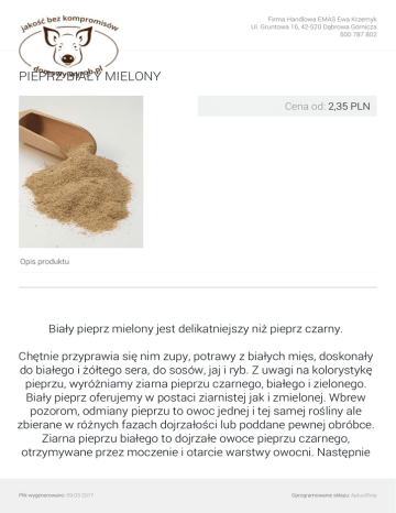 Firma Handlowa EMAS Ewa Krzemyk Ul. Gruntowa 16, 42-520 Dąbrowa Górnicza 500 787 802 PIEPRZ BIAŁY MIELONY Cena od: 2,35 PLN Opis produktu Biały pieprz mielony jest delikatniejszy niż pieprz czarny. Chętnie przyprawia się nim zupy, potrawy z białych mięs, doskonały do białego i żółtego sera, do sosów, jaj i ryb. Z uwagi na kolorystykę pieprzu, wyróżniamy ziarna pieprzu czarnego, białego i zielonego. Biały pieprz oferujemy w postaci ziarnistej jak i zmielonej. Wbrew pozorom, odmiany pieprzu to owoc jednej i tej samej rośliny ale zbierane w różnych fazach dojrzałości lub poddane pewnej obróbce. Ziarna pieprzu białego to dojrzałe owoce pieprzu czarnego, otrzymywane przez moczenie i otarcie warstwy owocni. Następnie Plik wygenerowano: 09-03-2017 Oprogramowanie sklepu: AptusShop Firma Handlowa EMAS Ewa Krzemyk Ul. Gruntowa 16, 42-520 Dąbrowa Górnicza 500 787 802 po osuszeniu, otrzymane szare pestki staną się żółtawobiałe. Warianty produktu 25g 2,35 PLN 94,00 PLN/1KG 100g 8,50 PLN 85,00 PLN/1KG 250g 21,00 PLN 84,00 PLN/1KG Plik wygenerowano: 09-03-2017 Powered by TCPDF (www.tcpdf.org) Oprogramowanie sklepu: AptusShop