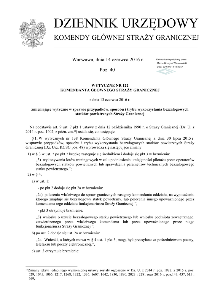 DZIENNIK URZĘDOWY KOMENDY GŁÓWNEJ STRAŻY GRANICZNEJ Warszawa, dnia 14 czerwca 2016 r. Elektronicznie podpisany przez: Marcin Grzegorz Własnowolski Poz. 40 Data: 2016-06-14 10:35:57 WYTYCZNE NR 122 KOMENDANTA GŁÓWNEGO STRAŻY GRANICZNEJ z dnia 13 czerwca 2016 r. zmieniające wytyczne w sprawie przypadków, sposobu i trybu wykorzystania bezzałogowych statków powietrznych Straży Granicznej Na podstawie art. 9 ust. 7 pkt 1 ustawy z dnia 12 października 1990 r. o Straży Granicznej (Dz. U. z 2014 r. poz. 1402, z późn. zm.1)) ustala się, co następuje: § 1. W wytycznych nr 138 Komendanta Głównego Straży Granicznej z dnia 30 lipca 2015 r. w sprawie przypadków, sposobu i trybu wykorzystania bezzałogowych statków powietrznych Straży Granicznej (Dz. Urz. KGSG poz. 48) wprowadza się następujące zmiany: 1) w § 3 w ust. 2 po pkt 2 kropkę zastępuje się średnikiem i dodaje się pkt 3 w brzmieniu: „3) wykonywania lotów treningowych w celu podniesienia umiejętności pilotażu przez operatorów bezzałogowych statków powietrznych lub sprawdzenia parametrów technicznych bezzałogowego statku powietrznego.”; 2) w § 4: a) w ust. 1: - po pkt 2 dodaje się pkt 2a w brzmieniu: „2a) polecenia właściwego do spraw granicznych zastępcy komendanta oddziału, na wyposażeniu którego znajduje się bezzałogowy statek powietrzny, lub polecenia innego upoważnionego przez komendanta tego oddziału funkcjonariusza Straży Granicznej;”, - pkt 3 otrzymuje brzmienie: „3) wniosku o użycie bezzałogowego statku powietrznego lub wniosku podmiotu zewnętrznego, zatwierdzonego przez właściwego komendanta lub przez upoważnionego przez niego funkcjonariusza Straży Granicznej.”, b) po ust. 2 dodaje się ust. 2a w brzmieniu: „2a. Wnioski, o których mowa w § 4 ust. 1 pkt 3, mogą być przesyłane za pośrednictwem poczty, telefaksu lub poczty elektronicznej.”, c) ust. 3 otrzymuje brzmienie: 1) Zmiany tekstu jednolitego wymienionej ustawy zostały ogłoszone w Dz. U. z 2014 r. poz. 1822, z 2015 r. poz. 529, 1045, 1066, 1217, 1268, 1322, 1336, 1607, 1642, 1830, 1890, 2023 i 2281 oraz 2016 r. poz.147, 437, 615 i 669. Dziennik Urzędowy Komendy Głównej Straży Granicznej „3. Wzór wniosku do wytycznych.”; o użycie –2– bezzałogowego Poz. 40 statku powietrznego określa załącznik 3) w § 6: a) ust. 1 otrzymuje brzmienie: „1. Podstawą wykorzystania bezzałogowego statku powietrznego w trybie wnioskowym są zatwierdzone pisemne wnioski, o których mowa w § 4 ust. 1 pkt 3.”, b) w ust. 2 wprowadzenie do wyliczenia otrzymuje brzmienie: „2. Pisemny wniosek o użycie bezzałogowego statku powietrznego do komendanta składa:”; 4) w § 7: a) ust. 1 otrzymuje brzmienie: „1. Wykorzystanie bezzałogowego statku powietrznego w trybie alarmowym odbywa się w przypadku zdarzeń wymagających natychmiastowego jego użycia, gdy nie ma możliwości wcześniejszego wystąpienia z pisemnym wnioskiem.”, b) w ust. 2 po pkt 2 kropkę zastępuje się średnikiem i dodaje się pkt 3 w brzmieniu: „3) osoby, o której mowa w § 4 ust. 1 pkt 2a.”, c) ust. 4 i 5 otrzymują brzmienie: „4. Ustny wniosek, o którym mowa w ust. 3, w przypadku wykorzystania bezzałogowego statku powietrznego potwierdzany jest pisemnym poleceniem lub wnioskiem, złożonym w terminie siedmiu dni od daty wykorzystania bezzałogowego statku powietrznego, zgodnie z zasadami określonymi w § 6 ust. 2 i 3, które mają zastosowanie w trybie wnioskowym. 5. W przypadku ustnego polecenia wykorzystania bezzałogowego statku powietrznego wydanego przez Komendanta Głównego Straży Granicznej zostaje ono potwierdzone poprzez złożenie przez Dyrektora-Szefa Sztabu Komendanta Głównego Straży Granicznej pisemnego wniosku o użycie bezzałogowego statku powietrznego do właściwego komendanta, w terminie siedmiu dni od daty wykorzystania bezzałogowego statku powietrznego.”; 5) po § 9 dodaje się § 9a w brzmieniu: „§ 9a. 1. Operator bezzałogowego statku powietrznego w przypadku wystąpienia podczas wykonywania lotu sytuacji awaryjnej, polegającej na utracie łączności uniemożliwiającej pilotowanie bezzałogowego statku powietrznego, uruchamia procedurę awaryjną polegającą na poinformowaniu drogą radiową lub telefoniczną właściwej Służby Informacji Powietrznej (Flight Information Service - FIS), a także służby dyżurnej operacyjnej oddziału lub ośrodka Straży Granicznej. 2. Operator bezzałogowego statku powietrznego podczas kontaktu z właściwą Służbą Informacji Powietrznej (Flight Information Service - FIS) podaje następujące dane: 1) numer strefy lub stref, w których nastąpiło zerwanie łączności oraz jej przybliżony rejon lub część; 2) czas, w którym utracono kontakt z bezzałogowym statkiem powietrznym; 3) czas pozostały do wyczerpania baterii (wartość ładunku elektrycznego na akumulatorach); 4) ostatnią zarejestrowaną prędkość; 5) ostatnio obrany kurs (kierunek lotu); 6) ostatnią zarejestrowaną wysokość na jakiej znajdował się bezzałogowy statek powietrzny lub została utracona łączność; 7) inne istotne informacje wynikające ze specyfiki zdarzenia. Dziennik Urzędowy Komendy Głównej Straży Granicznej –3– Poz. 40 3. Z uwagi na możliwość samodzielnego powrotu bezzałogowego statku powietrznego operator bezzałogowego statku powietrznego udziela informacji, o których mowa w ust. 1, po upływie 5 min. od utraty łączności z bezzałogowym statkiem powietrznym lub niezwłocznie w przypadku, gdy posiada informację, iż w sąsiednich strefach lub innych elementach przestrzeni powietrznej w pobliżu których wykonywany był lot bezzałogowym statkiem powietrznym, może odbywać się przelot innego statku powietrznego posiadającego zezwolenie właściwego organu służby ruchu lotniczego lub organizatora lotów ze strony Straży Granicznej. 4. W przypadku nawiązania ponownego kontaktu z bezzałogowym statkiem powietrznym lub odz