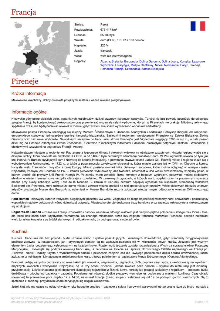 Francja Stolica: Paryż Powierzchnia: 675 417 km² Ludność: 65 700 tys. Waluta: euro (EUR), 1 EUR = 100 centów Napięcie: 220 V Język: francuski Wiza: wiza nie jest wymagana Regiony: Alzacja, Bretania, Burgundia, Dolina Garonny, Dolina Loary, Korsyka, Lazurowe Wybrzeże, Lotaryngia, Masyw Centralny, Nicea, Normandia, Paryż, Pireneje, Północna Francja, Szampania, Zatoka Biskajska Pireneje Krótka informacja Malownicze krajobrazy, doliny osłonięte potężnymi skałami i ważne miejsce pielgrzymkowe. Informacje ogólne Niezwykłe góry pełne sielskich dolin, wspaniałych krajobrazów, dzikiej przyrody i stromych szczytów. Turyści nie bez powodu podróżują do odległego zakątka Francji, by kontemplować piękno natury oraz przemierzać wspaniałe szlaki wędrowne, których w Pirenejach nie brakuje. Miłośnicy aktywnego spędzania czasu nie będą narzekać również w ziemie, gdyż w wielu miejscach wyznaczono wspaniałe nartostrady. Malownicze pasma Pirenejów rozciągają się między Morzem Śródziemnym a Oceanem Atlantyckim i oddzielają Półwysep Iberyjski od kontynentu europejskiego stanowiąc jednocześnie granicę francusko-hiszpańską. Sąsiednimi regionami turystycznymi Pirenejów są Zatoka Biskajska, Dolina Garonny oraz Lazurowe Wybrzeże. Najwyższym szczytem po francuskiej stronie Pirenejów jest Vignemale sięgający 3298 m n.p.m., a całe pasmo dzieli się na Pireneje Atlantyckie zwane Zachodnimi, Centralne z nielicznymi lodowcami i dolinami osłoniętymi potężnymi skałami i Wschodnie z efektownymi szczytami na pograniczu Francji i Andory. Najważniejszym miastem w regionie jest Pau znane z łagodnego klimatu i pięknych widoków na ośnieżone szczyty gór. Historia regionu wiąże się z dziejami stolicy, która powstała na przełomie X i XI w., a od 1464 r. była centralnym ośrodkiem hrabstwa Bearn. W Pau wybuchła rewolta po tym, jak król Henryk IV Burbon przyłączył Bearn i Nawarrę do korony francuskiej, a powstanie krwawo stłumił Ludwik XIII. Rozwój miasta i regionu wiąże się z wybudowaniem Uniwersytetu w 1722 r., a także z popularnością turystyczno-rekreacyjną, którą miasto zyskało już w XVIII w. Obecnie z kurortu korzysta wielu Francuzów i turystów z całej Europy. Miasto posiada również kilka ciekawych zabytków, które można oglądnąć w wolnym czasie. Najbardziej znanym jest Chateau de Pau – zamek pierwotnie wybudowany jako twierdza, natomiast w XVI wieku przekształcony w piękny pałac, w którym urodził się przyszły król Francji Henryk IV. W zamku warto zwiedzić liczne komnaty z bogatym wystrojem, podziwiać można dodatkowo efektowne wieże i renesansowe skrzydła otaczające dziedziniec. W zamkowych ogrodach, w których warto spędzić czas na przyjemnym spacerze można przy okazji zobaczyć wieżę Tour de la Monnaie. Z zamku w kierunku centrum najlepiej wydostać się wspaniałą promenadą widokową Boulevard des Pyrenees, która uchodzi za dumę miasta i zawsze można spotkać na niej spacerujących turystów. Wiele ciekawych obrazów znanych artystów prezentuje Musee des Beaux-Arts, natomiast w Musee Brandotte można zobaczyć między innymi odtworzone wnętrze XVIII-wiecznego domu. Font-Romeu– niezwykły kurort z tradycjami sięgającymi początku XX wieku. Zaglądają do niego najczęściej miłośnicy nart i snowboardu poszukujący wspaniałych stoków położonych wśród dziewiczej przyrody. Miasteczko oferuje doskonałą bazę hotelową oraz zaplecze rekreacyjne z niekończącymi się atrakcjami. Bagneres-de-Luchon – znane we Francji uzdrowisko i ośrodek narciarski, którego walorem jest nie tylko piękne położenie u zbiegu rzek Pique i One, ale także doskonała baza turystyczno-rekreacyjna. Do znanego miasteczka przed laty zaglądał francuski marszałek Richelieu, obecnie natomiast wielu turystów korzysta z ze źródeł siarkowych i radioaktywnych, by podreperować swoje zdrowie. Kuchnia Kuchnia francuska nie bez powodu budzi uznanie wśród turystów poszukujących kulinarnych doświadczeń, gdyż standardy przygotowywania posiłków zarówno w restauracjach, jak i prywatnych domach są na wyższym poziomie niż w większości innych krajów. Jedzenie jest ważnym elementem życia codziennego, celebrowanym na każdym kroku. Przyjemność jedzenia została przywieziona z Włoch za sprawą księżnej Katarzyny Medycejskiej, rozwinęła się podczas rewolucji francuskiej, a zaistniała na świecie za sprawą filozoficznego traktatu napisanego we Francji pt.: „Filozofia smaku”. Każdy turysta o wyrafinowanym smaku z pewnością znajdzie coś dla swojego podniebienia dzięki bardzo urozmaiconej kuchni związanej z rolniczym i klimatycznym zróżnicowaniem kraju, a także położeniem w sąsiedztwie Morza Śródziemnego i Oceanu Atlantyckiego. Francuzi jadają wszystko począwszy od mięs takich jak wołowina, wieprzowina, jagnięcina, drób, poprzez sery i ryby, a skończywszy na wyrobach mącznych, owocach i warzywach. Najczęściej są to trzy posiłki dziennie jadane również poza domem – wyjście do restauracji jest niemałą przyjemnością. Lekkie śniadania (petit dejeuner) składają się najczęściej z filiżanki kawy, herbaty lub gorącej czekolady z rogalikiem – croissant, bułką drożdżową – brioche lub bagietką – baguette. Popularne jest również słodkie pieczywo viennoiseries podawane z masłem i konfiturą. Czas obiadu (dejeuner) to przeważnie pora między 12 a 14:30, natomiast kolacje (diner, souper) celebruje się od 19 do późnych godzin wieczornych. Są to spotkania z rodziną i przyjaciółmi charakteryzujące się długimi rozmowami. Jeżeli ktoś nie ma czasu na obiad chwyta w rękę baguette crudites – bagietkę z sałatą i surowymi warzywami lub po prostu idzie do bistro na stek z Wydruk ze strony http://taniewakacje.pl/index.php/wyszukiwarka-online.html Informacje przygotowane przez MerlinX Strona 1/6 frytkami. Turyści próbujący kupić