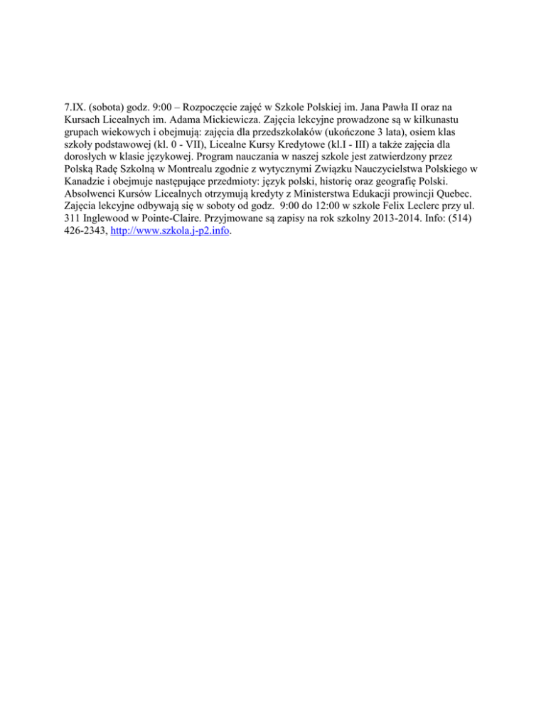 7.IX. (sobota) godz. 9:00 – Rozpoczęcie zajęć w Szkole Polskiej im. Jana Pawła II oraz na Kursach Licealnych im. Adama Mickiewicza. Zajęcia lekcyjne prowadzone są w kilkunastu grupach wiekowych i obejmują: zajęcia dla przedszkolaków (ukończone 3 lata), osiem klas szkoły podstawowej (kl. 0 - VII), Licealne Kursy Kredytowe (kl.I - III) a także zajęcia dla dorosłych w klasie językowej. Program nauczania w naszej szkole jest zatwierdzony przez Polską Radę Szkolną w Montrealu zgodnie z wytycznymi Związku Nauczycielstwa Polskiego w Kanadzie i obejmuje następujące przedmioty: język polski, historię oraz geografię Polski. Absolwenci Kursów Licealnych otrzymują kredyty z Ministerstwa Edukacji prowincji Quebec. Zajęcia lekcyjne odbywają się w soboty od godz. 9:00 do 12:00 w szkole Felix Leclerc przy ul. 311 Inglewood w Pointe-Claire. Przyjmowane są zapisy na rok szkolny 2013-2014. Info: (514) 426-2343, http://www.szkola.j-p2.info.