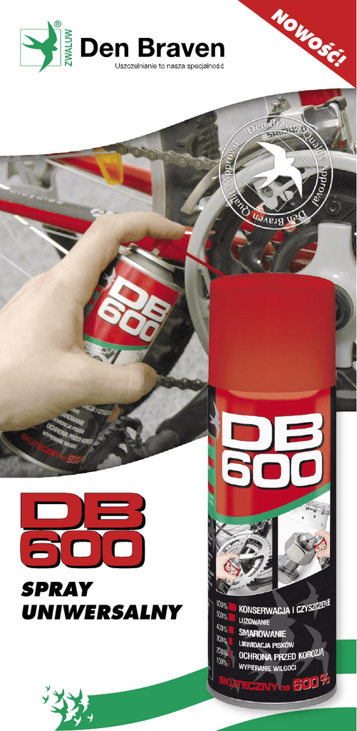 NO W OÂ SPRAY UNIWERSALNY å! NO W OÂ å! SPRAY UNIWERSALNY WIELOFUNKCYJNY, 6 w 1 EFEKTYWNY SKUTECZNY NA 600% KONSERWUJE I CZYÂCI • elementy metalowe i chromowane, elektronarz´dzia, urzàdzenia biurowe, okucia, felgi • ochrona cz´Êci pracujàcych w warunkach chłodu, brudu i wilgoci; usuwanie uporczywych zabrudzeƒ oraz rozpuszczanie materiałów samoprzylepnych LUZUJE • zanieczyszczone i zardzewiałe: Êruby, nakr´tki, zamki, okucia, klamki, dêwignie, suwaki • dzi´ki dodatkom nawil˝ajàcym wnika pomi´dzy zatarte elementy SMARUJE • zamki, zawiasy, styki, połàczenia mechaniczne, spr´˝yny, łaƒcuchy • łàczy w jednym produkcie zalety Êrodka antykorozyjnego, czyszczàcego, oleju i smaru LIKWIDUJE PISKI • w zawiasach, krzesłach obrotowych, mechanizmach meblowych, maszynach do szycia, zegarach i pralkach • przedostaje si´ pod brud, plamy i tłuszcz CHRONI PRZED KOROZJÑ • sprz´t: sportowy (np. rowery, płozy ły˝ew i sanek), w´dkarski, ogrodniczy (np. kosiarki, taczki) • przedostaje si´ pod rdz´ i rozprowadza Êrodki antykorozyjne WYPIERA WILGOå • z elementów metalowych i mechanicznych, styków elektrycznych, elementów zapłonowych (Êwiece, przewody, cewki) • tworzy barier´ ochronnà, jako izolator szybko eliminuje spi´cia Konkurencyjny wobec konwencjonalnych smarów penetrujàcych obecnych na rynku. Zawiera specjalne antykorozyjne dodatki, Êrodki nawil˝ajàce i poÊlizgowe. Równomiernie si´ rozprowadza i ÊciÊle przywiera do wszystkich ruchomych cz´Êci. Ma przyjemny zapach, bez łatwopalnych gazów (tylko CO2), wolny od silikonu (nie przyciàga kurzu) i nie niszczy uszczelek. Art. Nr: 300417 ATEST: PZH PATRZ: Karta katalogowa 7.35A
