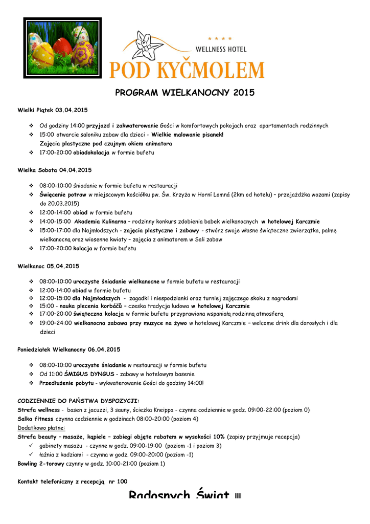 PROGRAM WIELKANOCNY 2015 Wielki Piątek 03.04.2015 ! Od godziny 14:00 przyjazd i zakwaterowanie Gości w komfortowych pokojach oraz apartamentach rodzinnych ! 15:00 otwarcie saloniku zabaw dla dzieci - Wielkie malowanie pisanek! Zajęcia plastyczne pod czujnym okiem animatora ! 17:00-20:00 obiadokolacja w formie bufetu Wielka Sobota 04.04.2015 ! 08:00-10:00 śniadanie w formie bufetu w restauracji ! Święcenie potraw w miejscowym kościółku pw. Św. Krzyża w Horní Lomná (2km od hotelu) – przejażdżka wozami (zapisy do 20.03.2015) ! 12:00-14:00 obiad w formie bufetu ! 14:00-15:00 Akademia Kulinarna – rodzinny konkurs zdobienia babek wielkanocnych w hotelowej Karczmie ! 15:00-17:00 dla Najmłodszych - zajęcia plastyczne i zabawy - stwórz swoje własne świąteczne zwierzątka, palmę ! 17:00-20:00 kolacja w formie bufetu wielkanocną oraz wiosenne kwiaty – zajęcia z animatorem w Sali zabaw Wielkanoc 05.04.2015 ! 08:00-10:00 uroczyste śniadanie wielkanocne w formie bufetu w restauracji ! ! ! ! 12:00-14:00 obiad w formie bufetu 12:00-15:00 dla Najmłodszych - zagadki i niespodzianki oraz turniej zajęczego skoku z nagrodami 15:00 - nauka plecenia korbáčů – czeska tradycja ludowa w hotelowej Karczmie 17:00–20:00 świąteczna kolacja w formie bufetu przyprawiona wspaniałą rodzinną atmosferą ! 19:00–24:00 wielkanocna zabawa przy muzyce na żywo w hotelowej Karczmie – welcome drink dla dorosłych i dla dzieci Poniedziałek Wielkanocny 06.04.2015 ! 08:00-10:00 uroczyste śniadanie w restauracji w formie bufetu ! Od 11:00 ŚMIGUS DYNGUS - zabawy w hotelowym basenie ! Przedłużenie pobytu - wykwaterowanie Gości do godziny 14:00! CODZIENNIE DO PAŃSTWA DYSPOZYCJI: Strefa wellness - basen z jacuzzi, 3 sauny, ścieżka Kneippa - czynna codziennie w godz. 09:00-22:00 (poziom 0) Salka fitness czynna codziennie w godzinach 08:00-20:00 (poziom 4) Dodatkowo płatne: Strefa beauty – masaże, kąpiele – zabiegi objęte rabatem w wysokości 10% (zapisy przyjmuje recepcja) " gabinety masażu - czynne w godz. 09:00-19:00 (poziom -1 i poziom 3) " łaźnia z kadziami - czynna w godz. 09:00-20:00 (poziom -1) Bowling 2-torowy czynny w godz. 10:00-21:00 (poziom 1) Kontakt telefoniczny z recepcją nr 100 Radosnych Świąt !!!