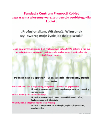 Fundacja Centrum Promocji Kobiet zaprasza na wiosenny warsztat rozwoju osobistego dla kobiet : „Profesjonalizm, Witalność, Wizerunek czyli tworzę moje życie jak dzieło sztuki” ...bo całe życie powinno być traktowane jako dzieło sztuki, a nie po prostu jak szereg zadań pośpiesznie wykonanych w drodze do kolejnego celu... Podczas sześciu spotkań - w 35 sesjach - dotkniemy trzech obszarów: PROFESJONALIZM / Naprawdę jaka jesteś ... Podróż do głębi siebie 12 sesji opracowanych przez psychologa, coacha i doradcę zawodowego WITALNOŚĆ / Duża dawka energii 11 sesji opracowanych przez trenerki fitness i tańca, fizykoterapeutę i dietetyka WIZERUNEK / Mój Styl obudzi się z wiosną 12 sesji z ekspertem mody i stylu, stylistą fryzjerskim, makijażystką Fot. Paul Noir Dla kogo: warsztat skierowany jest do wszystkich kobiet, dla których ważna jest jakość życia i które pragną umiejętnie nim kierować. Wiek, wykształcenie, status majątkowy czy zawodowy nie odgrywają tu żadnej roli. Proponowana wiosenna triada pomoże Wam w uwolnieniu niezwykłej synergii! Odnajdziecie równowagę między wnętrzem - życiem w zgodzie ze sobą, a witalnością wykorzystaniem własnego potencjału fizycznego. Uzupełnieniem będzie podkreślenie Waszej wyjątkowości poprzez udoskonalenie własnego image. Cel szkolenia: wydobędziecie swoje wewnętrzne -piękno i prawdę. Wspólnie wykreujemy Wasz korzystniejszy wizerunek, pomożemy Wam określić cele i priorytety oraz efektywnie zaplanować proces samorealizacji. Autorzy i prowadzący: doświadczeni specjaliści w zakresie prowadzenia szkoleń dla kobiet: psychologowie, coachowie i trenerzy oraz eksperci mody i stylu - ci, którzy odnieśli sukces w swoich dziedzinach, podzielą się swoim warsztatem i doświadczeniami, oraz zdradzą jakimi metodami możesz skutecznie realizować siebie, godząc codzienną pracę z życiem osobistym. Koszt szkolenia: Cena pełnego cyklu warsztatów to 750,00 PLN od osoby (możliwość opłaty w dwóch ratach).. Cena warsztatu obejmuje materiały seminaryjne, napoje oraz lunch. Uczestnicy otrzymają certyfikaty potwierdzające udział w szkoleniu! Fot. Paul Noir Miejsce: ul. Lwowska 17 lok 3, Warszawa Termin: Warsztat obejmuje sześć spotkań: 18.06.10, 19.06.10, 20.06.10, 25.06.10, 26.06.10, 27.06.10 Zapisy : telefonicznie nr: 22 629 92 57, 22 465 90 41 mail: [email protected] Wpłaty: na nr konta bankowego: 27 1440 1101 0000 0000 0400 8747 z potwierdzeniem przelewu na [email protected] lub osobiście w siedzibie fundacji serdecznie zapraszamy!