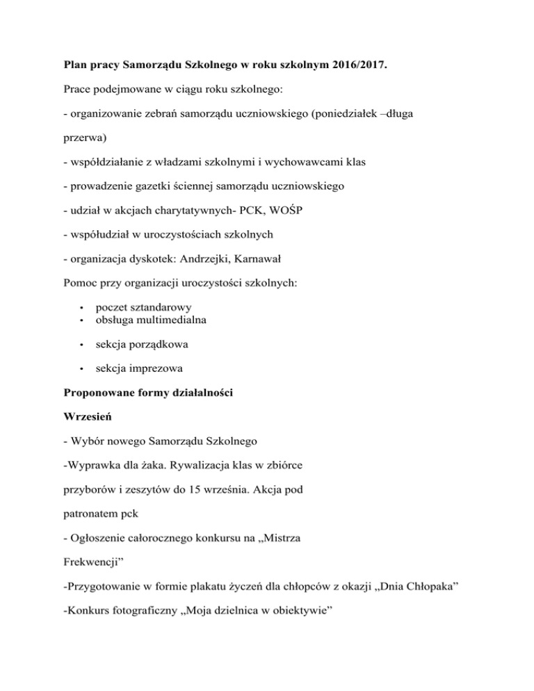 Plan pracy Samorządu Szkolnego w roku szkolnym 2016/2017. Prace podejmowane w ciągu roku szkolnego: - organizowanie zebrań samorządu uczniowskiego (poniedziałek –długa przerwa) - współdziałanie z władzami szkolnymi i wychowawcami klas - prowadzenie gazetki ściennej samorządu uczniowskiego - udział w akcjach charytatywnych- PCK, WOŚP - współudział w uroczystościach szkolnych - organizacja dyskotek: Andrzejki, Karnawał Pomoc przy organizacji uroczystości szkolnych: • poczet sztandarowy obsługa multimedialna • sekcja porządkowa • sekcja imprezowa • Proponowane formy działalności Wrzesień - Wybór nowego Samorządu Szkolnego -Wyprawka dla żaka. Rywalizacja klas w zbiórce przyborów i zeszytów do 15 września. Akcja pod patronatem pck - Ogłoszenie całorocznego konkursu na „Mistrza Frekwencji” -Przygotowanie w formie plakatu życzeń dla chłopców z okazji „Dnia Chłopaka” -Konkurs fotograficzny „Moja dzielnica w obiektywie” Październik -Życzenia dla nauczycieli i pracowników administracji gimnazjum -Ślubowanie klas pierwszych 14 października -Szkolny Dzień Uśmiechu -Dzień spódnicy Listopad - Wyjście na Cmentarz Rakowicki z okazji Dnia Wszystkich Świętych -Dzień życzliwości – wybór najbardziej życzliwego ucznia - Gazetka okolicznościowa z okazji 11 Listopada - Udział w biegu niepodległości - Współudział w organizacji Akademii z okazji Święta Niepodległości Grudzień -Przeprowadzenie konkursu na świąteczny wystrój klas „Anielskie klasy” -Udział w akcji Świąteczna Paczka -Ubieranie choinki szkolnej Styczeń -Zorganizowanie zbiórki książek i Kiermasz Książki Przeczytanej - Udział w WOŚP- sprzedaż ciast podczas zebrań semestralnych - Dyskoteka karnawałowa -Konkurs piosenki świątecznej Luty -Konkurs na najpiękniejsze serce walentynkowe - Akcja charytatywna PCK - Przygotowanie skrzynki na kartki walentynkowe, doręczanie korespondencji walentynkowej przez szkolnych listonoszy Marzec - Gazetka okolicznościowa z okazji Dnia Kobiet - Udział w obchodach Dnia Patrona Szkoły - Udział w Dniu Otwartym Szkoły - Konkurs na najładniejszą kartkę wielkanocną Kwiecień -zawody ratowników pck - Akcja charytatywna PCK -kolorowy Dzień – klasa, która będzie najbardziej kolorowo ubrana wygra jeden dzień bez pytania Maj - Gazetka okolicznościowa z okazji Święta Konstytucji 3 Maja - Konkurs fotograficzny „Kiedy wiosna buchnie majem” Czerwiec - Zbiórka makulatury - Wycieczka z okazji Dnia Dziecka - Uroczystość Zakończenia Roku Szkolnego, Pożegnanie klas III