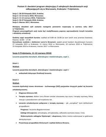 Poziom II: dwuletni program obejmujący 5 odrębnych dwudniowych sesji odbywających się w Warszawie, Krakowie i Trójmieście. Sesja 1: 28-29 listopada 2015, Kraków; Sesja 2: 12-13 marca 2016, Warszawa; Sesja 3: 11-12 czerwca 2016, Trójmiasto; Sesja 4: 26-27 listopada 2016, Kraków; Sesja 5: Marzec 2017, Warszawa. Niniejszy dwuletni cykl zostanie następnie ponownie rozpoczęty w czerwcu roku 2017 w Trójmieście. Program poszczególnych sesji może być modyfikowany poprzez wprowadzenie innych tematów z dziedziny ortodoncji. Godziny zajęć wszystkich kursów: wykład od 9:00 do 16:00 (w tym lunch oraz przerwa kawowa). Pytania: 16:00 – 17:30 Konsultacje osobiste z doktorem Larry’m Brownem: piątek przed każdym dwudniowym kursem: 27 listopada 2015 w Krakowie; 11 marca 2016 w Warszawie; 10 czerwca 2016 w Trójmieście; 25 listopada 2016 w Krakowie; marzec 2017 w Warszawie. Sesja 3 (Trójmiasto, 11-12 czerwca 2016) Leczenie pacjentów dorosłych, ekstrakcyjne i nieekstrakcyjne, część 1. Dzień 1 Wykład: Leczenie pacjentów dorosłych, ekstrakcyjne i nieekstrakcyjne: część I: wskazówki dotyczące finalizacji leczenia. Dzień 2 Wykład: Leczenie dysfunkcji stawu skroniowo - żuchwowego (SSŻ) pacjentów chcących podać się leczeniu ortodontycznemu. Diagnoza kliniczna SSŻ. Terapia szynowa: doktor Larry Brown omówi stosowany typ szyny i terapię szynową, którą stosuje z powodzeniem od trzydziestu lat. Leczenie ortodontyczne połączone z terapią szynową – jak „zarządzać" tymi delikatnymi przypadkami. Prognoza i leczenie długoterminowe Zabiegi chirurgiczne: artroskopia, artroplastyka, całkowita wymiana stawu i inne. Wykorzystanie zabiegów fizjoterapii i akupresury, które można wykonywać w gabinecie dentystycznym. Prezentacja przypadków klinicznych i wykład doktora Browna. Informacje organizacyjne: Kurs prowadzony w języku angielskim, z tłumaczeniem konsekutywnym na język polski. Cena za pojedynczą, dwudniową sesję: 1450 zł. Rabaty od ceny podstawowej - przy wpłacie na min. miesiąc przed kursem (III sesja - do 11.05.2015 r.) – rabat w wysokości 100 zł; W cenę wliczone są: posiłki (przerwy kawowe i obiady), typodont i wszystkie materiały niezbędne do ćwiczeń warsztatowych. Informacje i zapisy: Zapisy oraz informacje w języku polskim lub angielskim: Rajmund Chmielewski: [email protected], tel. 34 36 63 595; tel. kom. 602 717 358. Wykładowca: Doktor Larry Brown: [email protected] Ostateczny termin wpłaty za sesję III: 27 maja 2016. Numery kont: 77 1030 0019 0109 8530 0037 7522 (CitiHandlowy) 88 1140 2004 0000 3102 4611 2077 (mBank) Właściciel: Ling Plus; Częstochowa, ul. Lechonia 5/39 UWAGA: w tytule przelewu prosimy koniecznie podawać nazwisko uczestnika i datę kursu, którego wpłata dotyczy.