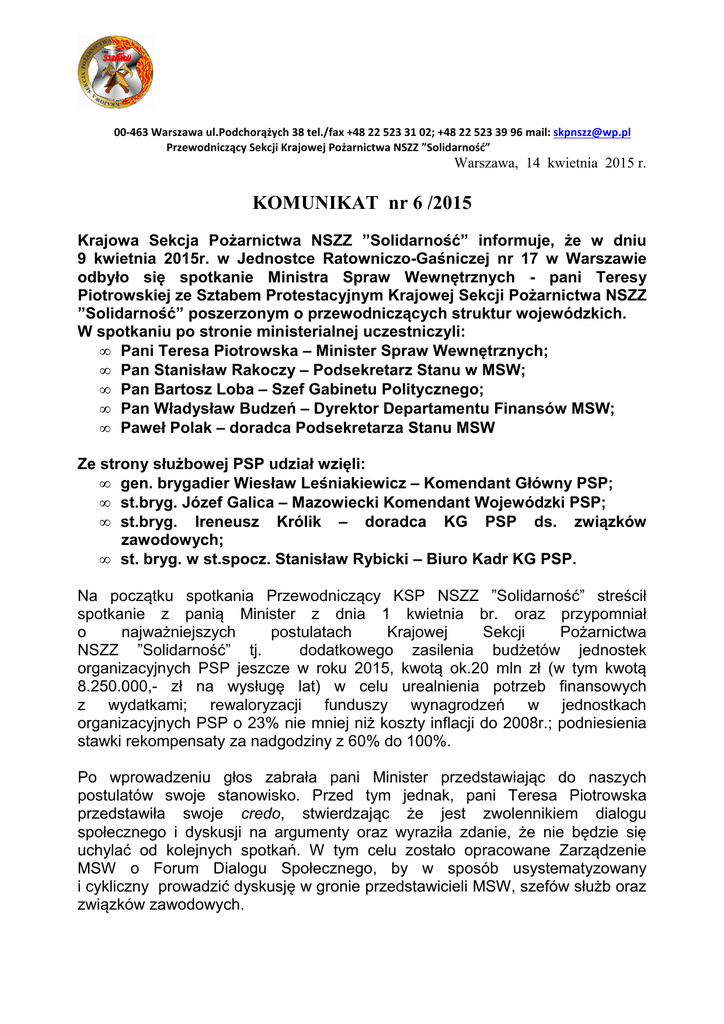00-463 Warszawa ul.Podchorążych 38 tel./fax +48 22 523 31 02; +48 22 523 39 96 mail: [email protected] Przewodniczący Sekcji Krajowej Pożarnictwa NSZZ ”Solidarność” Warszawa, 14 kwietnia 2015 r. KOMUNIKAT nr 6 /2015 Krajowa Sekcja Pożarnictwa NSZZ ”Solidarność” informuje, że w dniu 9 kwietnia 2015r. w Jednostce Ratowniczo-Gaśniczej nr 17 w Warszawie odbyło się spotkanie Ministra Spraw Wewnętrznych - pani Teresy Piotrowskiej ze Sztabem Protestacyjnym Krajowej Sekcji Pożarnictwa NSZZ ”Solidarność” poszerzonym o przewodniczących struktur wojewódzkich. W spotkaniu po stronie ministerialnej uczestniczyli: • Pani Teresa Piotrowska – Minister Spraw Wewnętrznych; • Pan Stanisław Rakoczy – Podsekretarz Stanu w MSW; • Pan Bartosz Loba – Szef Gabinetu Politycznego; • Pan Władysław Budzeń – Dyrektor Departamentu Finansów MSW; • Paweł Polak – doradca Podsekretarza Stanu MSW Ze strony służbowej PSP udział wzięli: • gen. brygadier Wiesław Leśniakiewicz – Komendant Główny PSP; • st.bryg. Józef Galica – Mazowiecki Komendant Wojewódzki PSP; • st.bryg. Ireneusz Królik – doradca KG PSP ds. związków zawodowych; • st. bryg. w st.spocz. Stanisław Rybicki – Biuro Kadr KG PSP. Na początku spotkania Przewodniczący KSP NSZZ ”Solidarność” streścił spotkanie z panią Minister z dnia 1 kwietnia br. oraz przypomniał o najważniejszych postulatach Krajowej Sekcji Pożarnictwa NSZZ ”Solidarność” tj. dodatkowego zasilenia budżetów jednostek organizacyjnych PSP jeszcze w roku 2015, kwotą ok.20 mln zł (w tym kwotą 8.250.000,- zł na wysługę lat) w celu urealnienia potrzeb finansowych z wydatkami; rewaloryzacji funduszy wynagrodzeń w jednostkach organizacyjnych PSP o 23% nie mniej niż koszty inflacji do 2008r.; podniesienia stawki rekompensaty za nadgodziny z 60% do 100%. Po wprowadzeniu głos zabrała pani Minister przedstawiając do naszych postulatów swoje stanowisko. Przed tym jednak, pani Teresa Piotrowska przedstawiła swoje credo, stwierdzając że jest zwolennikiem dialogu społecznego i dyskusji na argumenty oraz wyraziła zdanie, że nie będzie się uchylać od kolejnych spotkań. W tym celu zostało opracowane Zarządzenie MSW o Forum Dialogu Społecznego, by w sposób usystematyzowany i cykliczny prowadzić dyskusję w gronie przedstawicieli MSW, szefów służb oraz związków zawodowych. Forum będzie miało podobne podstawy do funkcjonowania jak Komisja Dialogu Społecznego (do tej pory Komisja Trójstronna ds. Społeczno-Gospodarczych). Po tym wstępie pani Minister odniosła się do postulatów NSZZ”Solidarność”: • w kwestii wzrostu funduszy wynagrodzeń w jednostkach organizacyjnych PSP, pani Minister poinformowała, że z całą pewnością nie możemy mówić o roku 2015. Natomiast trwają intensywne prace nad koncepcją wieloletniego programu podnoszenia (waloryzacji) wynagrodzeń we wszystkich służbach MSW oraz dla pracowników cywilnych pracujących w MSW i służbach podległych MSW. Cała koncepcja ma być opracowana w najbliższym czasie oraz skonsultowana z Ministerstwem Finansów i wmontowana w nową ustawę modernizacyjną. Szefowa MSW jasno określiła, że wzrosty wynagrodzeń planowane na poszczególne lata nie będą równe ale cykliczne. W tej części, uwagi ze strony Sztabu Protestacyjnego dotyczyły oczekiwania, że wraz ze wzrostem wynagrodzeń zostaną zabezpieczone środki na pochodne wynikające z podwyżek. Brak środków na pochodne doprowadzić może do dalszej niewydolności finansowej komend; • w kwestii rekompensaty za nadgodziny Pani Minister przypomniała, że kwestia ta była przedmiotem rozmowy w dniu 1 kwietnia br. Szefowa MSW uznała jednak, że priorytetem prac resortu powinny być jednak podwyżki dla funkcjonariuszy i pracowników cywilnych; • w kwestii dodatkowego zasilenia funduszy komend powiatowych/miejskich PSP pani Minister stwierdziła, że Ministerstwo Spraw Wewnętrznych wesprze PSP środkami w wysokości 3.260.000,- na pokrycie kosztów wzrostu wysługi lat. W tej części spotkania Komendant Główny PSP przedstawił informację jaką uzyskał z województw. Wynikało z niej, że komendanci powiatowi/miejscy uzyskają we własnym zakresie środki w wysokości ok. 4,1 mln zł w ramach zamrożenia vacatów. Ponadto Komendant Główny PSP poinformował, że w roku 2014 komendy powiatowe/miejskie po raz pierwszy od kilku lat nie weszły w zadłużenia wymagalne. Jednocześnie Komendant Główny PSP przyznał, że ze środków przeznaczonych na fundusz wynagrodzeń przesunięto ok. 28 mln złotych na inne wydatki w tym ok. 12 mln na nagrody i zapomogi ( w tym ok.4 mln złotych na nagrody za zastępstwo na L4); ok. 9 mln zł na inne należności wobec strażaków (świadczenia, odprawy, świadczenie roczne oraz 1,8 mln na nadgodziny). Ok. 7,3 mln zł na inne koszty utrzymania jednostek organizacyjnych. Komendant Główny PSP przypomniał, że dodatkowo w 2014r. Parlament RP zasilił PSP dodatkową kwotą ok. 10mln zł dedykowaną tylko do komend powiatowych i miejskich, a Rząd z rezerwy na działania nadzwyczajne przekazał ok.2,6 mln na pokrycie kosztów działań PSP podczas powodzi i innych anomalii pogodowych. Podsekretarz Stanu pan Stanisław Rakoczy stwierdził, że w odróżnieniu od innych służb struktura finansowa PSP jest rozdrobniona, co ma złe i dobre strony, ale m.in. pozwala zaangażować wojewodów w problemy PSP. Przy okazji pan Stanisław Rakoczy poinformował, że również nie uchyla się od rozmów i spotkań, dzięki czemu niektóre wcześniejsze sprawy udało się rozwiązać lub są w trakcie rozwiązywania. W trakcie dyskusji, która często miała burzliwy przebieg, przedstawiciele Sztabu Protestacyjnego wskazali Pani Minister, że sytuacja nie wygląda tak zadawalająco jak rysują ją szefowie służby. Wskazano na przykładzie województwa wielkopolskiego, że w przedziale lat 2009 – 2014, przeniesienia