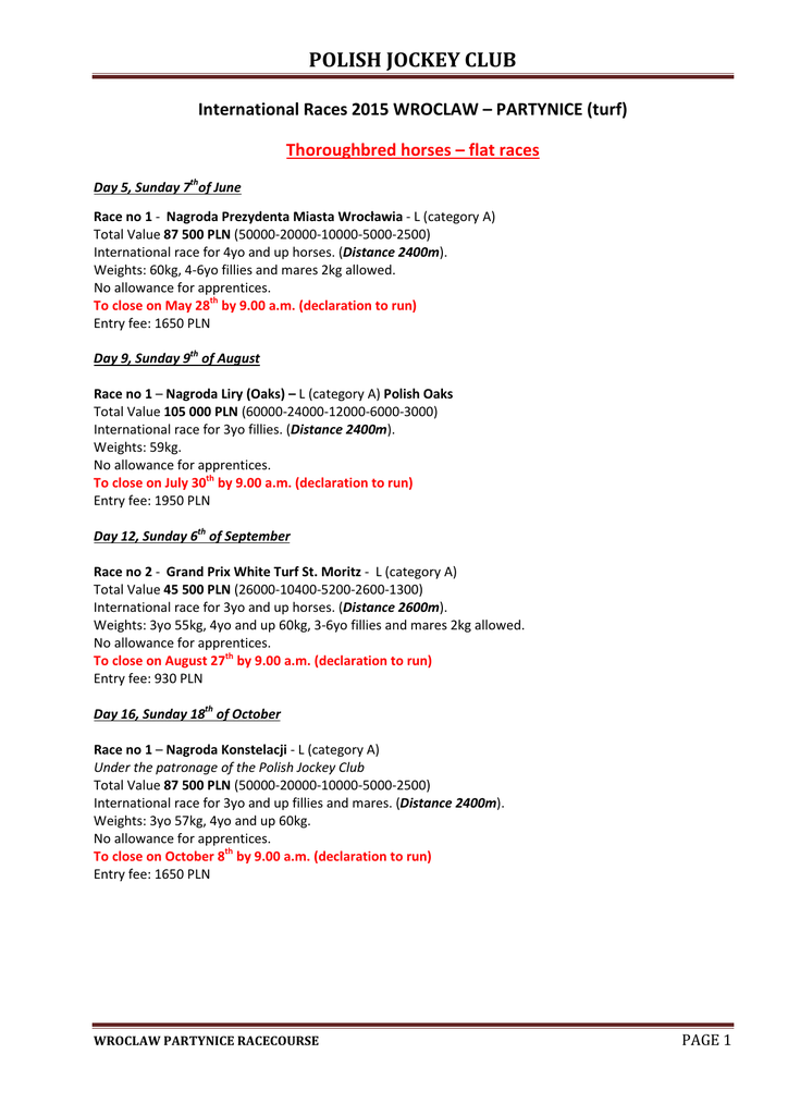 POLISH JOCKEY CLUB International Races 2015 WROCLAW – PARTYNICE (turf) Thoroughbred horses – flat races Day 5, Sunday 7thof June Race no 1 - Nagroda Prezydenta Miasta Wrocławia - L (category A) Total Value 87 500 PLN (50000-20000-10000-5000-2500) International race for 4yo and up horses. (Distance 2400m). Weights: 60kg, 4-6yo fillies and mares 2kg allowed. No allowance for apprentices. To close on May 28th by 9.00 a.m. (declaration to run) Entry fee: 1650 PLN Day 9, Sunday 9th of August Race no 1 – Nagroda Liry (Oaks) – L (category A) Polish Oaks Total Value 105 000 PLN (60000-24000-12000-6000-3000) International race for 3yo fillies. (Distance 2400m). Weights: 59kg. No allowance for apprentices. To close on July 30th by 9.00 a.m. (declaration to run) Entry fee: 1950 PLN Day 12, Sunday 6th of September Race no 2 - Grand Prix White Turf St. Moritz - L (category A) Total Value 45 500 PLN (26000-10400-5200-2600-1300) International race for 3yo and up horses. (Distance 2600m). Weights: 3yo 55kg, 4yo and up 60kg, 3-6yo fillies and mares 2kg allowed. No allowance for apprentices. To close on August 27th by 9.00 a.m. (declaration to run) Entry fee: 930 PLN Day 16, Sunday 18th of October Race no 1 – Nagroda Konstelacji - L (category A) Under the patronage of the Polish Jockey Club Total Value 87 500 PLN (50000-20000-10000-5000-2500) International race for 3yo and up fillies and mares. (Distance 2400m). Weights: 3yo 57kg, 4yo and up 60kg. No allowance for apprentices. To close on October 8th by 9.00 a.m. (declaration to run) Entry fee: 1650 PLN WROCLAW PARTYNICE RACECOURSE PAGE 1 POLISH JOCKEY CLUB General information: Partynice Racecourse in Wroclaw (www.torpartynice.pl) was established in 1907. Basic data: turf, right handed; distance 2150m, width 20m, the straight 500m. In 2015 - 17 meetings (racing days) since 26th of April till 25th of October (on Sundays mostly) with flat races for Thoroughbreds and pure bred Arabians, hurdle and steeplechase races for Thoroughbreds as well as races for trotters. No more than 15 runners will be admitted in flat and hurdle race and no more than 20 runners will be admitted in steeplechase. Entries should be sent to Organizers by e-mail ([email protected]) or by fax 00 48 71 333 45 18 and confirmed by phone 00 48 71 333 45 15. Bank: PKO BP SA Account Number: PL64 1020 5226 0000 6202 0449 1189 BIC: BPKOPLPW Racing Clearance Notification (RCN), racing record of the horse as well as jockey’s clearing must be send to Polish Jockey Club (phone/fax 0048 22 843 10 34). RCN must be sent with declaration to run. Racing record must be send with entries and with declaration to run. Jockey’s clearing must be sent no later than on Friday before the race. WROCLAW PARTYNICE RACECOURSE PAGE 2