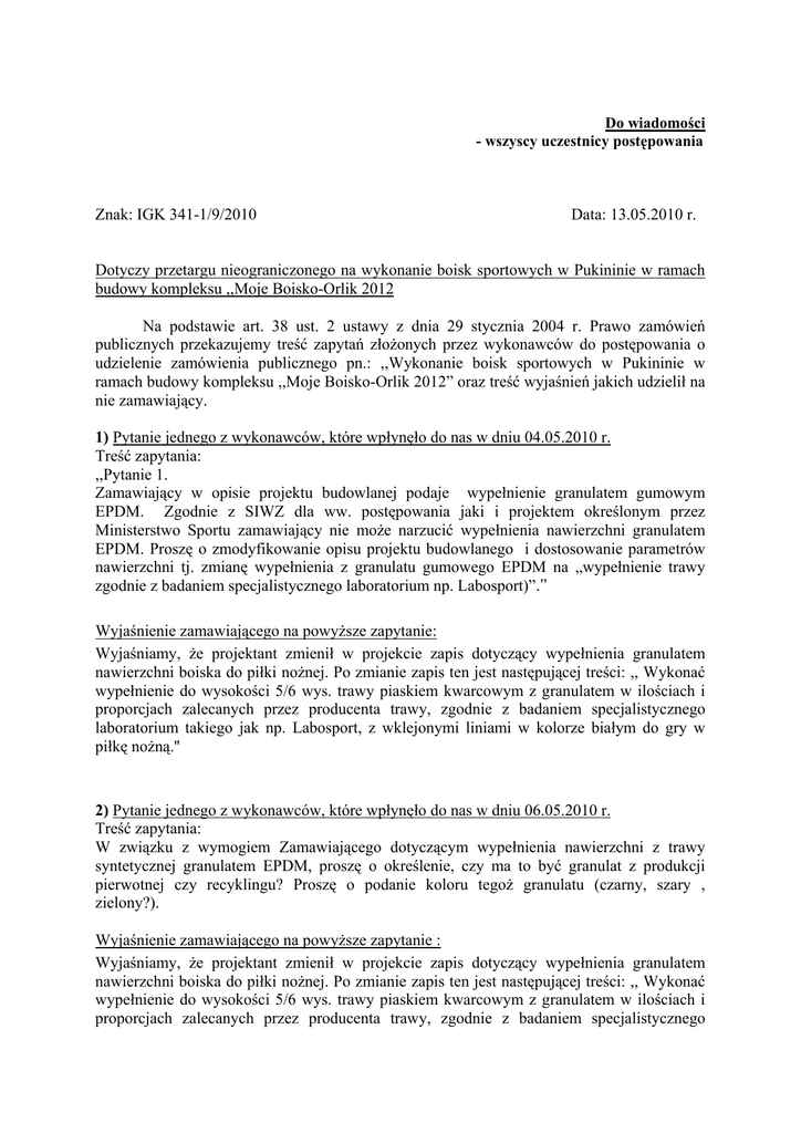 Do wiadomości - wszyscy uczestnicy postępowania Znak: IGK 341-1/9/2010 Data: 13.05.2010 r. Dotyczy przetargu nieograniczonego na wykonanie boisk sportowych w Pukininie w ramach budowy kompleksu ,,Moje Boisko-Orlik 2012 Na podstawie art. 38 ust. 2 ustawy z dnia 29 stycznia 2004 r. Prawo zamówień publicznych przekazujemy treść zapytań złożonych przez wykonawców do postępowania o udzielenie zamówienia publicznego pn.: ,,Wykonanie boisk sportowych w Pukininie w ramach budowy kompleksu ,,Moje Boisko-Orlik 2012” oraz treść wyjaśnień jakich udzielił na nie zamawiający. 1) Pytanie jednego z wykonawców, które wpłynęło do nas w dniu 04.05.2010 r. Treść zapytania: ,,Pytanie 1. Zamawiający w opisie projektu budowlanej podaje wypełnienie granulatem gumowym EPDM. Zgodnie z SIWZ dla ww. postępowania jaki i projektem określonym przez Ministerstwo Sportu zamawiający nie może narzucić wypełnienia nawierzchni granulatem EPDM. Proszę o zmodyfikowanie opisu projektu budowlanego i dostosowanie parametrów nawierzchni tj. zmianę wypełnienia z granulatu gumowego EPDM na „wypełnienie trawy zgodnie z badaniem specjalistycznego laboratorium np. Labosport)”.’’ Wyjaśnienie zamawiającego na powyższe zapytanie: Wyjaśniamy, że projektant zmienił w projekcie zapis dotyczący wypełnienia granulatem nawierzchni boiska do piłki nożnej. Po zmianie zapis ten jest następującej treści: ,, Wykonać wypełnienie do wysokości 5/6 wys. trawy piaskiem kwarcowym z granulatem w ilościach i proporcjach zalecanych przez producenta trawy, zgodnie z badaniem specjalistycznego laboratorium takiego jak np. Labosport, z wklejonymi liniami w kolorze białym do gry w piłkę nożną.'' 2) Pytanie jednego z wykonawców, które wpłynęło do nas w dniu 06.05.2010 r. Treść zapytania: W związku z wymogiem Zamawiającego dotyczącym wypełnienia nawierzchni z trawy syntetycznej granulatem EPDM, proszę o określenie, czy ma to być granulat z produkcji pierwotnej czy recyklingu? Proszę o podanie koloru tegoż granulatu (czarny, szary , zielony?). Wyjaśnienie zamawiającego na powyższe zapytanie : Wyjaśniamy, że projektant zmienił w projekcie zapis dotyczący wypełnienia granulatem nawierzchni boiska do piłki nożnej. Po zmianie zapis ten jest następującej treści: ,, Wykonać wypełnienie do wysokości 5/6 wys. trawy piaskiem kwarcowym z granulatem w ilościach i proporcjach zalecanych przez producenta trawy, zgodnie z badaniem specjalistycznego laboratorium takiego jak np. Labosport, z wklejonymi liniami w kolorze białym do gry w piłkę nożną.'' W związku z powyższym zamawiający nie ma innych wymagań odnośnie granulatu poza określonymi w przytoczonym powyżej zapisie. 3) Pytanie jednego z wykonawców, które wpłynęło do nas w dniu 10.05.2010 r. Treść zapytania: ,,W związku z ogłoszonym przez Państwa przetargiem nieograniczonym pn. jw. (,,Wykonanie boisk sportowych w Pukininie w ramach budowy kompleksu Moje BoiskoOrlik 2012’’- przyp. red.), prosimy o wyjaśnienie, czy ogrodzenie terenu szkoły o wysokości 1,70m ma być wykonana z paneli czy siatki stalowej powlekanej? Jeżeli z paneli- to czy mają one być ocynkowane i malowane proszkowo na kolor zielony?’’ Wyjaśnienie zamawiającego na powyższe zapytanie : Ogrodzenie terenu szkoły o wysokości 1,70m ma być wykonane z paneli ogrodzeniowych ocynkowanych i malowanych proszkowo na kolor zielony. Rozstaw słupków 2,50m. Słupek mocowany w stopie nośnej. Płyty cokołowe tylko na odcinku 8,20m ze względu na odejście ogrodzenia od krawężnika drogi pieszo jezdnej. W pozostałej części ogrodzenia funkcję cokołu pełnić mają krawężniki. Brama 2-skrzydłowa rozwierna z profili stalowych 20mmx20mm (układ pionowy)o wymiarach 290x170 cm, malowana farbą antykorozyjną a następnie nawierzchniową. Furtka z profili stalowych 20mmx20mm (układ pionowy) o wymiarach 146x170 cm, z zamkiem, malowana identycznie jak brama.