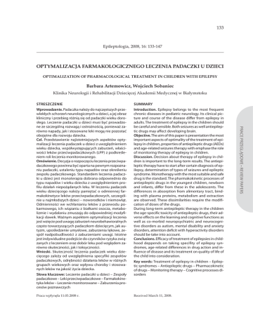 133 Epileptologia, 2008, 16: 133-147 OPTYMALIZACJA FARMAKOLOGICZNEGO LECZENIA PADACZKI U DZIECI OPTIMALIZATION OF PHARMACOLOGICAL TREATMENT IN CHILDREN WITH EPILEPSY Barbara Artemowicz, Wojciech Sobaniec Klinika Neurologii i Rehabilitacji Dziecięcej Akademii Medycznej w Białymstoku SUMMARY Introduction. Epilepsy belongs to the most frequent chronic diseases in pediatric neurology. Its clinical picture and course of the disease differ from epilepsy in adults. The treatment of epilepsy in the children should be careful and sensible. Both seizures as well antiepileptic drugs may affect developing brain. Objective. The aim of this paper is presentation the most important aspects of optimality of the treatment of epilepsy in children, properties of antiepileptic drugs (AEDs) and age-related seizures therapy with emphase the role of monitoring therapy of epilepsy in children. Discussion. Decision about therapy of epilepsy in children is important to the long-term results. The antiepileptic therapy have to start after certain diagnosis of epilepsy, determination of types of seizures and epileptic syndrome. Monotherapy with the most suitable and safe drug is the standard. The pharmakokinetic processes of antiepileptic drugs in the youngest children, newborn and infants, differ from these in the adolescents. The differences in absorption from alimentary tract, binding with plasma proteins, metabolism and extraction are observed. These dissimilarities require the modification of doses of the drugs. During long-term antiepileptic therapy in the children the age-specific toxicity of antiepileptic drugs, their adverse effects on the learning and cognitive functions as well as co-morbid neuropsychiatric and neurocognitive disorders as autism, mental disability and anxiety disorders, attention deficit with hyperactivity disorders should be take into account. Conclusions. Efficacy of treatment of epilepsies in childhood deppends on taking specifity of epilepsy syndromes, age-related differences in drug action and influence of disease and its treatment on quality of life of the child into consideration. Key words: Treatment of epilepsy in children – Epileptic syndromes – Antiepileptic drugs – Pharmacokinetic of drugs – Monitoring therapy – Cognitive processes disorders Praca wpłynęła 11.03.2008 r. Received March 11, 2008. PRACE PRZEGLĄDOWE • REVIEW PAPERS STRESZCZENIE Wprowadzenie. Padaczka należy do najczęstszych przewlekłych schorzeń neurologicznych u dzieci, a jej obraz kliniczny i przebieg różnią się od padaczki wieku dorosłego. Leczenie padaczki u dzieci musi być prowadzone ze szczególną rozwagą i ostrożnością, ponieważ zarówno napady, jak i stosowane leki mogą nie pozostać obojętne dla rozwoju dziecka. Cel. Przedstawienie najistotniejszych aspektów optymalizacji leczenia padaczek u dzieci z uwzględnieniem wieku dziecka, współwystępujących zaburzeń, właściwości leków przeciwpadaczkowych (LPP) z podkreśleniem roli leczenia monitorowanego. Omówienie. Decyzja o rozpoczęciu leczenia przeciwpadaczkowego powinna być oparta na pewnym rozpoznaniu padaczki, ustaleniu typu napadów oraz określeniu zespołu padaczkowego. Standardem leczenia padaczki u dzieci jest monoterapia dobrana odpowiednio do typu napadów i wieku dziecka z uwzględnieniem profilu działań niepożądanych leku. W leczeniu padaczek wieku dziecięcego należy pamiętać o odmiennej farmakokinetyce leków przeciwpadaczkowych, szczególnie u najmłodszych dzieci – noworodków i niemowląt. Odmienności we wchłanianiu leków z przewodu pokarmowego, ich wiązaniu z białkami osocza, metabolizmie i wydalaniu zmuszają do odpowiedniej modyfikacji dawek. Ważnym aspektem optymalizacji leczenia jest wzięcie pod uwagę zaburzeń neurobehawioralnych często towarzyszących padaczkom dziecięcym, jak autyzm, upośledzenie umysłowe, zaburzenia lękowe, zespół nadpobudliwości z zaburzeniami uwagi. Istotne jest indywidualne podejście do czynników ryzyka związanych z leczeniem oraz dobór leku pod względem zarówno skuteczności, jak i toksyczności. Wnioski. Skuteczność leczenia padaczek wieku dziecięcego zależy od uwzględnienia specyfiki zespołów padaczkowych, odrębności działania leków w różnych grupach wiekowych oraz wpływu choroby i stosowanych leków na jakość życia dziecka. Słowa kluczowe: Leczenie padaczki u dzieci – Zespoły padaczkowe – Leki przeciwpadaczkowe – Farmakokinetyka leków – Leczenie monitorowane – Zaburzenia procesów poznawczych