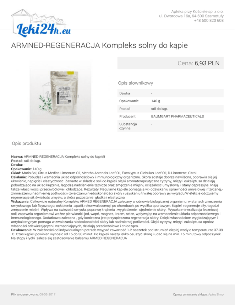 Apteka przy Kościele sp. z o.o. ul. Dworcowa 16a, 64-500 Szamotuły +48 600 823 608 ARMNED-REGENERACJA Kompleks solny do kąpie Cena: 6,93 PLN Opis słownikowy Dawka - Opakowanie 140 g Postać sól do kąp. Producent BAUMGART PHARMACEUTICALS Substancja czynna - Opis produktu Nazwa: ARMNED-REGENERACJA Kompleks solny do kąpieli Postać: sól do kąp. Dawka: Opakowanie: 140 g Skład: Maris Sal, Citrus Medica Limonum Oil, Mentha Arvensis Leaf Oil, Eucalyptus Globulus Leaf Oil, D-Limonene, Citral Działanie: Pobudza i wzmacnia układ odpornościowy i immunologiczny organizmu. Skóra zostaje dobrze nawilżona, poprawia się jej ukrwienie, napięcie i elastyczność. Zawarte w składzie soli do kąpieli olejki aromaterapeutyczne cytryny, mięty i eukaliptusa działają pobudzająco na układ krążenia, łagodzą nadciśnienie tętnicze oraz zmęczenie mięśni, ociężałość umysłową i stany depresyjne. Mają także właściwości przeciwbólowe i chłodzące. Rezultaty: Regularne kąpiele pomagają w:- odzyskaniu sprawności umysłowej i fizycznej,zmniejszeniu nadmiernej potliwości,- zwalczaniu niedoskonałości skóry i uzyskaniu trwałej poprawy jej wyglądu.W efekcie odczujemy regenerację sił, świeżość umysłu, a skóra pozostanie gładka i elastyczna Wskazania: Całkowicie naturalny Kompleks ARMED REGENERACJA zalecany w odnowie biologicznej organizmu, w stanach zmęczenia umysłowego lub fizycznego, osłabienia , apatii, rekonwalescencji po chorobach, po wysiłku sportowym. Kąpiel regeneruje siły, łagodzi zmęczenie mięśni Wpływa na świeżość umysłu, poprawę krążenia , wygładzenie i ujędrnienie skóry. Wysoka mineralizacja leczniczej soli, zapewnia organizmowi ważne pierwiastki: jod, wapń, magnez, krzem, selen, wpływając na wzmocnienie układu odpornościowego i immunologicznego. Dodatkowo zalecana , gdy konieczna jest przyspieszona regeneracja skóry. Dzięki własnościom wygładzającym i antybakteryjnym pomaga w zwalczaniu niedoskonałości skóry lub nadmiernej potliwości. Olejki cytryny, mięty i eukaliptusa oprócz własności odświeżających i wzmacniających, działają przeciwbólowo i chłodząco. Dawkowanie: W zależności od indywidualnych potrzeb wsypać zawartość 1-2 saszetek pod strumień ciepłej wody o temperaturze 37-39 ៓C. Czas kąpieli powinien wynosić od 15 do 30 minut. Po kąpieli należy lekko osuszyć skórę i udać się na min. 15 minutowy odpoczynek. Na stopy i łydki zaleca się zastosowanie balsamu ARMED REGENERACJA Plik wygenerowano: 09-03-2017 Powered by TCPDF (www.tcpdf.org) Oprogramowanie sklepu: AptusShop