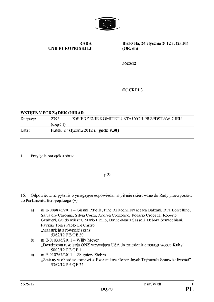 RADA UNII EUROPEJSKIEJ Bruksela, 24 stycznia 2012 r. (25.01) (OR. en) 5625/12 OJ CRP1 3 WSTĘPNY PORZĄDEK OBRAD Dotyczy: 2393. POSIEDZENIE KOMITETU STAŁYCH PRZEDSTAWICIELI (część I) Data: Piątek, 27 stycznia 2012 r. (godz. 9.30) 1. Przyjęcie porządku obrad I (1) 16. Odpowiedzi na pytania wymagające odpowiedzi na piśmie skierowane do Rady przez posłów do Parlamentu Europejskiego (+) a) b) c) 5625/12 nr E-009876/2011 – Gianni Pittella, Pino Arlacchi, Francesca Balzani, Rita Borsellino, Salvatore Caronna, Silvia Costa, Andrea Cozzolino, Rosario Crocetta, Roberto Gualtieri, Guido Milana, Mario Pirillo, David-Maria Sassoli, Debora Serracchiani, Patrizia Toia i Paolo De Castro „Maastricht a równość szans” 5362/12 PE-QE 20 nr E-010336/2011 – Willy Meyer „Dwudziesta rezolucja ONZ wzywająca USA do zniesienia embarga wobec Kuby” 5003/12 PE-QE 1 nr E-010767/2011 – Zbigniew Ziobro „Zmiany w obsadzie stanowisk Rzeczników Generalnych Trybunału Sprawiedliwości” 5367/12 PE-QE 22 DQPG kas/JW/dt 1 PL d) nr E-010904/2011 – Nuno Teixeira „Nowe zasady korekty niezbilansowania finansowego i makroekonomicznego w państwach członkowskich” 5007/12 PE-QE 3 e) nr E-011196/2011 – Sandrine Bélier „Przyjęcie dyrektywy ramowej w sprawie gleby – wkład w realizację celu ochrony naturalnych siedlisk” 5015/12 PE-QE 6 f) nr E-011556/2011 – Hans-Peter Martin „Eksport broni do Bahrajnu” 5013/12 PE-QE 4 g) nr E-011665/2011 – Nikolaos Salavrakos „Zafałszowana mapa Republiki Cypryjskiej” 5005/12 PE-QE 2 h) nr E-011671/2011 – Mara Bizzotto „Plany rządu Niemiec dotyczące przywrócenia marki jako waluty i druku nowych banknotów” 5364/12 PE-QE 21 i) nr E-011981/2011 – Pat the Cope Gallagher, Brian Crowley i Liam Aylward „Stosunki dyplomatyczne między państwami członkowskimi UE a Stolicą Apostolską” 5214/12 PE-QE 12 17. Sprawa wniesiona do Trybunału Sprawiedliwości Wniosek o wydanie orzeczenia w trybie prejudycjalnym w sprawie C-545/11, Agrargenossenschaft Neuzelle e.G. v Landrat des Landkreises Oder-Spree (sąd odsyłający: Verwaltungsgericht Frankfurt (Oder) (Niemcy)) ważność art. 7 ust. 1 i 2 rozporządzenia Rady (WE) nr 73/2009) – Nota informacyjna dla Komitetu Stałych Przedstawicieli (część I) 5464/12 JUR 18 AGRI 28 AGRIORG 16 AGRIFIN 10 18. Rozporządzenie wykonawcze Komisji (UE) nr …/.. z XXX w sprawie wykonania rozporządzenia Parlamentu Europejskiego i Rady (WE) nr 661/2009 w odniesieniu do wymagań w zakresie homologacji typu dla niektórych kategorii pojazdów silnikowych w odniesieniu do zaawansowanych systemów hamowania awaryjnego – Decyzja o braku sprzeciwu wobec przyjęcia 18406/11 ENT 280 MI 658 5341/12 ENT 4 MI 14 5625/12 DQPG kas/JW/dt 2 PL 19. Rozporządzenie wykonawcze Komisji (UE) nr …/.. z XXX w sprawie wykonania rozporządzenia Parlamentu Europejskiego i Rady (WE) nr 661/2009 w zakresie wymagań dotyczących homologacji typu w odniesieniu do montowania systemów ostrzegania przed niezamierzoną zmianą pasa ruchu w pojazdach silnikowych – Decyzja o braku sprzeciwu wobec przyjęcia 18606/11 ENT 289 MI 671 5340/12 ENT 3 MI 13 20. Rozporządzenie Komisji (UE) nr …/… z XXX zmieniające rozporządzenie (UE) nr …/… ustanawiające wymagania techniczne i procedury administracyjne odnoszące się do załóg w lotnictwie cywilnym zgodnie z rozporządzeniem Parlamentu Europejskiego i Rady (WE) nr 216/2008 – Decyzja o braku sprzeciwu wobec przyjęcia 18318/11 AVIATION 269 5092/12 AVIATION 2 21. Rozporządzenie Komisji (UE) nr …/… z XXX w sprawie sprostowania rumuńskiej wersji rozporządzenia (WE) nr 1881/2006 ustalającego najwyższe dopuszczalne poziomy niektórych zanieczyszczeń w środkach spożywczych – Decyzja o braku sprzeciwu wobec przyjęcia 18300/11 DENLEG 154 AGRI 853 5554/12 DENLEG 2 AGRI 31 22. Wniosek dotyczący decyzji Rady w sprawie podpisania Umowy między Unią Europejską a Republiką Turcji dotyczącej pewnych aspektów przewozów lotniczych – Przyjęcie 18231/11 AVIATION 264 RELEX 1300 NT 20 18268/11 AVIATION 265 RELEX 1309 NT 21 + COR 1 (hu) + COR 2 (fi) + COR 3 (cs) + COR 4 (ro) + COR 5 5035/12 AVIATION 1 RELEX 3 NT 1 5625/12 DQPG kas/JW/dt 3 PL II 23. Ustalenie wstępnego porządku obrad na posiedzenie Rady (ds. Transportu, Telekomunikacji i Energii) w dniu 14 lutego 2012 r.(1) 24. Ustalenie wstępnego porządku obrad na posiedzenie Rady (ds. Zatrudnienia, Polityki Społeczne j, Zdrowia i Ochrony Konsumentów) w dniu 17 lutego 2012 r.(1) 25. Ustalenie wstępnego porządku obrad na posiedzenie Rady ds. Konkurencyjności (Rynku We wnętrznego, Prze mysłu, Badań i Przestrzeni Kos miczne j), w dniach 20–21 lutego 2012 r.(1) 26. Przygotowania do posiedzenia Rady (ds. Edukacji, Młodzie ży, Kultury i Sportu) w dniu 10 lutego 2012 r. 1. Projekt wspólnego sprawozdania Rady i Komisji z 2012 r. w sprawie wdrażania strategicznych ram europejskiej współpracy w dziedzinie kształcenia i szkolenia („ET 2020”) – Kształcenie i szkolenie na rzecz inteligentnego i trwałego rozwoju Europy sprzyjającego włączeniu społecznemu (działanie o charakterze nieustawodawczym) – Przyjęcie 18577/11 EDUC 293 JEUN 79 SOC 1112 RECH 437 MI 669 COMPET 620 5443/12 EDUC 9 JEUN 4 SOC 20 RECH 10 MI 21 COMPET 17 2. Strategia „Europa 2020” (działanie o charakterze nieustawodawczym) – Debata orientacyjna (Debata jawna zgodnie z art. 8 ust. 2 regulaminu wewnętrznego Rady [na wniosek prezydencji]) 5444/12 EDUC 10 SOC 21 27. Wniosek dotyczący dyrektywy Parlamentu Europejskiego i Rady zmieniającej dyrektywy 89/666/EWG, 2005/56/WE i 2009/101/WE w zakresie integracji rejestrów centralnych, re jestrów handlowych i re jestrów spółek (pierws ze czytanie) (obrady ustawodawcze) – Informacje prezydencji o wyniku nieformalnych rozmów trójstronnych(1) – (ewent.) Analiza ostatecznego kompromisowego tekstu w celu przygotowania porozumienia – Sprawy różne ___________________ ______
