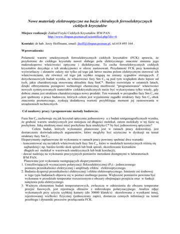 Nowe materiały elektrooptyczne na bazie chiralnych ferroelektrycznych ciekłych kryształów Miejsce realizacji: Zakład Fizyki Ciekłych Kryształów IFM PAN http://www.ifmpan.poznan.pl/scientificd.php?div=6 Kontakt: dr hab. Jerzy Hoffmann, email: [email protected], tel.618 695 164 . Wprowadzenie: Polarność warstw smektycznych ferroelektrycznych ciekłych kryształów (FCK) sprawia, że przyłożenie do ciekłego kryształu nawet słabego pola elektrycznego znacznie zmienia jego makroskopowe właściwości optyczne i dielektryczne. Ta cecha ferroelektrycznych ciekłych kryształów decyduje o ich atrakcyjności w sferze zastosowań. Przydatność FCK przy konstrukcji wyświetlaczy i ekranów zależy nie tylko od tego jak łatwo można polem elektrycznym sterować ich właściwościami, ale również od tego jak szybko reagują na zmiany sygnałów sterujących. Z dotychczasowych badań wynika, że właściwości fazy Sm Cα są pod tym względem dużo lepsze od tych, jakie charakteryzują stosowaną aktualnie fazę SmC*. Bardzo rozwinięta w ostatnich latach, dzięki olbrzymiemu postępowi technologii chemicznej możliwość "programowania" właściwości nowych syntetyzowanych materiałów ciekłokrystalicznych może być wykorzystana tylko wtedy, gdy dobrze znana jest struktura charakteryzująca nowy produkt. Ten warunek w przypadku fazy Sm Cα nie jest spełniony a prace badawcze, których celem jest wyjaśnienie zagadki struktury fazy Sm Cα obok znaczenia poznawczego, zyskują dodatkową wartość przybliżając moment jej zastosowania w urządzeniach technicznych. Cel naukowy pracy i proponowane metody badawcze. Faza Sm Cα zachowuje się jak kryształ optycznie jednoosiowy a z badań rentgenograficznych wynika, że grubość warstw smektycznych jest mniejsza od długości molekuł, zatem molekuły w tej fazie są pochylone. Jaką strukturę musi mieć pochylona faza smektyka C* by być jednoosiową optycznie? Celem badań, których wykonanie planowane jest w ramach pracy doktorskiej, jest dostarczenie doświadczalnych argumentów, które mogłyby być użyteczne w dyskusji na temat struktury fazy Sm Cα. Eksperymenty zaplanowane do wykonania w ramach pracy powinny spełniać dwa warunki: - koncentrować się na takich właściwościach fazy Sm Cα, które w modelach teoretycznych różnią się najbardziej ( np. bardzo krótki skok spirali lub brak spirali, skorelowanie kierunków długich osi molekuł w warstwach smektycznych lub brak korelacji), - dawać nadzieję na wykonanie precyzyjnych pomiarów metodami dostępnymi w laboratoriach IFM PAN. Planowane jest wykonanie następujących eksperymentów: 1. Umożliwiających wyznaczenie polaryzacji fleksoelektrycznej (PF) - jednoczesnego pomiaru przenikalności elektrycznej i amplitudy efektu elektrooptycznego. 2. Badania dyspersji przenikalności elektrycznej i efektu elektrooptycznego. Istnienie osi śrubowej w tego typu badaniach objawia się w postaci osobnego pasma. Większość pomiarów powinna być wykonana w przedziale temperatur rozszerzonym o obszary obejmujące przejścia oraz w funkcji natężenia pola elektrycznego. 3. Ważnym elementem badań temperaturowych, zwłaszcza w odniesieniu do obszaru temperatur przejść fazowych, jest rejestracja obrazów z mikroskopu polaryzacyjnego. Analiza zdjęć wykonanych przy użyciu szybkiej kamery (do 30000 klatek/s) skorelowana z wynikami innej, rejestrowanej wielkości fizycznej (jednoczesny zapis), dostarcza cennych informacji na temat przebiegu i dynamiki procesów przełączania FCK.