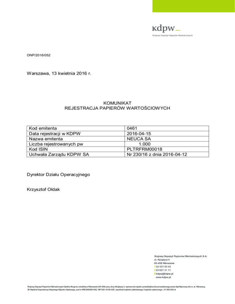 ONP/2016/052 Warszawa, 13 kwietnia 2016 r. KOMUNIKAT REJESTRACJA PAPIERÓW WARTOŚCIOWYCH Kod emitenta Data rejestracji w KDPW Nazwa emitenta Liczba rejestrowanych pw Kod ISIN Uchwała Zarządu KDPW SA 0461 2016-04-15 NEUCA SA 1.000 PLTRFRM00018 Nr 230/16 z dnia 2016-04-12 Dyrektor Działu Operacyjnego Krzysztof Ołdak Krajowy Depozyt Papierów Wartościowych S.A. ul. Książęca 4 00-498 Warszawa T 22 537 93 43 F 22 627 31 11 E [email protected] www.kdpw.pl Krajowy Depozyt Papierów Wartościowych Spółka Akcyjna z siedzibą w Warszawie (00-498) przy ulicy Książęcej 4, wpisana do rejestru przedsiębiorców prowadzonego przez Sąd Rejonowy dla m. st. Warszawy, XII Wydział Gospodarczy Krajowego Rejestru Sądowego, pod nr KRS 0000081582, NIP526-10-09-528, wysokość kapitału zakładowego i kapitału wpłaconego - 21.000.000 zł.