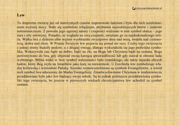 Lew To drapieżne zwierzę już od starożytnych czasów imponowało ludziom i było dla nich ucieleśnieniem wyższej mocy. Stało się symbolem religijnym, atrybutem najważniejszych bóstw i znakiem astronomicznym. Z powodu jego ognistej natury i czujności widziano w nim symbol słońca – jego żaru i siły stwórczej. Ponadto, ze względu na ową czujność, uważano go za najdoskonalszego stróża. Walka lwa z dzikiem albo wężem wyobrażała zwycięstwo dnia nad nocą, światła nad ciemnością, dobra nad złem. W Piśmie Świętym lew pojawia się ponad sto razy. Cechy tego zwierzęcia z jednej strony budziły podziw, a z drugiej trwogę, dlatego wykształciła się jego podwójna symbolika. Wskazywała ona bądź na dobro, bądź na zło, na Boga lub Chrystusa bądź na szatana. Boga porównywano do lwa, gdy objawiał swoją karzącą sprawiedliwość lub gdy stawał w obronie ludu wybranego. Biblia widzi w lwie symbol waleczności ludu izraelskiego, ale także najazdu obcych ludów, który Bóg zsyła na Izraelitów jako karę za niewierność. U Ezechiela lew symbolizuje władzę królewską i wzniosłość Pańską. Szeroko rozpowszechnione są symbole Ewangelistów, a wśród nich symbol lwa odnoszony do Marka Ewangelisty. Zmartwychwstanie Chrystusa w średniowieczu przedstawiane było jako lew budzący swoje młode. Są to jednak późniejsze przedstawienia symboliki tego zwierzęcia, bo jeszcze w pierwszych wiekach chrześcijaństwa lew uchodził za symbol szatana.