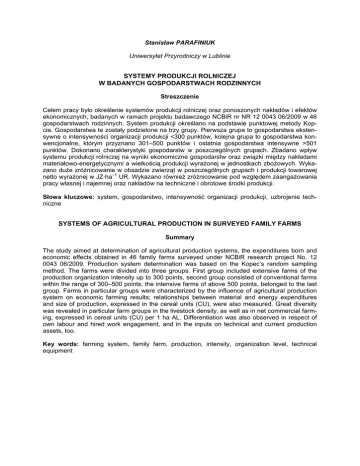 Stanisław PARAFINIUK Uniwersytet Przyrodniczy w Lublinie SYSTEMY PRODUKCJI ROLNICZEJ W BADANYCH GOSPODARSTWACH RODZINNYCH Streszczenie Celem pracy było określenie systemów produkcji rolniczej oraz ponoszonych nakładów i efektów ekonomicznych, badanych w ramach projektu badawczego NCBiR nr NR 12 0043 06/2009 w 46 gospodarstwach rodzinnych. System produkcji określano na podstawie punktowej metody Kopcia. Gospodarstwa te zostały podzielone na trzy grupy. Pierwsza grupa to gospodarstwa ekstensywne o intensywności organizacji produkcji <300 punktów, kolejna grupa to gospodarstwa konwencjonalne, którym przyznano 301–500 punktów i ostatnia gospodarstwa intensywne >501 punktów. Dokonano charakterystyki gospodarstw w poszczególnych grupach. Zbadano wpływ systemu produkcji rolniczej na wyniki ekonomiczne gospodarstw oraz związki między nakładami materiałowo-energetycznymi a wielkością produkcji wyrażonej w jednostkach zbożowych. Wykazano duże zróżnicowanie w obsadzie zwierząt w poszczególnych grupach i produkcji towarowej netto wyrażonej w JZ·ha–1 UR. Wykazano również zróżnicowanie pod względem zaangażowania pracy własnej i najemnej oraz nakładów na techniczne i obrotowe środki produkcji. Słowa kluczowe: system, gospodarstwo, intensywność organizacji produkcji, uzbrojenie techniczne SYSTEMS OF AGRICULTURAL PRODUCTION IN SURVEYED FAMILY FARMS Summary The study aimed at determination of agricultural production systems, the expenditures born and economic effects obtained in 46 family farms surveyed under NCBiR research project No. 12 0043 06/2009. Production system determination was based on the Kopec’s random sampling method. The farms were divided into three groups. First group included extensive farms of the production organization intensity up to 300 points, second group consisted of conventional farms within the range of 300–500 points; the intensive farms of above 500 points, belonged to the last group. Farms in particular groups were characterized by the influence of agricultural production system on economic farming results; relationships between material and energy expenditures and size of production, expressed in the cereal units (CU), were also measured. Great diversity was revealed in particular farm groups in the livestock density, as well as in net commercial farming, expressed in cereal units (CU) per 1 ha AL. Differentiation was also observed in respect of own labour and hired work engagement, and in the inputs on technical and current production assets, too. Key words: farming system, family farm, production, intensity, organization level, technical equipment