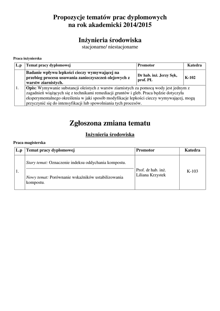 Propozycje tematów prac dyplomowych na rok akademicki 2014/2015 Inżynieria środowiska stacjonarne/ niestacjonarne Praca inżynierska L.p Temat pracy dyplomowej Promotor Katedra 1. Badanie wpływu lepkości cieczy wymywającej na Dr hab. inż. Jerzy Sęk, K-102 przebieg procesu usuwania zanieczyszczeń olejowych z prof. PŁ warstw ziarnistych. Opis: Wymywanie substancji oleistych z warstw ziarnistych za pomocą wody jest jednym z zagadnień wiążących się z technikami remediacji gruntów i gleb. Praca będzie dotyczyła eksperymentalnego określenia w jaki sposób modyfikacje lepkości cieczy wymywającej, mogą przyczynić się do intensyfikacji lub spowolniania tych procesów. Zgłoszona zmiana tematu Inżynieria środowiska Praca magisterska L.p Temat pracy dyplomowej Promotor Katedra Stary temat: Oznaczenie indeksu oddychania kompostu. 1. Nowy temat: Porównanie wskaźników ustabilizowania kompostu. Prof. dr hab. inż. Liliana Krzystek K-103