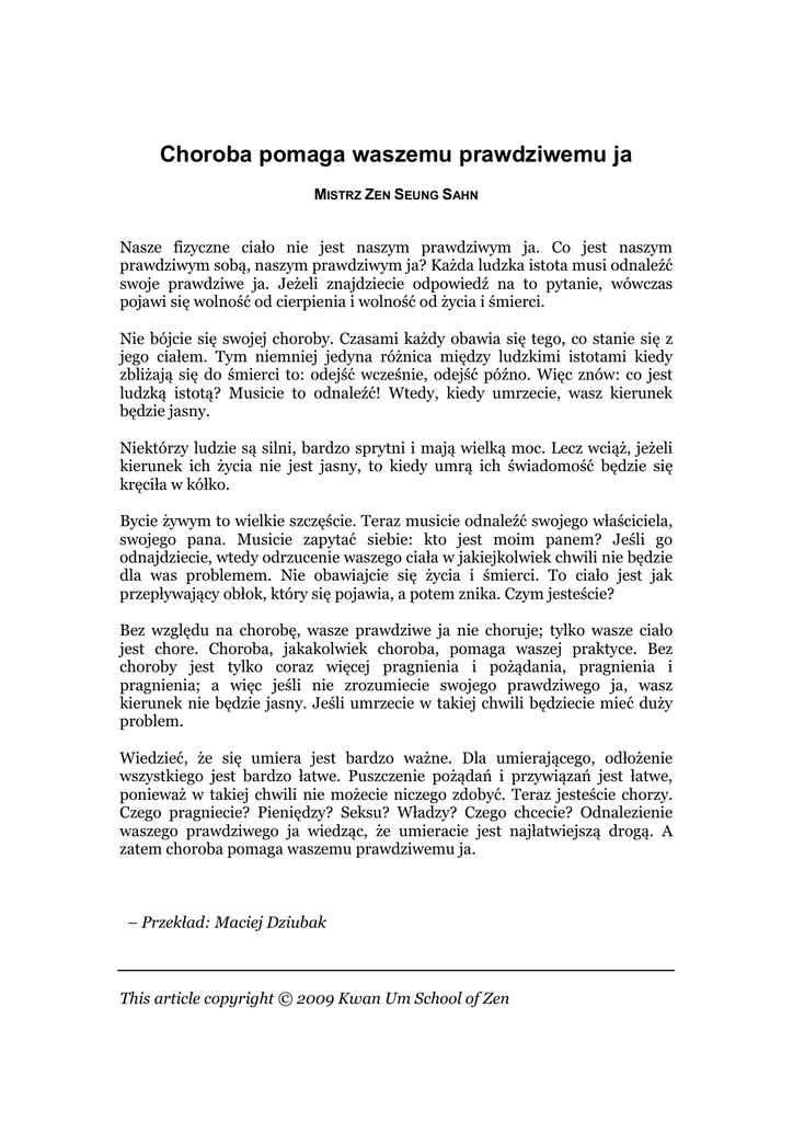 Choroba pomaga waszemu prawdziwemu ja MISTRZ ZEN SEUNG SAHN Nasze fizyczne ciało nie jest naszym prawdziwym ja. Co jest naszym prawdziwym sobą, naszym prawdziwym ja? Każda ludzka istota musi odnaleźć swoje prawdziwe ja. Jeżeli znajdziecie odpowiedź na to pytanie, wówczas pojawi się wolność od cierpienia i wolność od życia i śmierci. Nie bójcie się swojej choroby. Czasami każdy obawia się tego, co stanie się z jego ciałem. Tym niemniej jedyna różnica między ludzkimi istotami kiedy zbliżają się do śmierci to: odejść wcześnie, odejść późno. Więc znów: co jest ludzką istotą? Musicie to odnaleźć! Wtedy, kiedy umrzecie, wasz kierunek będzie jasny. Niektórzy ludzie są silni, bardzo sprytni i mają wielką moc. Lecz wciąż, jeżeli kierunek ich życia nie jest jasny, to kiedy umrą ich świadomość będzie się kręciła w kółko. Bycie żywym to wielkie szczęście. Teraz musicie odnaleźć swojego właściciela, swojego pana. Musicie zapytać siebie: kto jest moim panem? Jeśli go odnajdziecie, wtedy odrzucenie waszego ciała w jakiejkolwiek chwili nie będzie dla was problemem. Nie obawiajcie się życia i śmierci. To ciało jest jak przepływający obłok, który się pojawia, a potem znika. Czym jesteście? Bez względu na chorobę, wasze prawdziwe ja nie choruje; tylko wasze ciało jest chore. Choroba, jakakolwiek choroba, pomaga waszej praktyce. Bez choroby jest tylko coraz więcej pragnienia i pożądania, pragnienia i pragnienia; a więc jeśli nie zrozumiecie swojego prawdziwego ja, wasz kierunek nie będzie jasny. Jeśli umrzecie w takiej chwili będziecie mieć duży problem. Wiedzieć, że się umiera jest bardzo ważne. Dla umierającego, odłożenie wszystkiego jest bardzo łatwe. Puszczenie pożądań i przywiązań jest łatwe, ponieważ w takiej chwili nie możecie niczego zdobyć. Teraz jesteście chorzy. Czego pragniecie? Pieniędzy? Seksu? Władzy? Czego chcecie? Odnalezienie waszego prawdziwego ja wiedząc, że umieracie jest najłatwiejszą drogą. A zatem choroba pomaga waszemu prawdziwemu ja. – Przekład: Maciej Dziubak This article copyright © 2009 Kwan Um School of Zen