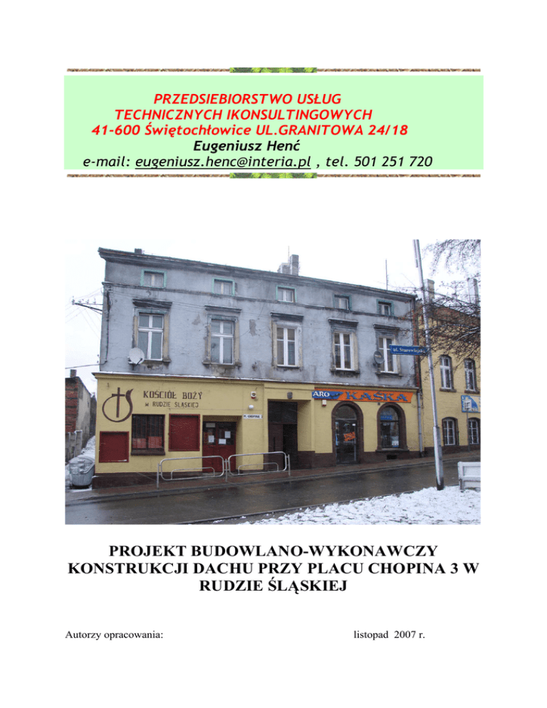 PRZEDSIEBIORSTWO USŁUG TECHNICZNYCH IKONSULTINGOWYCH 41-600 Świętochłowice UL.GRANITOWA 24/18 Eugeniusz Henć e-mail: [email protected] , tel. 501 251 720 PROJEKT BUDOWLANO-WYKONAWCZY KONSTRUKCJI DACHU PRZY PLACU CHOPINA 3 W RUDZIE ŚLĄSKIEJ Autorzy opracowania: listopad 2007 r. Zawartość dokumentacji : I Część opisowa 1. Strona tytułowa 2. Spis treści 3. Opis techniczny 4. Kserokopie uprawnień projektanta 5. Kserokopie przynaleŜności do Izby BranŜowej 6. Oświadczenie o kompletności dokumentacji 7. Obliczenia statyczne II Część graficzna 1. Plan sytuacyjny 2. Rzut parteru 3. Rzut dachu, przekrój C-C 4. Elewacje 5. Rzut więźby dachowej, podestu techn., przekroje A-A i B-B 6. Kratownice K1 i K2 7. Płatwie, belki, tęŜniki skala 1:1000 skala 1:50, 1:10 skala 1:50, 1:100 skala 1:50, 1:100 skala 1:50, 1:10 skala 1:25, 1:10 skala 1:10 OPIS TECHNICZNY 1. Podstawa opracowania: 1.1 Wizje lokalne i pomiary na obiekcie przeprowadzone przez autorów opracowania w miesiącu sierpniu 2007 r. 1.2 Zlecenie PGM w Rudzie Śląskiej. 1.3. Serwis fotograficzny wykonany w czasie wizji lokalnych. 1.4. Mapa zasadnicza i wypis z rejestru gruntów 2. Przedmiot opracowania: Przedmiotem opracowania jest wymiana konstrukcji dachu w budynku połoŜonym w Rudzie Śląskiej przy placu Chopina 3 , z powodu złego stanu technicznego istniejącej konstrukcji drewnianej dachu . Projektuje się odtworzenie dotychczasowego kształtu i nie zachodzi zmiana kubatury i elewacji budynku . 3. Opis stanu istniejącego: Budynek przy placu Chopina 3 złoŜony jest z trzech części ( segmentów ) : - budynku mieszkalnego w części frontowej jednopiętrowy z poddaszem nieuŜytkowym , - łącznika piętrowego ze stropodachem płaskim drewnianym , - budynku usługowego połoŜonego w głębi posesji podpiwniczonego przekrytego dachem dwuspadowym zawierającego salę kościelną . Trzeci segment jest w pełni podpiwniczony , parter ma wysokość około 5,0 m i rozpiętość 12 m . Nad nim znajduje się dach dwuspadowy o konstrukcji wieszarowej drewnianej. Sufit podwieszony jest do dźwigarów poprzez dwa podłuŜne podciągi . Płatwie dachu równieŜ oparto na dźwigarach . Dach jest nieocieplony . W budynku występuje szereg uszkodzeń wymagających naprawy. Zostały one omówione w odrębnym opracowaniu . NajwaŜniejszym problemem jest zły stan techniczny konstrukcji dachu . Belki i słupy ramy wewnętrznej sa spróchniałe w minimum połowie przekroju , połączenia pasów dolnych z podciągami stropu są skorodowane . Dach naleŜy bezwzględnie wzmocnić lub wymienić . Z uwagi na duŜe koszty wzmacniania istniejącej konstrukcji wieszakowej, projektuje się obecnie nowy dach o konstrukcji stalowej . Po wstępnych uzgodnieniach z Miejskim Konserwatorem Zabytków przyjęto odtworzenie kształtu dachu istniejącego i pokrycie dachowe wykonane z papy . 4. Opis ogólny projektowanych zmian : Zmiany w budynku polegają na wyburzeniu stropu poddasza i konstrukcji dachu wraz projektowanych poszyciem . W miejsce wyburzanego dachu projektuje się stalowe kratownice projektowanych profili zimnogiętych osadzone na ścianach murowanych budynku. Na pasach dolnych osadzić naleŜy belki wsporcze sufitu podwieszonego . W części środkowej przewidziano pomost roboczy i wykonanie podłogi na belkach stropowych celowo zagęszczonych projektowanych tej strefie. 5. Opis szczegółowy : 5.1. Konstrukcja dachu : Przyjęto dach płatwiowy pokryty styropapem i papą wierzchniego krycia termozgrzewalną . Łączna grubość ocieplenia wynosi 16 cm . Styropian i styropap mocować mechanicznie i kleić do blachy fałdowej powlekanej T18 . Blach mocowana jest do płatwi stalowych z ceowników zimnogiętych 160x80x5mm. Płatwie ułoŜono na czterech dźwigarach kratowych oraz ścianach szczytowych . Kratownice główne wykonać z rur zimnogiętych . Przyjęto na podstawie obliczeń statycznych pasy górny i dolny z rury zimnogiętej 80x80x5 mm, wszystkie krzyŜulce i słupki z rur zimnogiętych 50x50x5 mm. Połączenia elementów kratownicy wykonać jako spoiny doczołowe obwodowe. Kratownice mocować do ścian nośnych , za pośrednictwem blach węzłowych 8x100x240mm , kotwami rozporowymi Hilti HSA M16. Oparcie płatwi skrajnych na ścianach szczytowych przewidziano w wykutych gniazdach podporowych zabetonowanych betonem B20 po osadzeniu elementów stalowych. Kratownice stęŜyć w trzech płaszczyznach . W płaszczyźnie pionowej wykonując tęŜnik T2 pomiędzy środkowymi kratownicami . W płaszczyznach połaci tęŜniami T1 wykonanymi z pręta gładkiego ( stal St3S) o średnicy 16 mm . StęŜenie wykonać równieŜ w płaszczyźnie poziomej spodu belek nośnych sufitu w polu środkowym . StęŜenie to oznaczono jako element T3 i wykonać go w postaci skrzyŜowanych prętów φ16 ze stali St3S(gładkich ). Elementy stalowe poddasza zabezpieczyć przed korozją przed wbudowaniem poprzez malowanie dwukrotne farbą miniową 60% oraz dwukrotnie farbą ftalową ogólnego przeznaczenia . Na fragmentach spawanych na budowie nanieść powłoki po montaŜu . 5.2. Konstrukcja sufitu podwieszonego i podestu roboczego: W płaszczyźnie pasów dolnych kratownic ułoŜyć na blachach węzłowych ( el. nr 18) belki stalowe z dwuteowników 120. W strefie środkowej rozstaw belek wynosi 1,0 m , w strefach skrajnych 2,0m . Zagęszczenie belek w strefie środkowej słuŜy ułoŜeniu podłogi i wytworzeniu pomostu roboczego dla prac konserwacyjnych i instalacyjnych . Do belek mocować cięgna podtrzymujące ruszt sufitu podwieszonego . Uwaga ! Sufit podwieszony wykonać z podwójnej płyty gipsowej GKF o grubości 12,5 mm. Stanowi on jedyne zabezpieczenie przeciwpoŜarowe dachu . Wymagana odporność ogniowa wynosi 30 min. Pomost roboczy wykonać w postaci podłogi z desek o grubości 35 mm . Deski podłogowe mocować do łat drewnianych ułoŜonych na belkach stalowych , które naleŜy przykręcić do półek dwuteowników śrubami M10 co oko