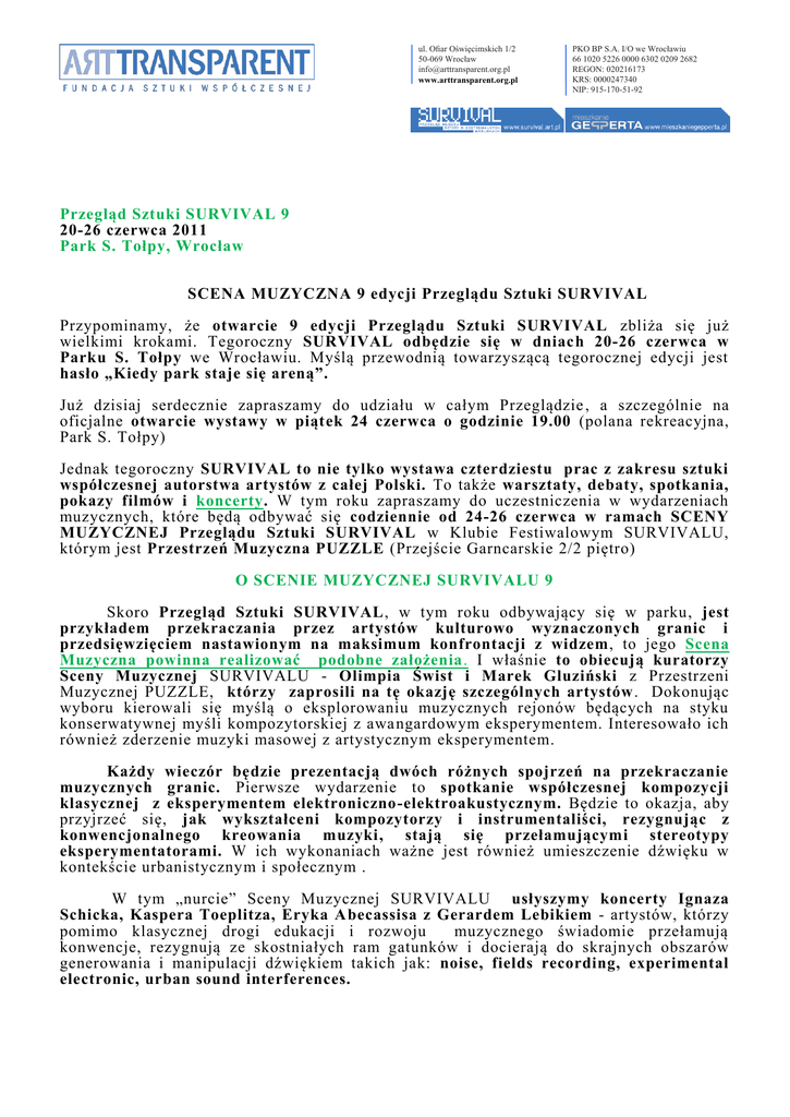 ul. Ofiar Oświęcimskich 1/2 50-069 Wrocław [email protected] www.arttransparent.org.pl PKO BP S.A. I/O we Wrocławiu 66 1020 5226 0000 6302 0209 2682 REGON: 020216173 KRS: 0000247340 NIP: 915-170-51-92 Przegląd Sztuki SURVIVAL 9 20-26 czerwca 2011 Park S. Tołpy, Wrocław SCENA MUZYCZNA 9 edycji Przeglądu Sztuki SURVIVAL Przypominamy, że otwarcie 9 edycji Przeglądu Sztuki SURVIVAL zbliża się już wielkimi krokami. Tegoroczny SURVIVAL odbędzie się w dniach 20-26 czerwca w Parku S. Tołpy we Wrocławiu. Myślą przewodnią towarzyszącą tegorocznej edycji jest hasło „Kiedy park staje się areną”. Już dzisiaj serdecznie zapraszamy do udziału w całym Przeglądzie , a szczególnie na oficjalne otwarcie wystawy w piątek 24 czerwca o godzinie 19.00 (polana rekreacyjna, Park S. Tołpy) Jednak tegoroczny SURVIVAL to nie tylko wystawa czterdziestu prac z zakresu sztuki współczesnej autorstwa artystów z całej Polski. To także warsztaty, debaty, spotkania, pokazy filmów i koncerty. W tym roku zapraszamy do uczestniczenia w wydarzeniach muzycznych, które będą odbywać się codziennie od 24-26 czerwca w ramach SCENY MUZYCZNEJ Przeglądu Sztuki SURVIVAL w Klubie Festiwalowym SURVIVALU, którym jest Przestrzeń Muzyczna PUZZLE (Przejście Garncarskie 2/2 piętro) O SCENIE MUZYCZNEJ SURVIVALU 9 Skoro Przegląd Sztuki SURVIVAL, w tym roku odbywający się w parku, jest przykładem przekraczania przez artystów kulturowo wyznaczonych granic i przedsięwzięciem nastawionym na maksimum konfrontacji z widzem, to jego Scena Muzyczna powinna realizować podobne założenia. I właśnie to obiecują kuratorzy Sceny Muzycznej SURVIVALU - Olimpia Świst i Marek Gluziński z Przestrzeni Muzycznej PUZZLE, którzy zaprosili na tę okazję szczególnych artystów. Dokonując wyboru kierowali się myślą o eksplorowaniu muzycznych rejonów będących na styku konserwatywnej myśli kompozytorskiej z awa ngardowym eksperymentem. Interesowało ich również zderzenie muzyki masowej z artystycznym eksperymentem. Każdy wieczór będzie prezentacją dwóch różnych spojrzeń na przekraczanie muzycznych granic. Pierwsze wydarzenie to spotkanie współczesnej kompozycji klasycznej z eksperymentem elektroniczno-elektroakustycznym. Będzie to okazja, aby przyjrzeć się, jak wykształceni kompozytorzy i instrumentaliści, rezygnując z konwencjonalnego kreowania muzyki, stają się przełamującymi stereotypy eksperymentatorami. W ich wykonaniach ważne jest również umieszczenie dźwięku w kontekście urbanistycznym i społecznym . W tym „nurcie” Sceny Muzycznej SURVIVALU usłyszymy koncerty Ignaza Schicka, Kaspera Toeplitza, Eryka Abecassisa z Gerardem Lebikiem - artystów, którzy pomimo klasycznej drogi edukacji i rozwoju muzycznego świadomie przełamują konwencje, rezygnują ze skostniałych ram gatunków i docierają do skrajnych obszarów generowania i manipulacji dźwiękiem takich jak: noise, fields recording, experimental electronic, urban sound interferences. ul. Ofiar Oświęcimskich 1/2 50-069 Wrocław [email protected] www.arttransparent.org.pl PKO BP S.A. I/O we Wrocławiu 66 1020 5226 0000 6302 0209 2682 REGON: 020216173 KRS: 0000247340 NIP: 915-170-51-92 Drugim wydarzeniem każdego wieczoru będzie zderzenie muzyki rozrywkowej, należącej do kanonu popkultury z muzyką awangardową i eksperymentalną. To będzie zaskakujące zetknięcie awangardowych artystów , którzy w swoich występach flirtują z muzyką popularną. Zespoły: Niwea, Tryp oraz muzycy: Przemysław Etamski i Paul White z powodzeniem funkcjonują w tej właśnie niszy zachowując swój indywidualny charakter. Genezą ich flirtu z muzyką rozrywkową są brzmienia, akordy, dźwięki i sample. P osługują się nimi świadomie i z premedytacją, tworząc konstrukcje wykraczające poza wszystkie te elementy. Więcej informacji o artystach występujących w ramach Sceny Muzycznej Przeglądu Sztuki SURVIVAL znajdziecie Państwo w osobnym załączniku pt. Artyści Sceny Muzycznej 9 edycja Przeglądu Sztuki SURVIVAL odbywa się pod HONOROWYM PATRONATEM: Ministra Kultury i Dziedzictwa Narodowego, Pana Bogdana Zdrojewskiego, Prezydent Miasta Wrocławia, Pana Rafała Dutkiewicza Marszałka Województwa Dolnośląskiego, Pana Rafał Jurkowlańca JM Rektora Akademii Sztuk Pięknych we Wrocławiu, Prof. Jaceka Szewczyka Kontakt dla mediów: Aleksandra Konopko 721 256 949 Karolina Smerek 693 486 167 [email protected] www.survival.art.pl ul. Ofiar Oświęcimskich 1/2 50-069 Wrocław [email protected] www.arttransparent.org.pl PKO BP S.A. I/O we Wrocławiu 66 1020 5226 0000 6302 0209 2682 REGON: 020216173 KRS: 0000247340 NIP: 915-170-51-92 ul. Ofiar Oświęcimskich 1/2 50-069 Wrocław [email protected] www.arttransparent.org.pl PKO BP S.A. I/O we Wrocławiu 66 1020 5226 0000 6302 0209 2682 REGON: 020216173 KRS: 0000247340 NIP: 915-170-51-92