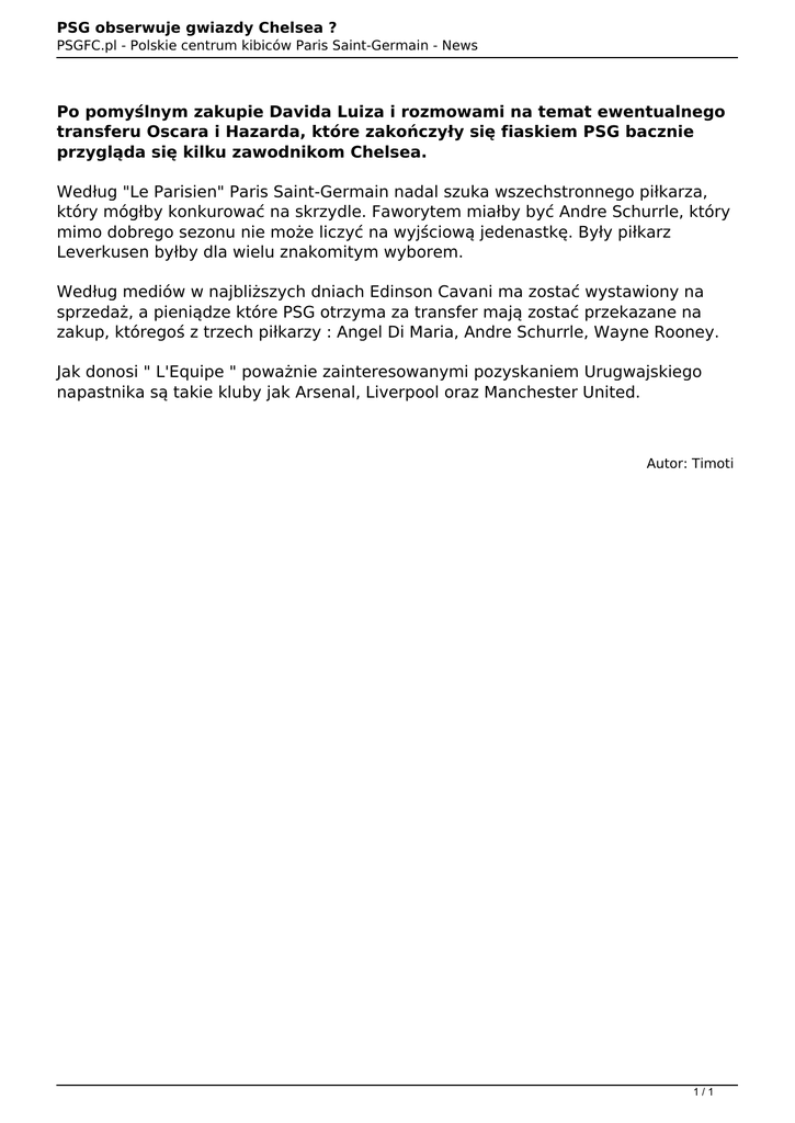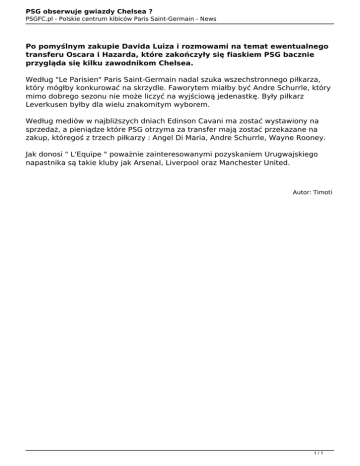 PSG obserwuje gwiazdy Chelsea ? PSGFC.pl - Polskie centrum kibiców Paris Saint-Germain - News Po pomyślnym zakupie Davida Luiza i rozmowami na temat ewentualnego transferu Oscara i Hazarda, które zakończyły się fiaskiem PSG bacznie przygląda się kilku zawodnikom Chelsea. Według "Le Parisien" Paris Saint-Germain nadal szuka wszechstronnego piłkarza, który mógłby konkurować na skrzydle. Faworytem miałby być Andre Schurrle, który mimo dobrego sezonu nie może liczyć na wyjściową jedenastkę. Były piłkarz Leverkusen byłby dla wielu znakomitym wyborem. Według mediów w najbliższych dniach Edinson Cavani ma zostać wystawiony na sprzedaż, a pieniądze które PSG otrzyma za transfer mają zostać przekazane na zakup, któregoś z trzech piłkarzy : Angel Di Maria, Andre Schurrle, Wayne Rooney. Jak donosi " L'Equipe " poważnie zainteresowanymi pozyskaniem Urugwajskiego napastnika są takie kluby jak Arsenal, Liverpool oraz Manchester United. Autor: Timoti 1/1 Powered by TCPDF (www.tcpdf.org)
