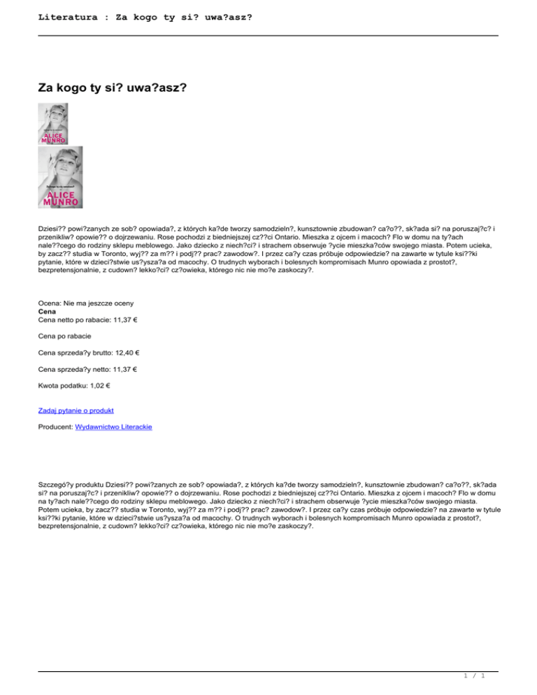 Literatura : Za kogo ty si? uwa?asz? Za kogo ty si? uwa?asz? Dziesi?? powi?zanych ze sob? opowiada?, z których ka?de tworzy samodzieln?, kunsztownie zbudowan? ca?o??, sk?ada si? na poruszaj?c? i przenikliw? opowie?? o dojrzewaniu. Rose pochodzi z biedniejszej cz??ci Ontario. Mieszka z ojcem i macoch? Flo w domu na ty?ach nale??cego do rodziny sklepu meblowego. Jako dziecko z niech?ci? i strachem obserwuje ?ycie mieszka?ców swojego miasta. Potem ucieka, by zacz?? studia w Toronto, wyj?? za m?? i podj?? prac? zawodow?. I przez ca?y czas próbuje odpowiedzie? na zawarte w tytule ksi??ki pytanie, które w dzieci?stwie us?ysza?a od macochy. O trudnych wyborach i bolesnych kompromisach Munro opowiada z prostot?, bezpretensjonalnie, z cudown? lekko?ci? cz?owieka, którego nic nie mo?e zaskoczy?. Ocena: Nie ma jeszcze oceny Cena Cena netto po rabacie: 11,37 € Cena po rabacie Cena sprzeda?y brutto: 12,40 € Cena sprzeda?y netto: 11,37 € Kwota podatku: 1,02 € Zadaj pytanie o produkt Producent: Wydawnictwo Literackie Szczegó?y produktu Dziesi?? powi?zanych ze sob? opowiada?, z których ka?de tworzy samodzieln?, kunsztownie zbudowan? ca?o??, sk?ada si? na poruszaj?c? i przenikliw? opowie?? o dojrzewaniu. Rose pochodzi z biedniejszej cz??ci Ontario. Mieszka z ojcem i macoch? Flo w domu na ty?ach nale??cego do rodziny sklepu meblowego. Jako dziecko z niech?ci? i strachem obserwuje ?ycie mieszka?ców swojego miasta. Potem ucieka, by zacz?? studia w Toronto, wyj?? za m?? i podj?? prac? zawodow?. I przez ca?y czas próbuje odpowiedzie? na zawarte w tytule ksi??ki pytanie, które w dzieci?stwie us?ysza?a od macochy. O trudnych wyborach i bolesnych kompromisach Munro opowiada z prostot?, bezpretensjonalnie, z cudown? lekko?ci? cz?owieka, którego nic nie mo?e zaskoczy?. 1 / 1 Powered by TCPDF (www.tcpdf.org)